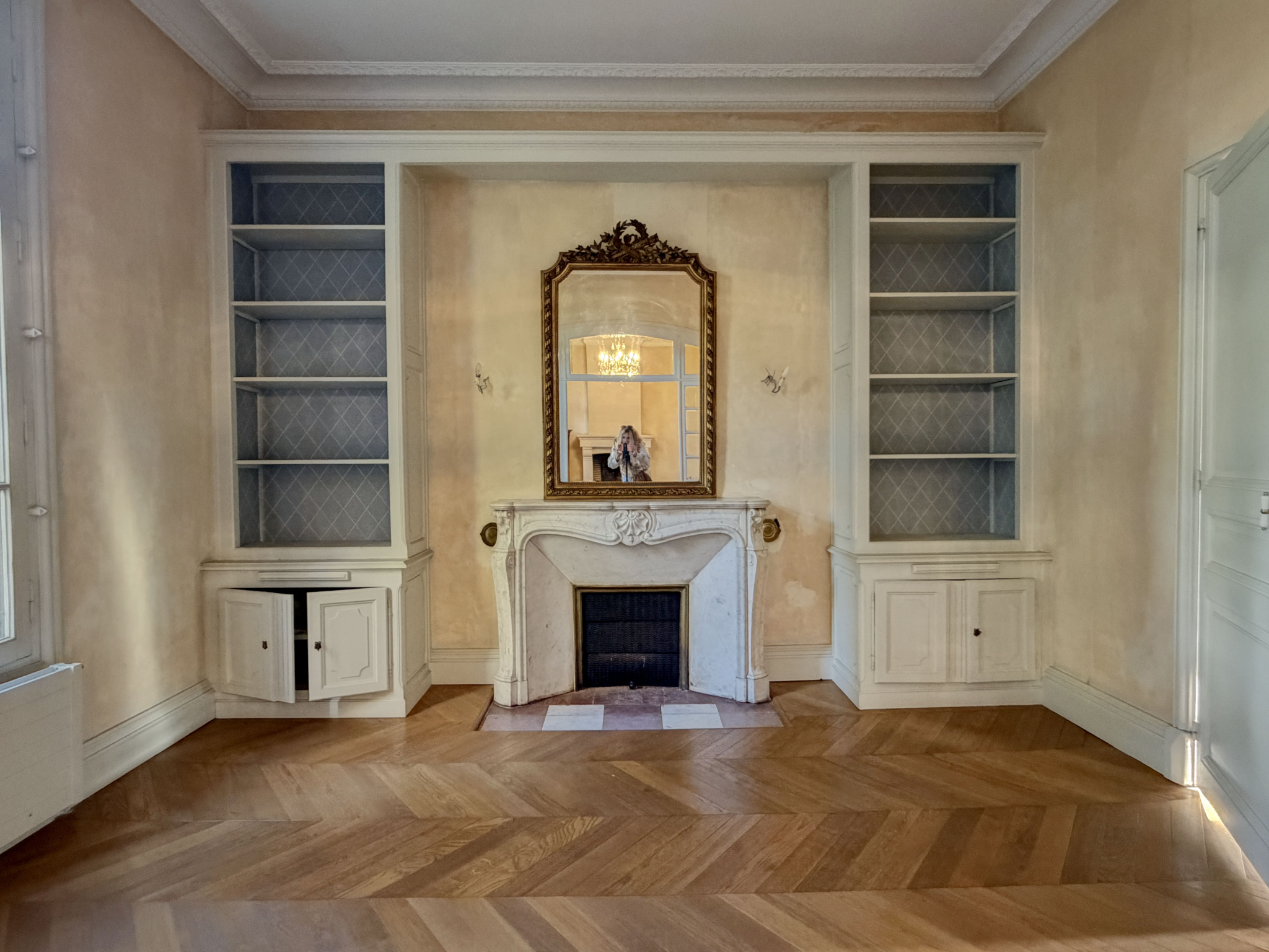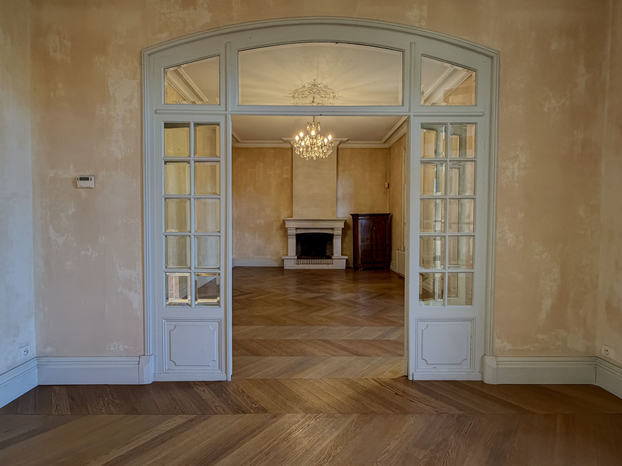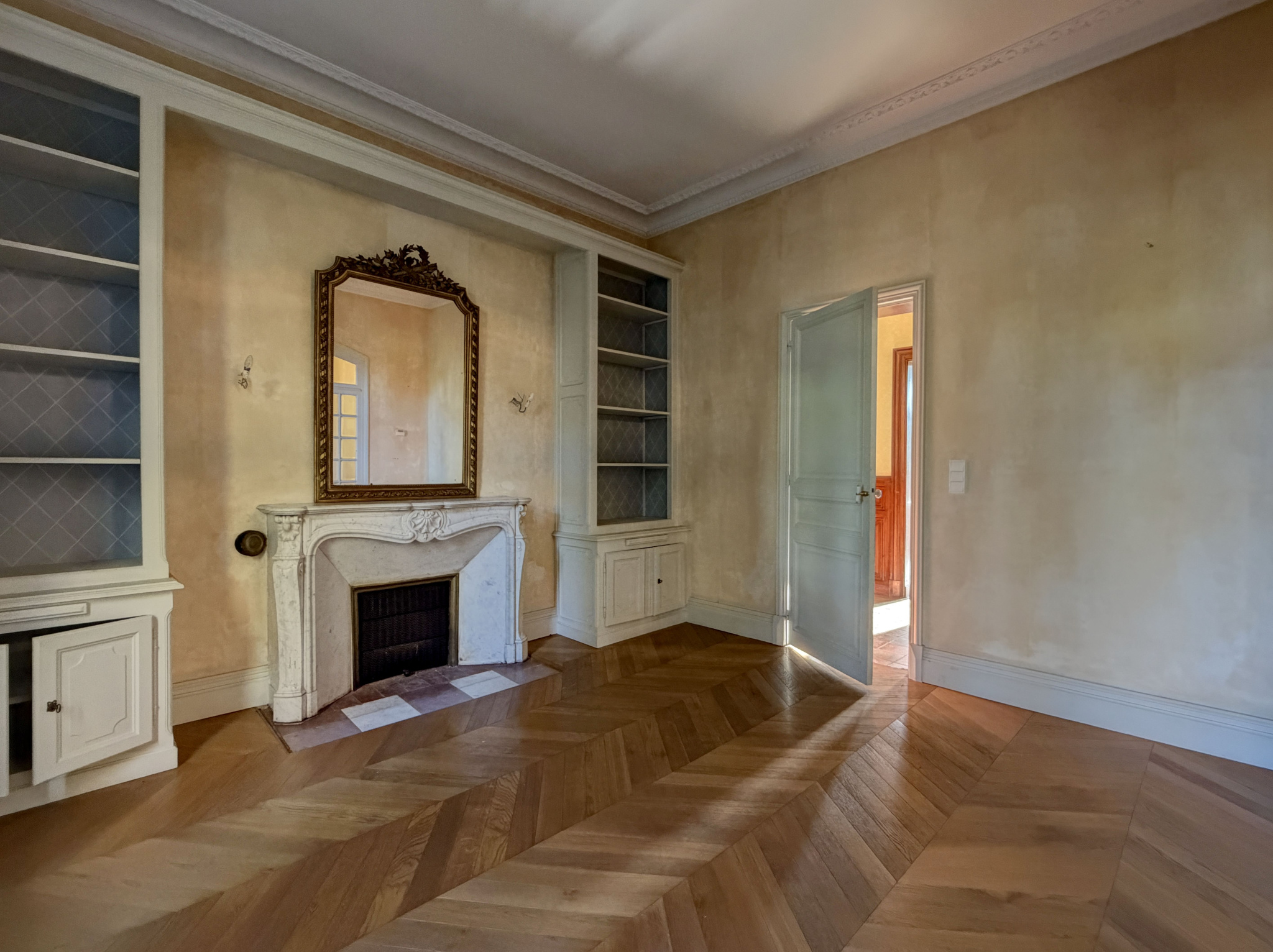Dans les pièces de vie de plus de 47m² , les superbes parquets en chevron soulignent la noblesse des volumes. Le salon dispose d’une cheminée ancienne, tout comme la salle à manger, apportant une atmosphère chaleureuse et raffinée.
