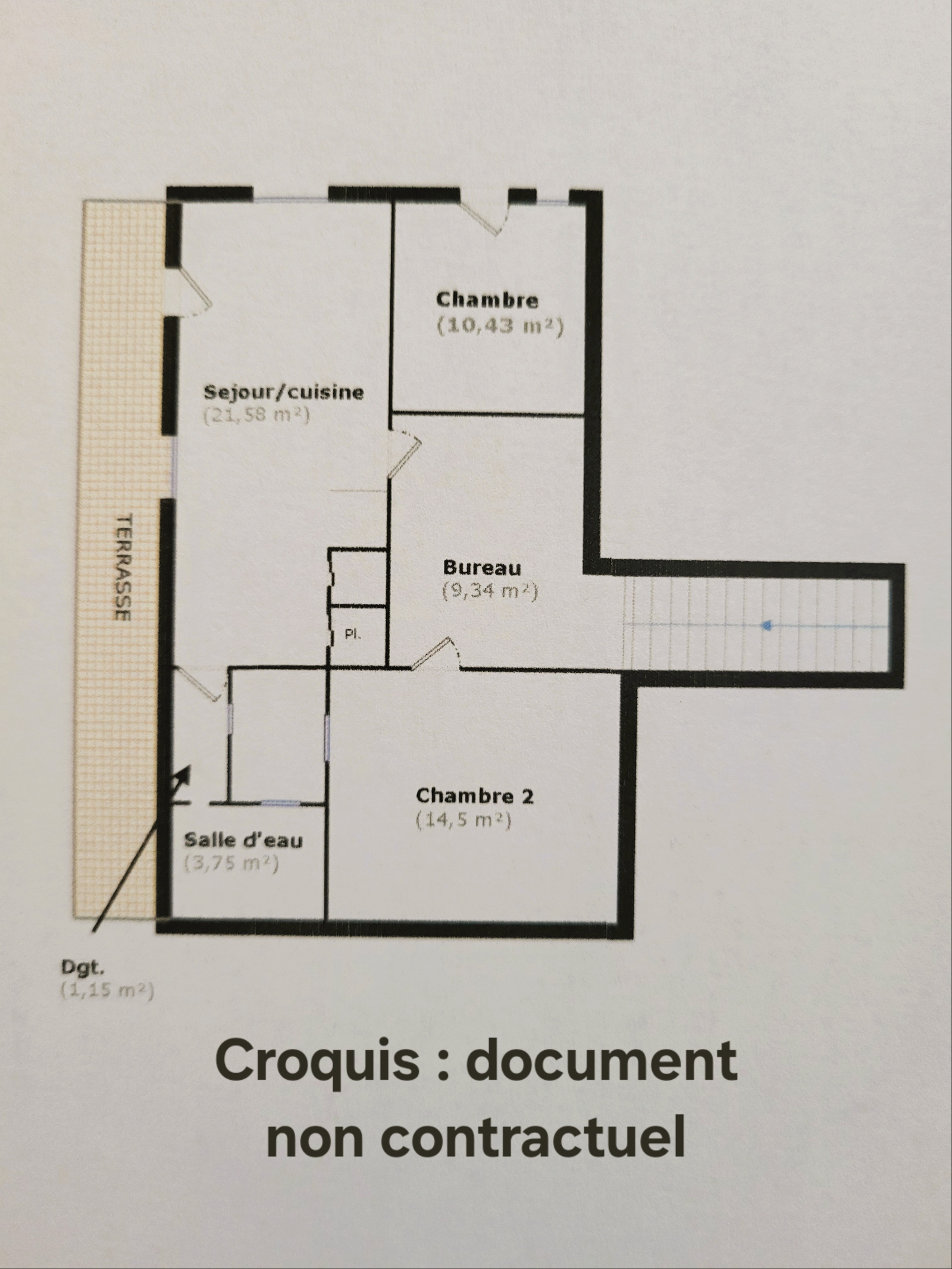 Appartement calme et lumineux situé à l’arrière comprenant une pièce de vie avec cuisine ouverte (21.58 m2) deux chambres (10.43 m2 et 14.5 m2) une pièce bureau ou chambre d’appoint (9.34 m2) une salle d’eau avec WC.