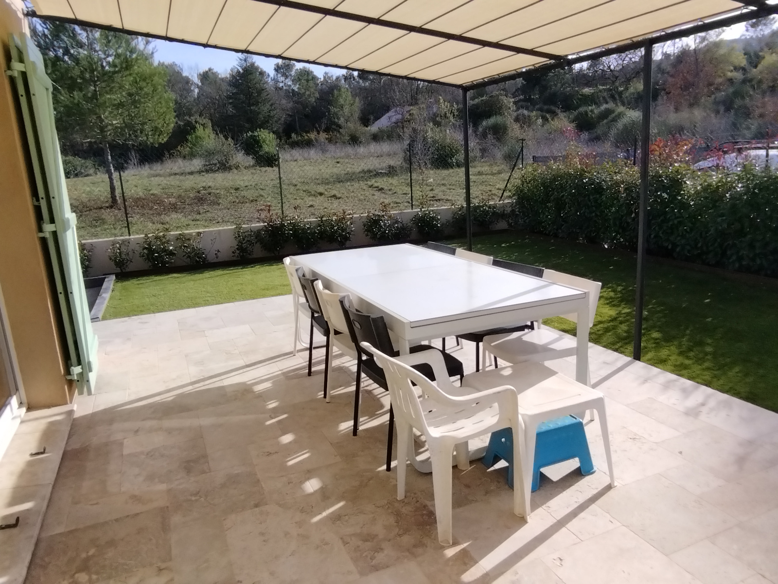Terrasse avec pergola, jeu de boules.