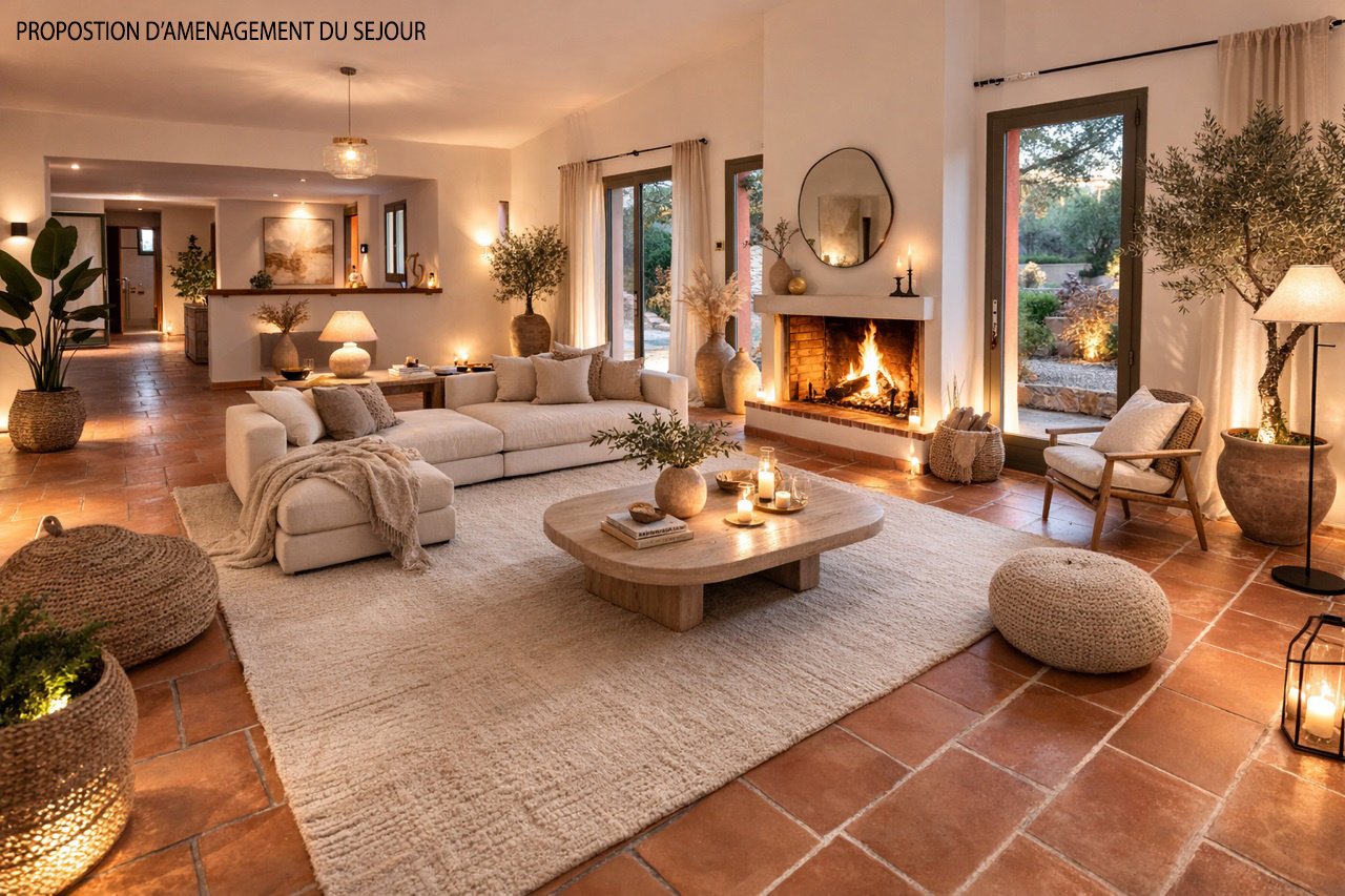 Espace de vie de 60m² environ comprenant séjour cheminée de 38,8m², cuisine ouverte aménagée équipée.