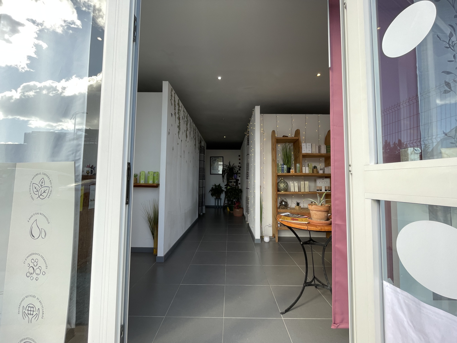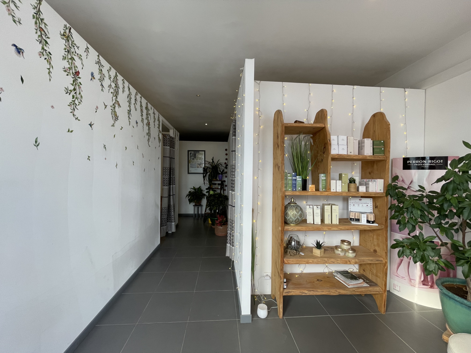 Pour commencer une magnifique vitrine présente le magasin, ce local est baigné de lumière. Réparti en 4 cabines de soins, massage, épilation, sauna infrarouge, douche... Un belle et grande entrée aménagée en espace onglerie complète l'activité.