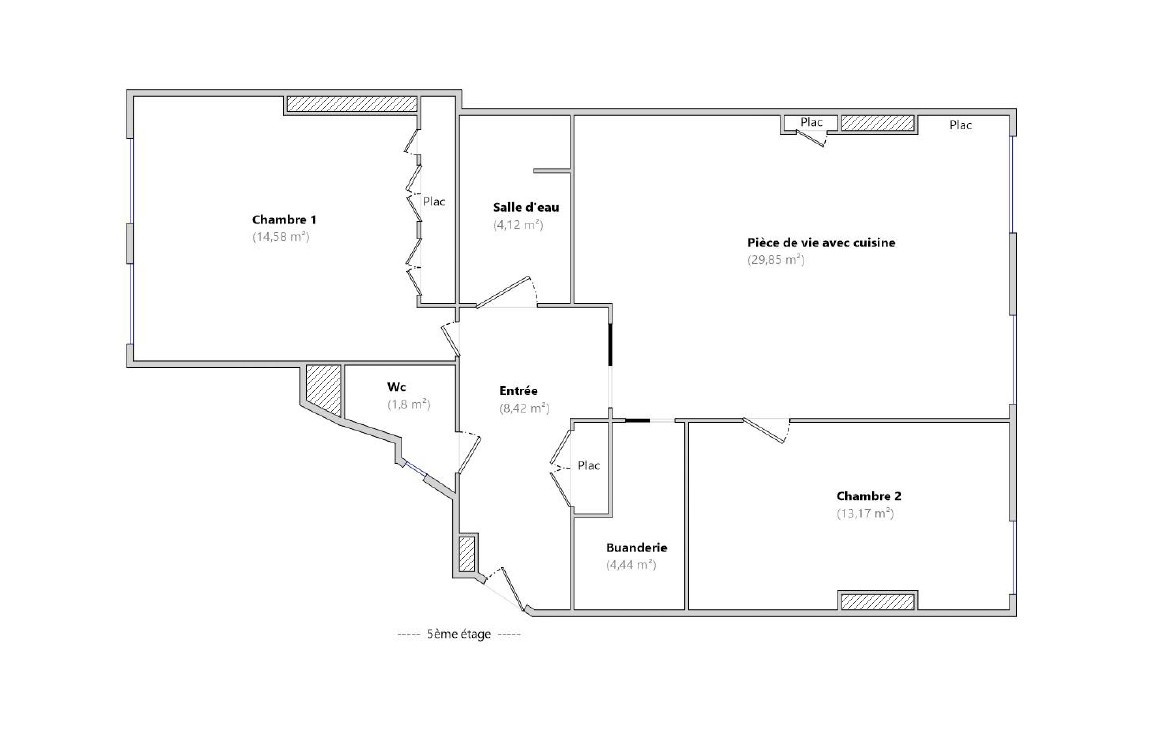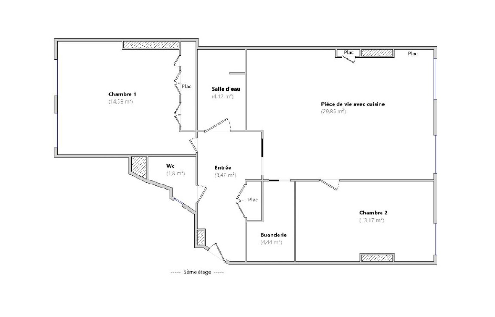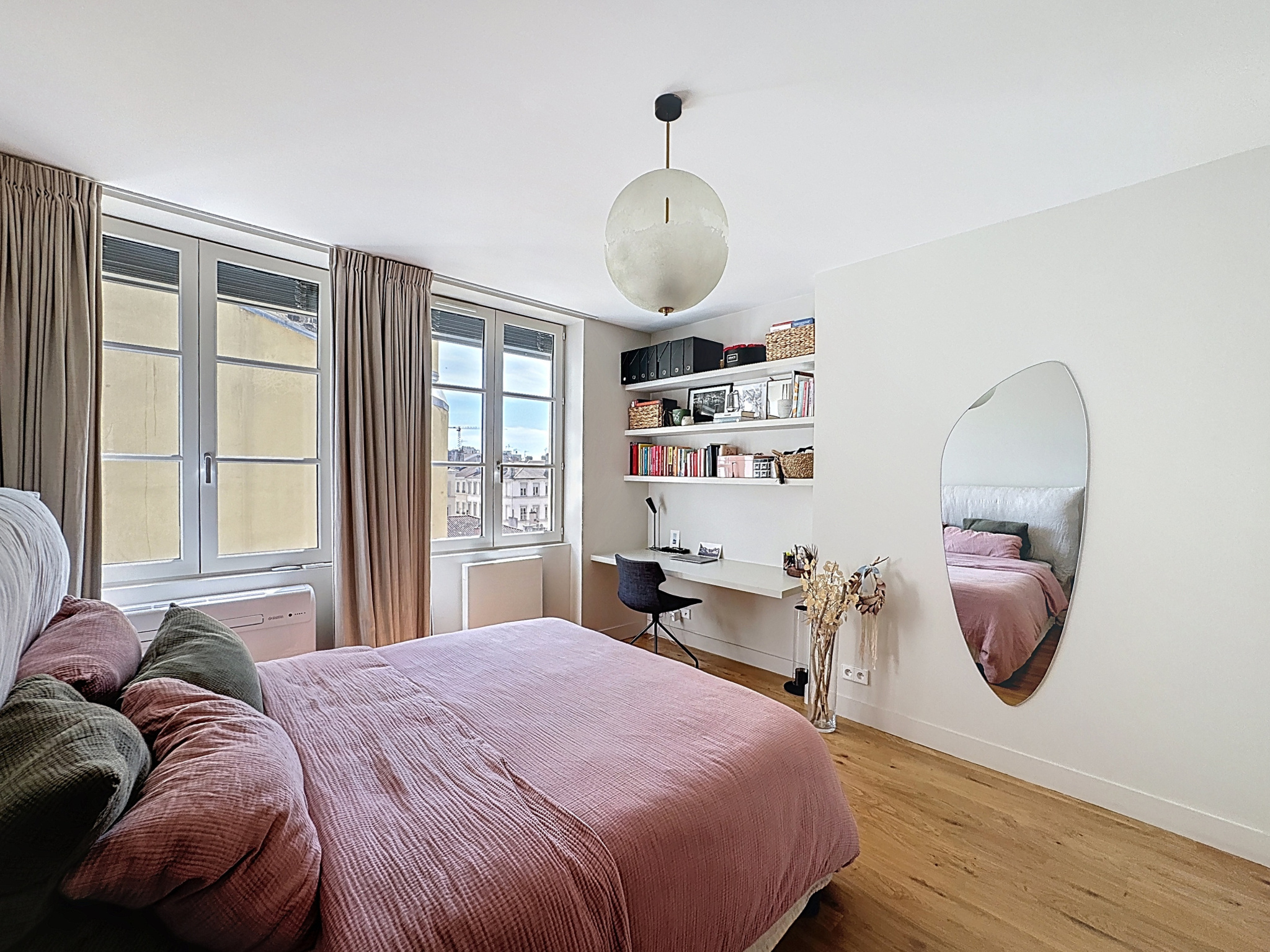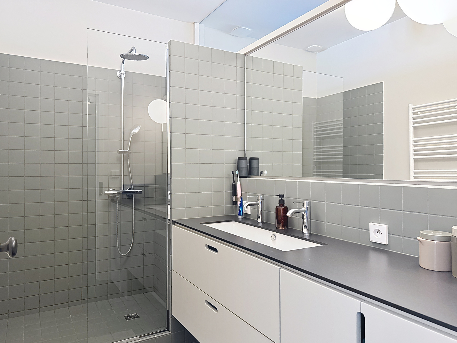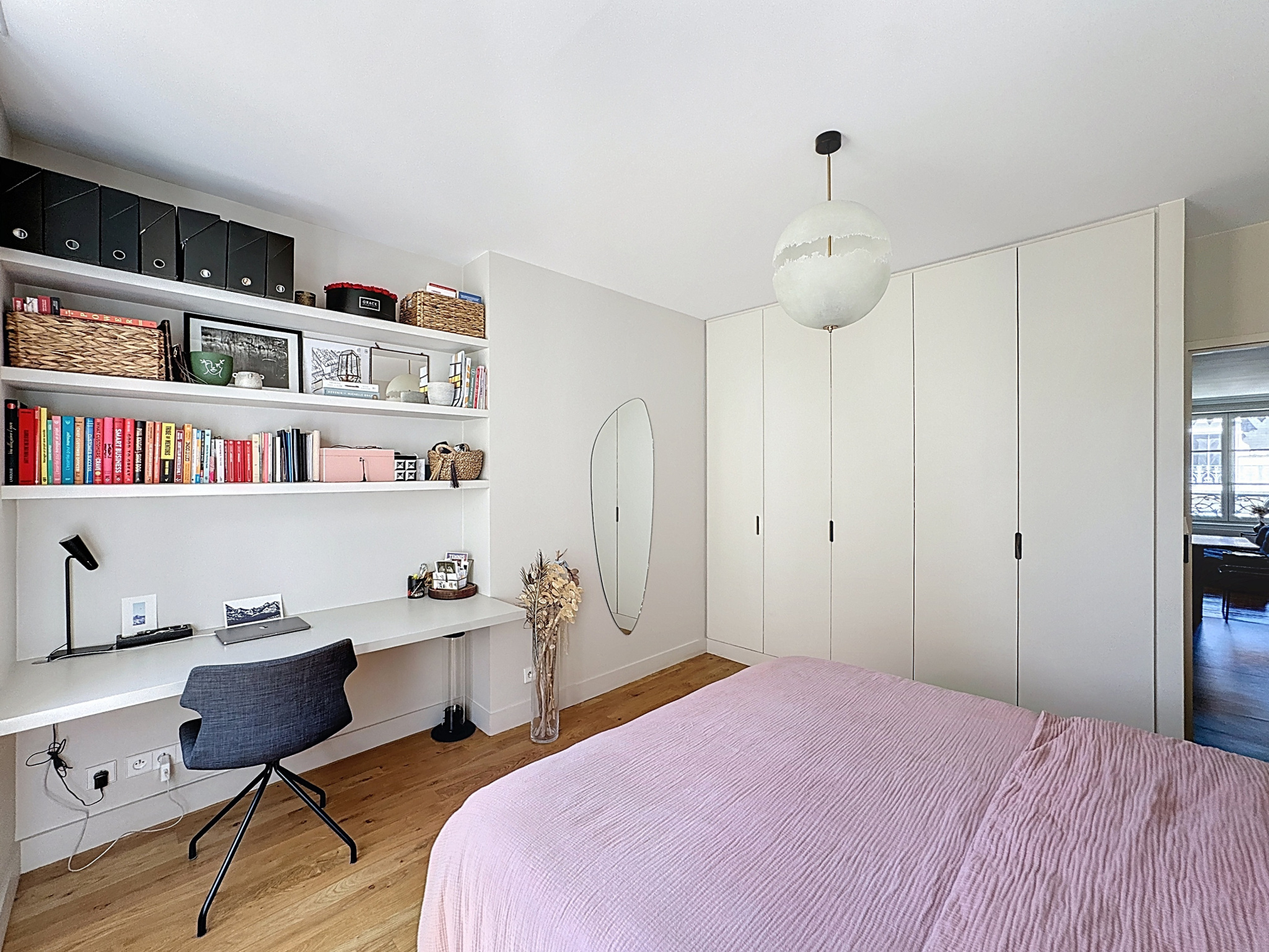 Traversant Sud/Nord, l’appartement offre deux chambres confortables de 13 m² et 14,58 m², toutes deux avec placards aménagés. L’une d’elles dispose en plus d’un coin bureau astucieusement aménagé, idéal pour le télétravail. La buanderie indépendante de plus de 4 m², rare et précieuse, complète parfaitement l’espace de vie. La salle d’eau avec sa douche à l’italienne est confortable et moderne, tandis que les toilettes sont séparées pour plus de confort.