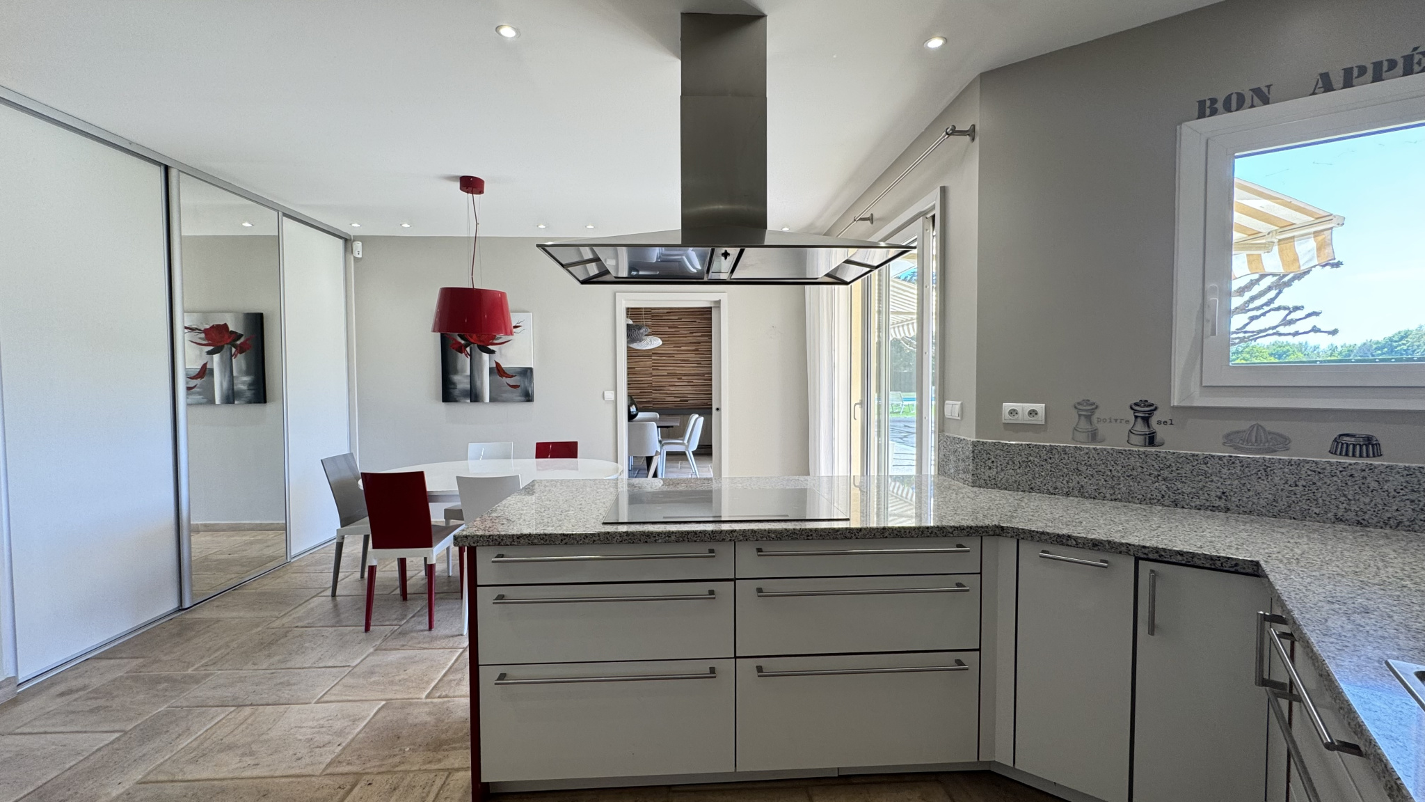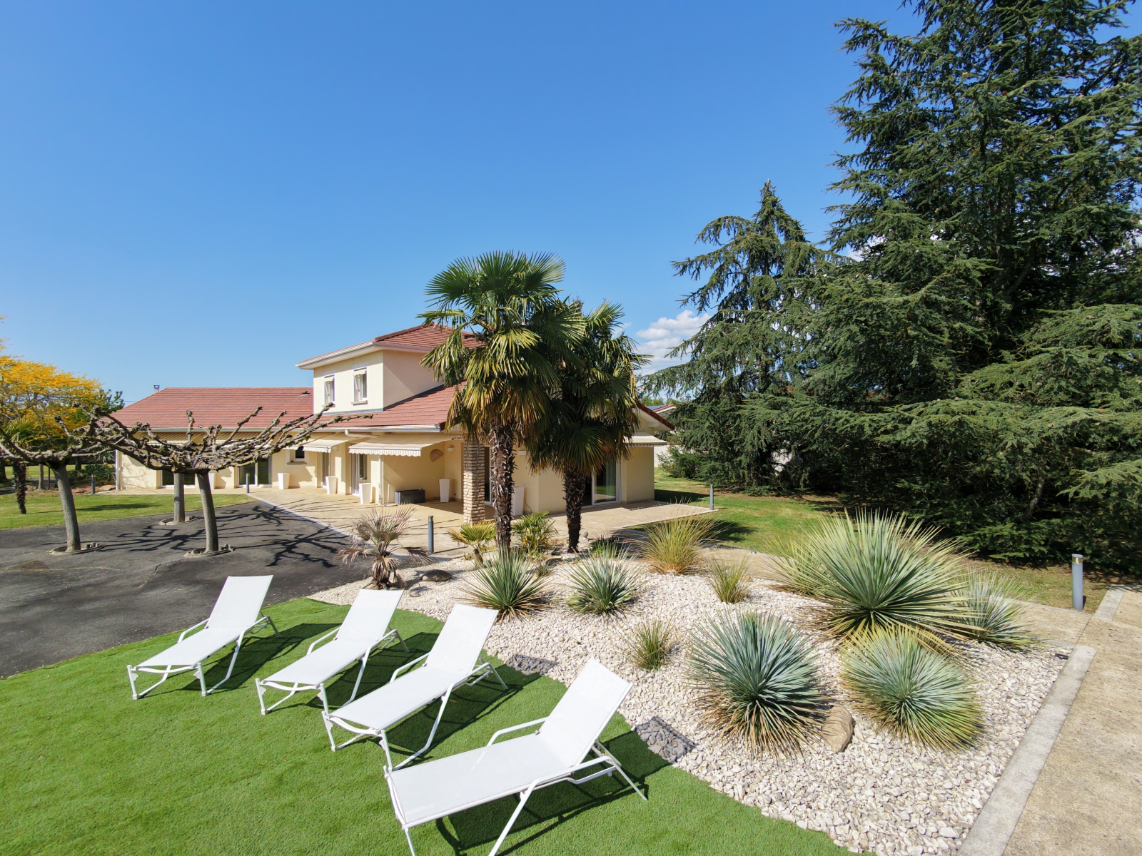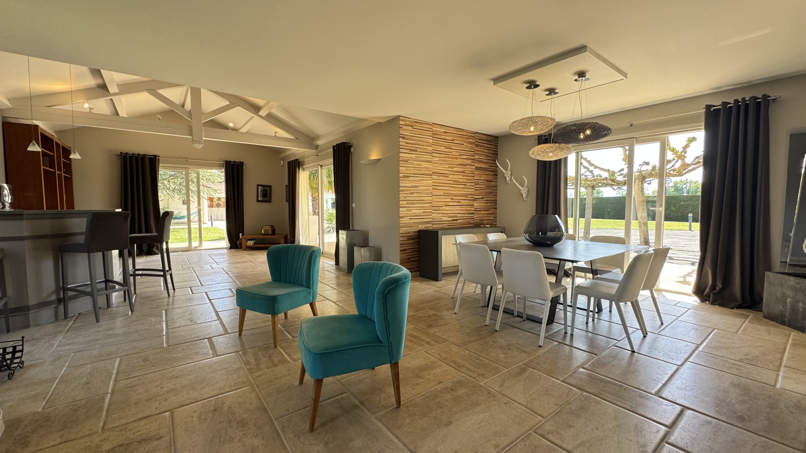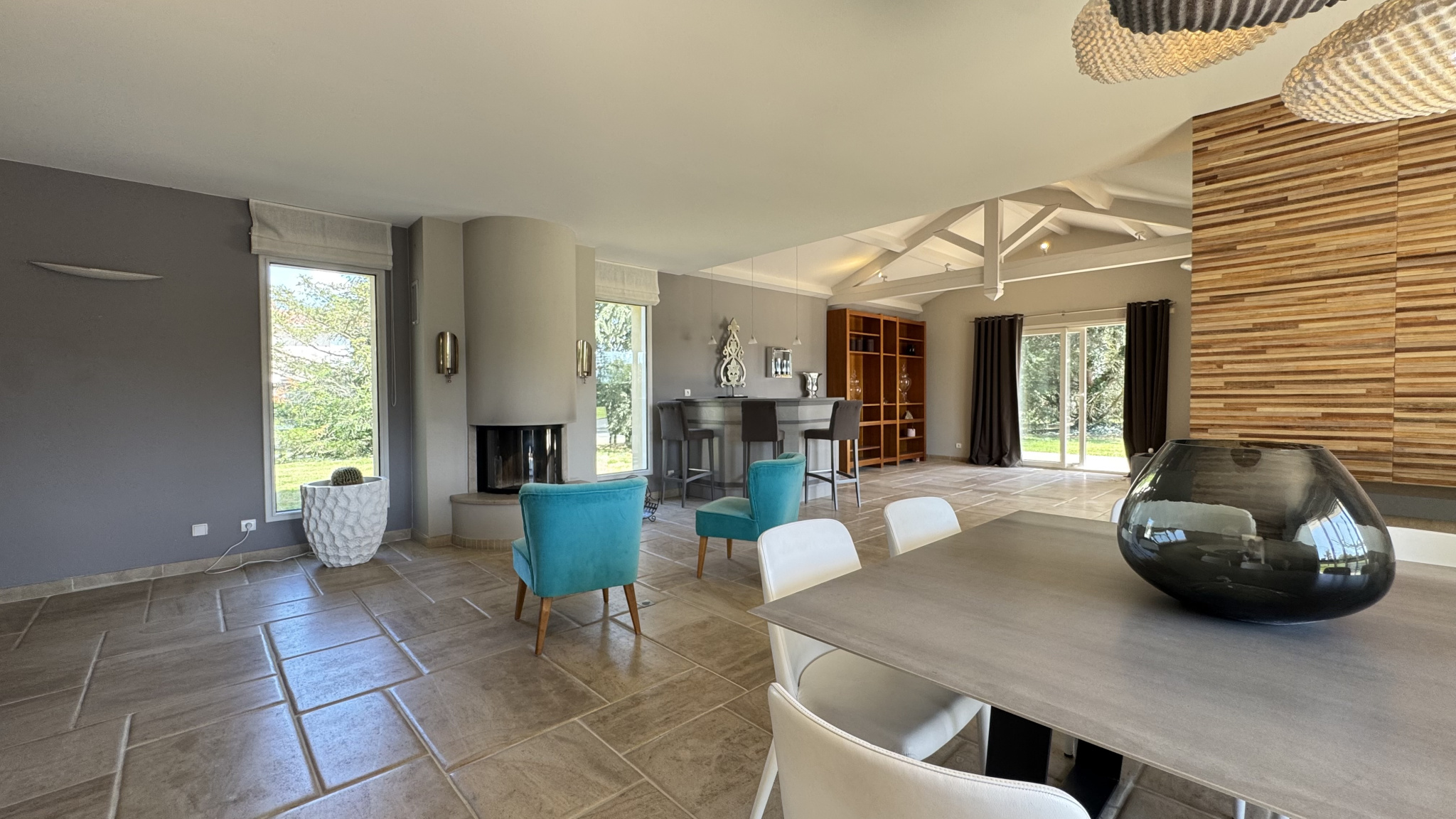 Maison contemporaine de 239m2 située sur une belle parcelle de terrain clos et arboré avec piscine et pool house. Celle-ci se compose d'un hall d'entrée donnant sur une grande pièce de vie avec cheminée et accès terrasse, cuisine aménagée attenante, bureau et un espace nuit parentale avec un vaste dressing et salle de bain, baignoire et douche. wc. En partie supérieure de la maison, 2 chambres avec chacune un dressing et une salle d'eau privative. wc. Cellier et garage ainsi qu'une pièce en mezzanine. L'ensemble bien entretenue; chauffage par le sol. En extérieur, un ensemble de 4 gragae et un carport. Une belle piscine avec son pool house équipé, terrain de pétanque. DPE C 168 GES D 35. Contact: 0781025567