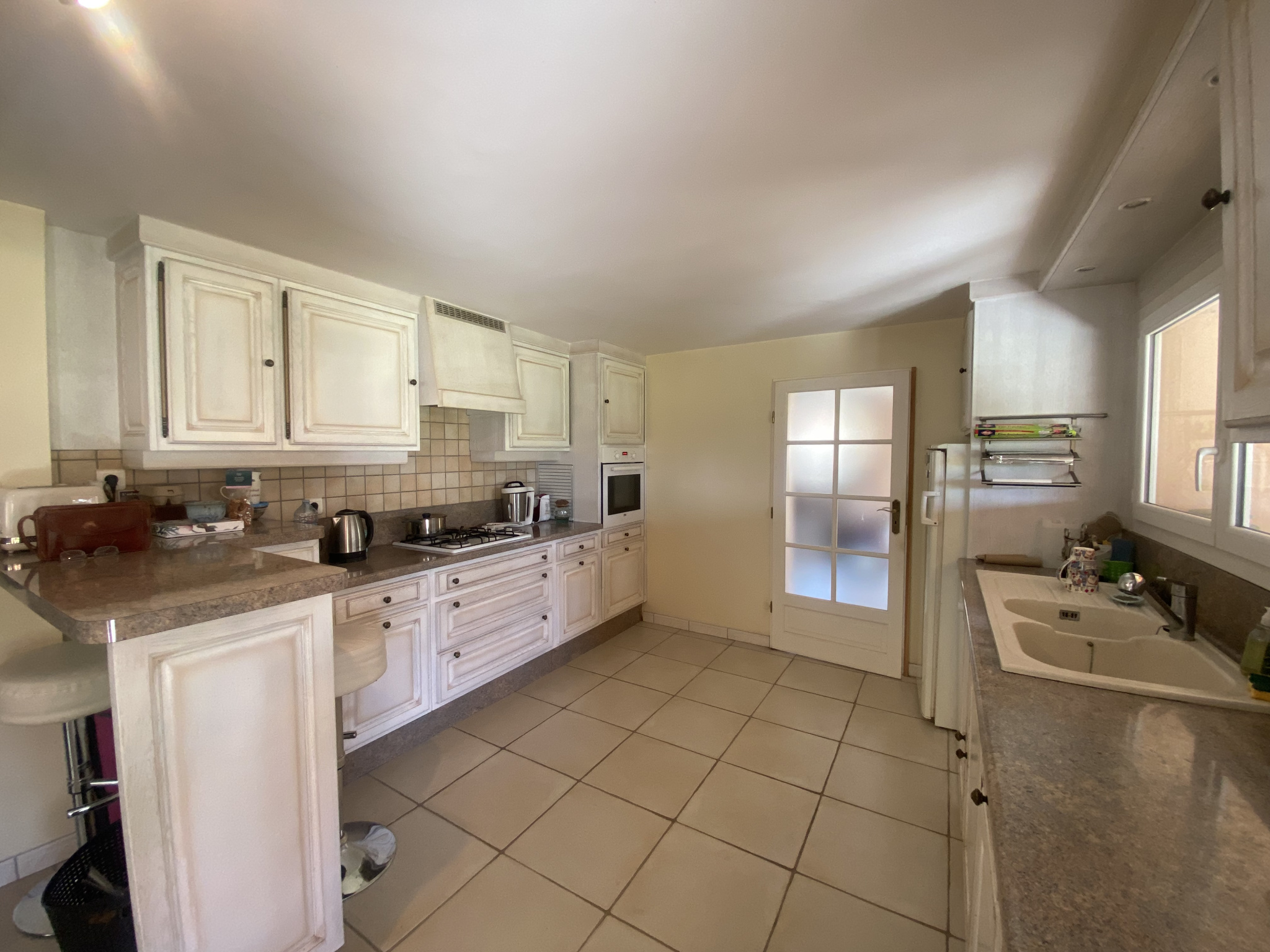 -Cuisine équipée fermée, fonctionnelle et conviviale avec poêle à bois.
