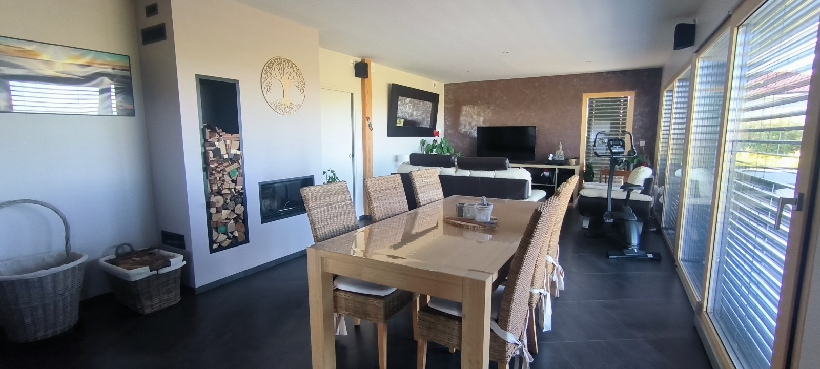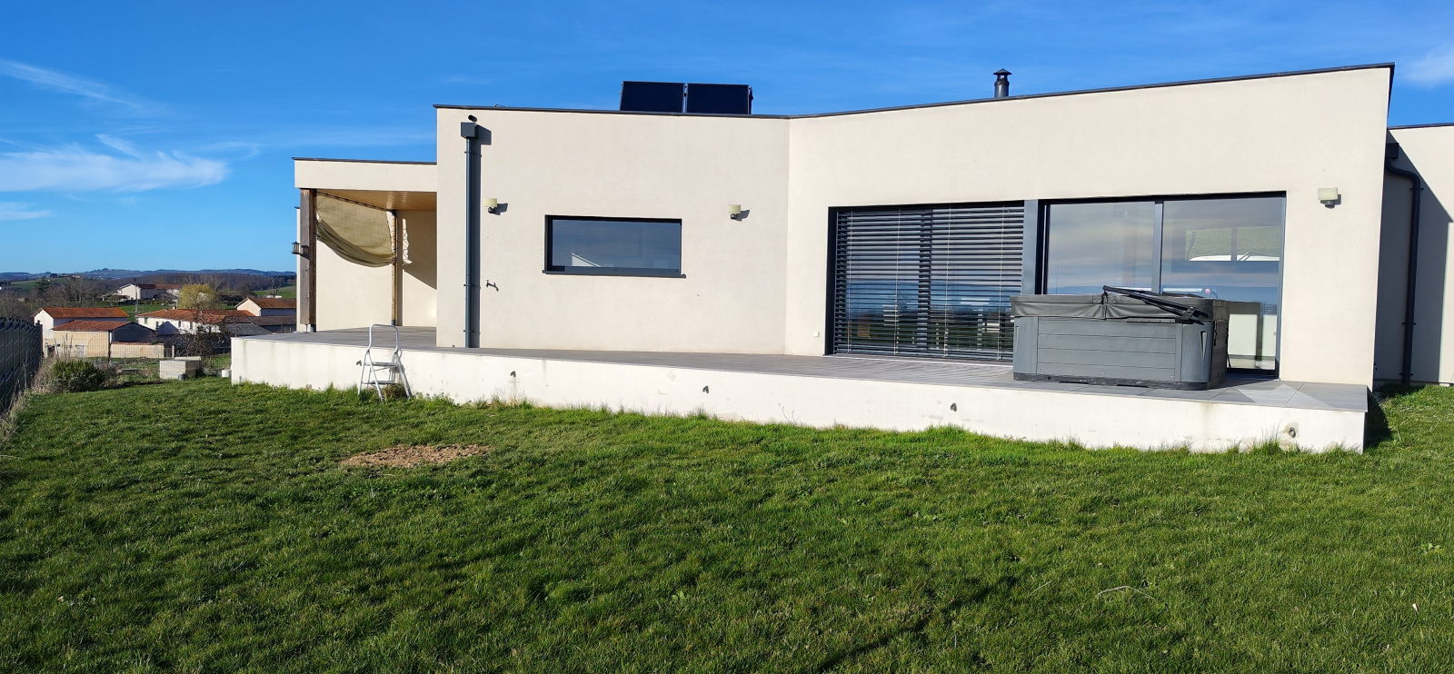 Très lumineuse, la maison s’ouvre largement sur une magnifique terrasse de 70 m², sans vis-à -vis, permettant de profiter pleinement d’une vue dégagée sur les monts du Forez et de magnifiques couchés de soleil.