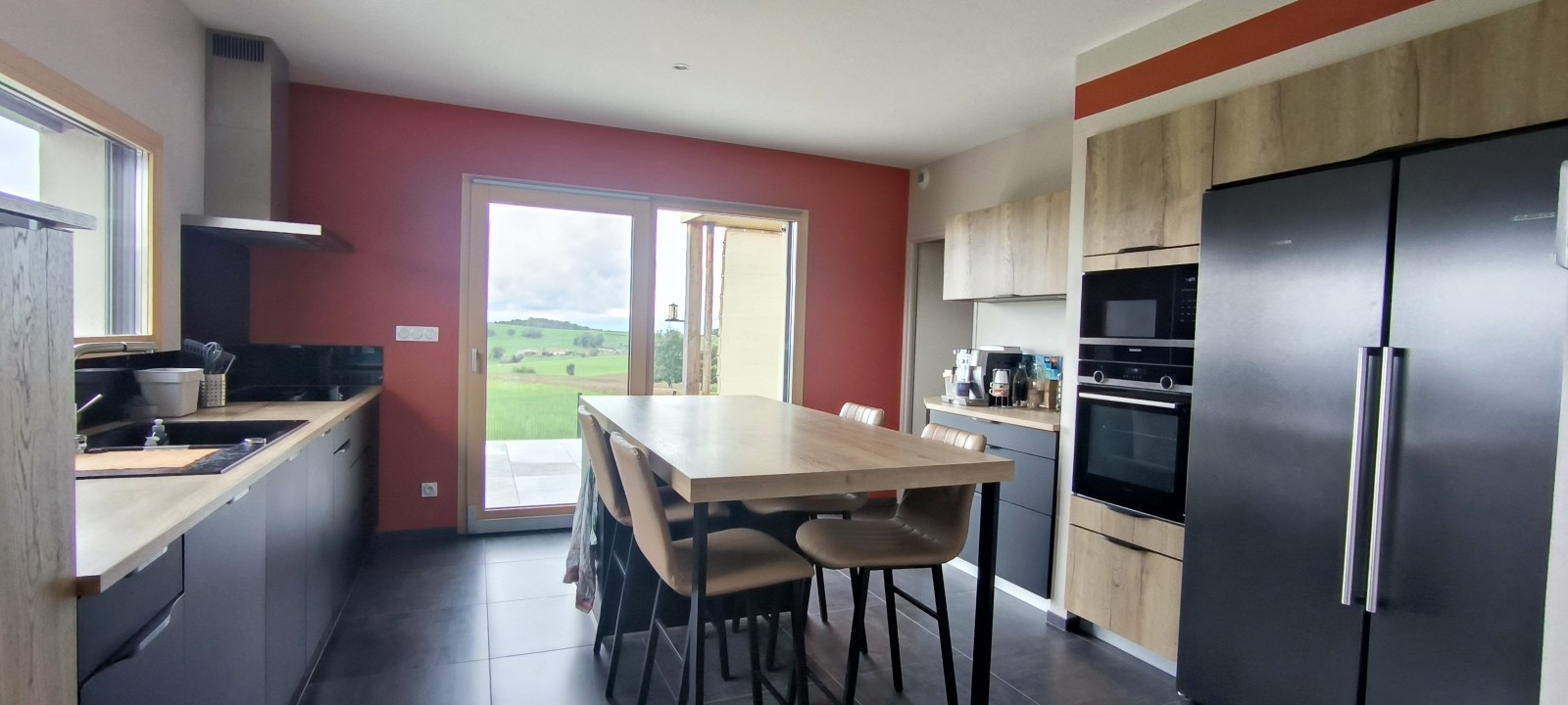 La pièce de vie spacieuse et conviviale accueille une cuisine aménagée avec îlot central, ouverte sur l’extérieur pour une parfaite continuité entre les espaces intérieurs et la terrasse.
