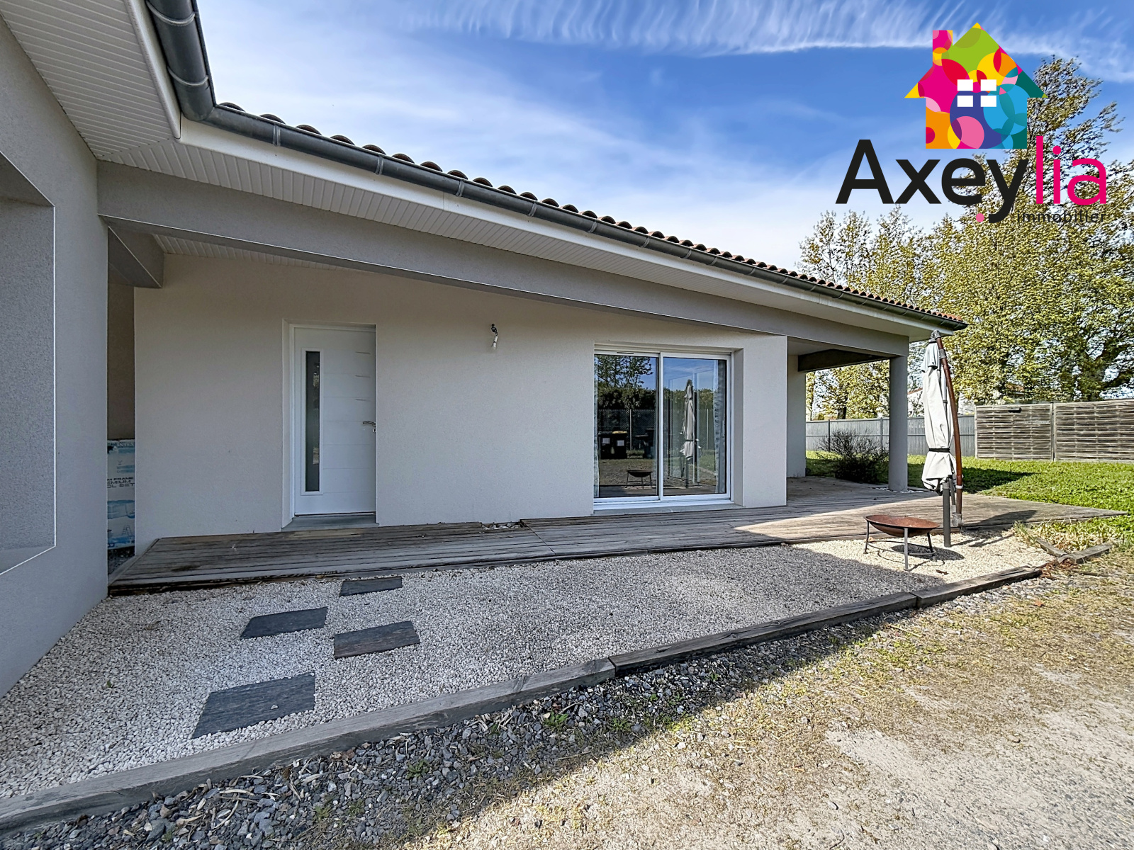 Exposée plein Sud, la maison bénéficie d’une agréable terrasse en bois couverte, idéale pour profiter des beaux jours.