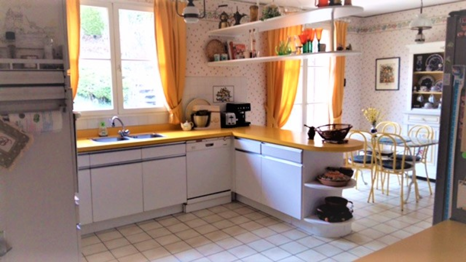 Au rez de chaussée, le hall de 11 m² dessert un grand séjour salon avec cheminée à foyer ouvert, une salle à manger, une grande cuisine équipée séparée de 19 m² et attenant à la cuisine un cellier/buanderie communiquant avec un garage double de 24 m² avec porte automatisée.
