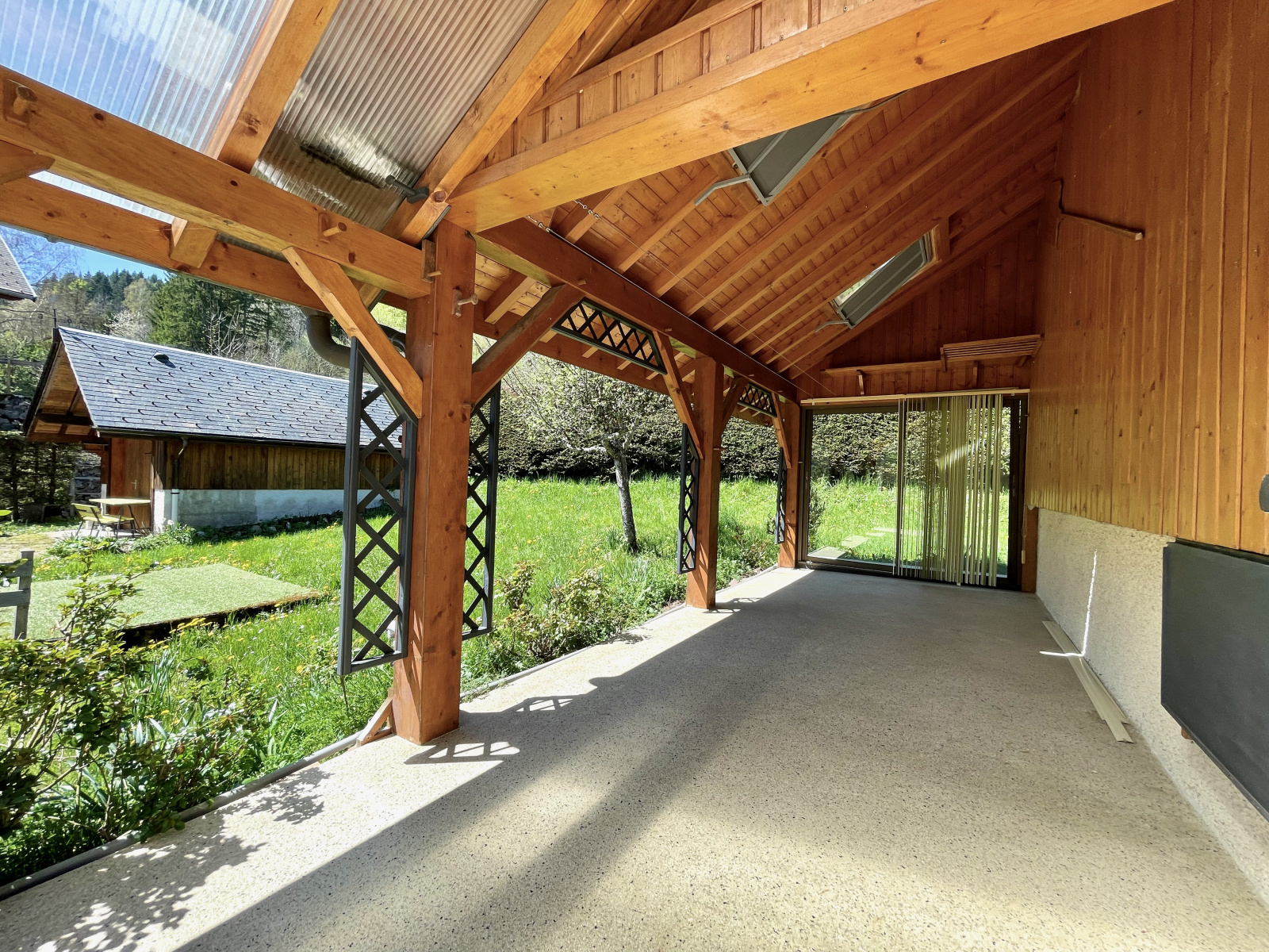 - Immense terrasse / préau couverts avec superbe charpente apparente