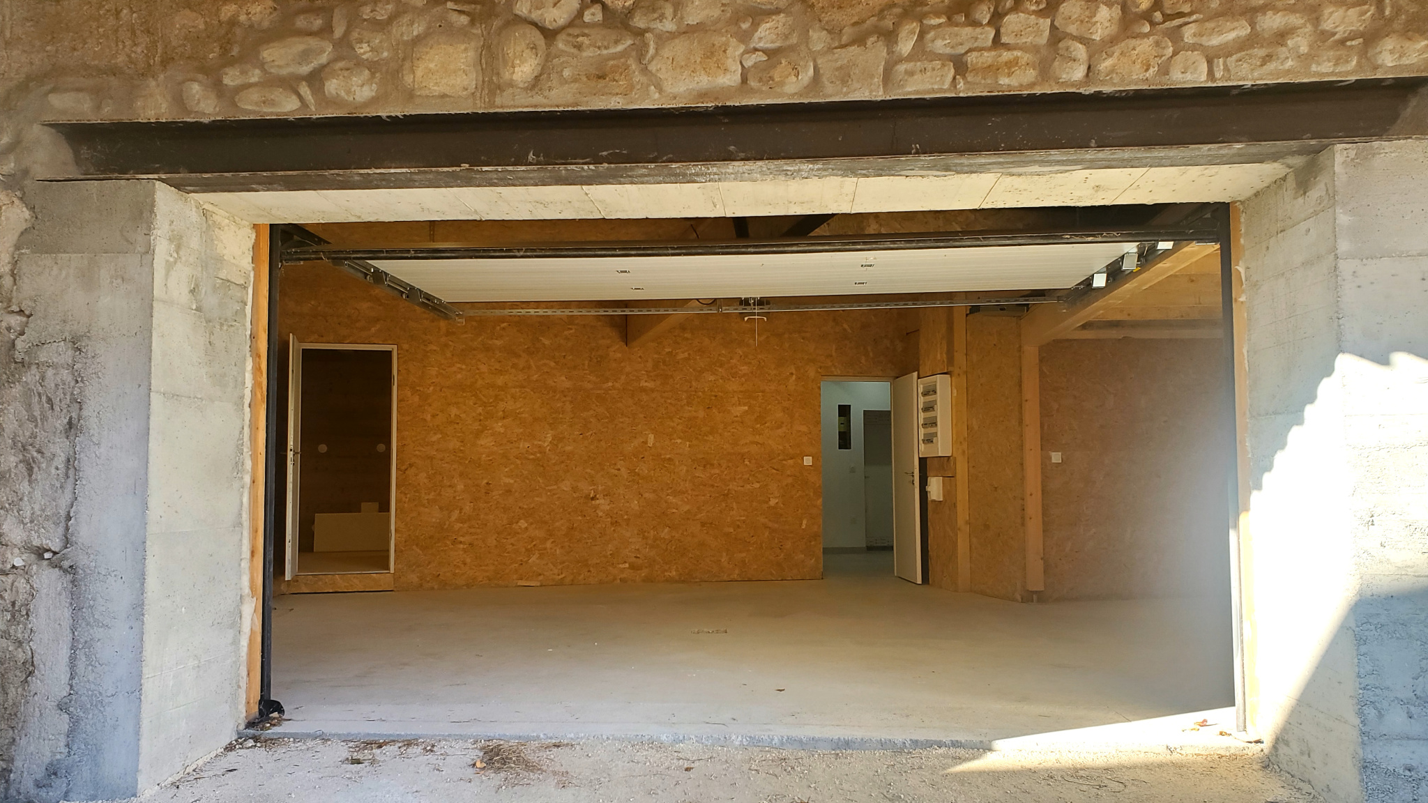 Grand garage d’environ 50 m², entièrement plaqué en OSB, offrant un espace propre et fonctionnel pour stationnement, atelier ou stockage