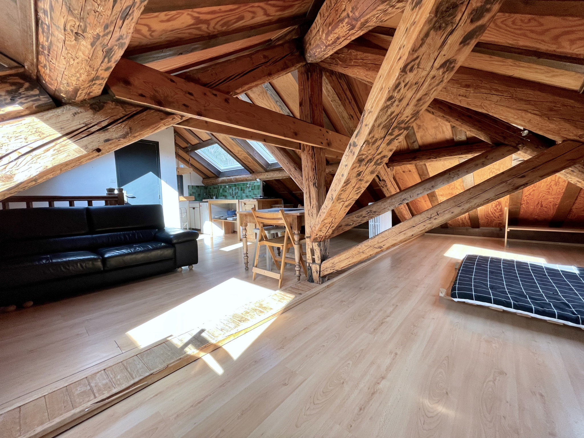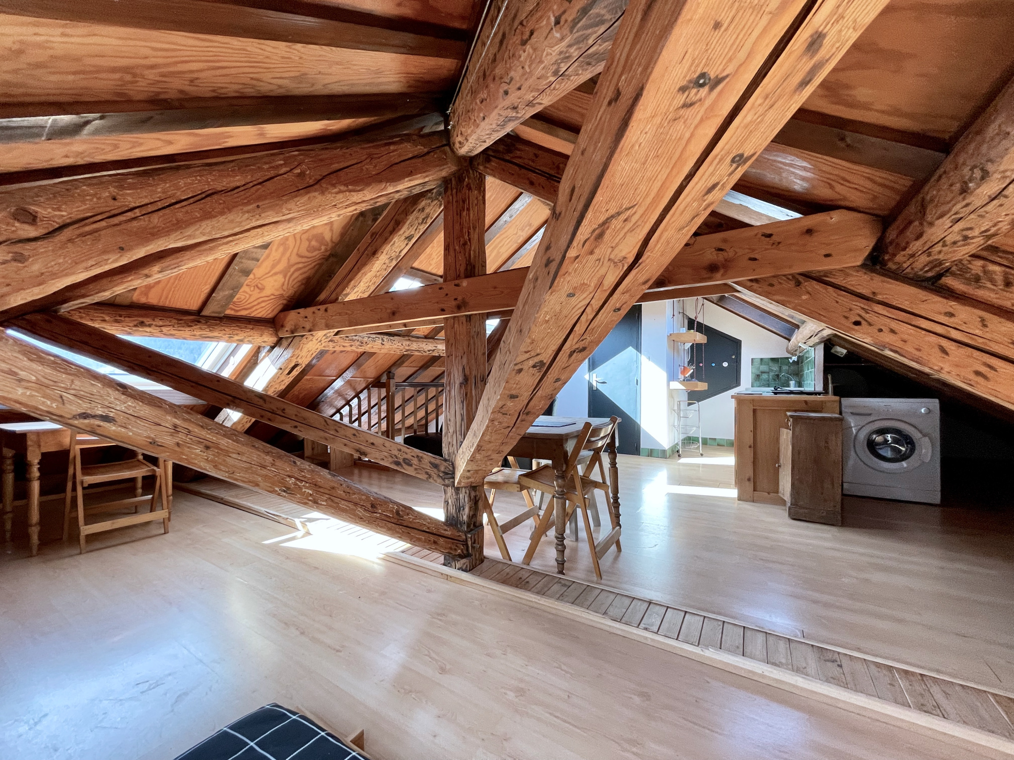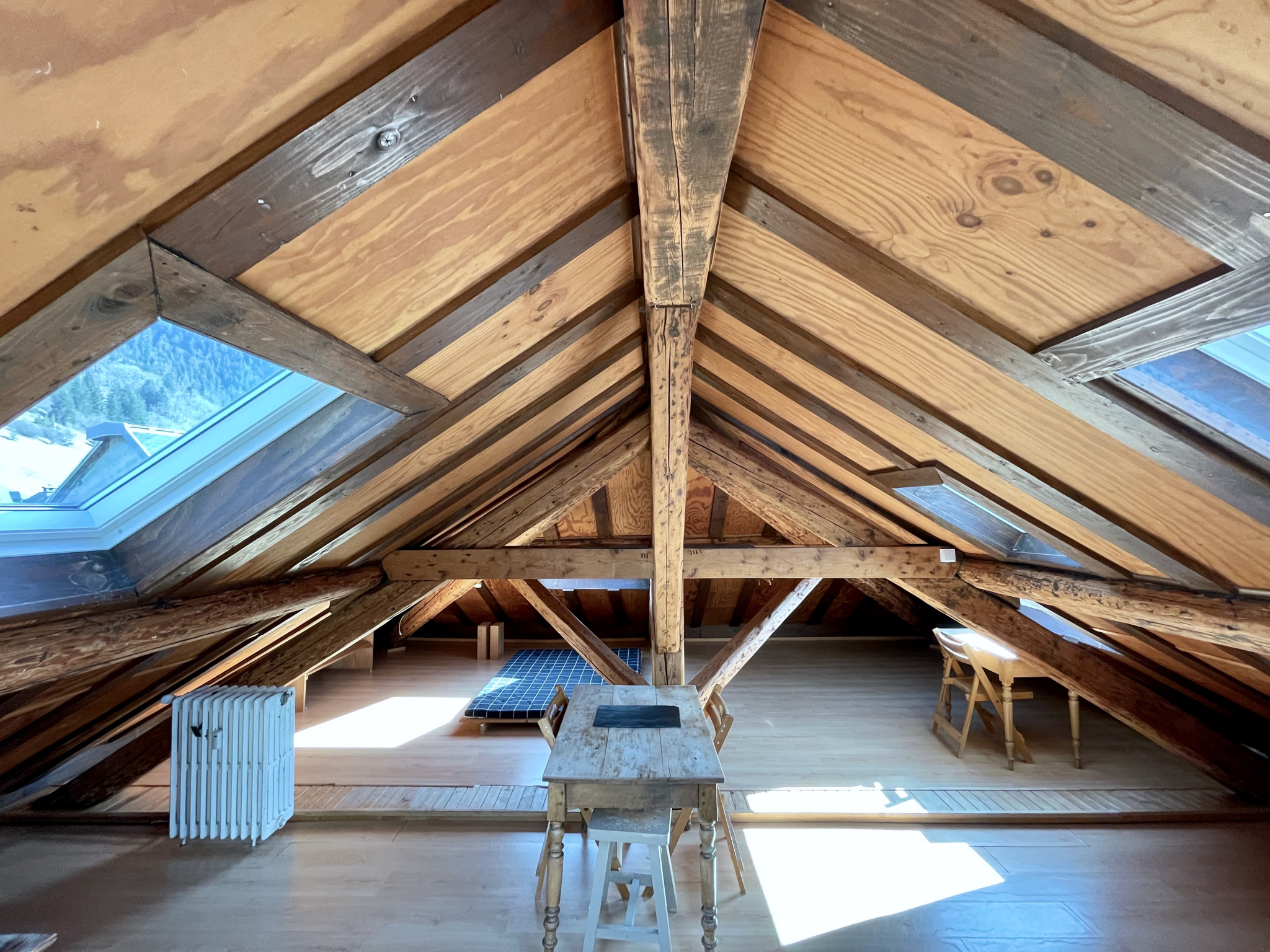 Beaucoup de charme pour ce studio en duplex au dernier étage - très lumineux - 7 fenêtres de toit - charpente apparente - vieux bois - vue dégagée à 360 degrés sur les sommets environnants