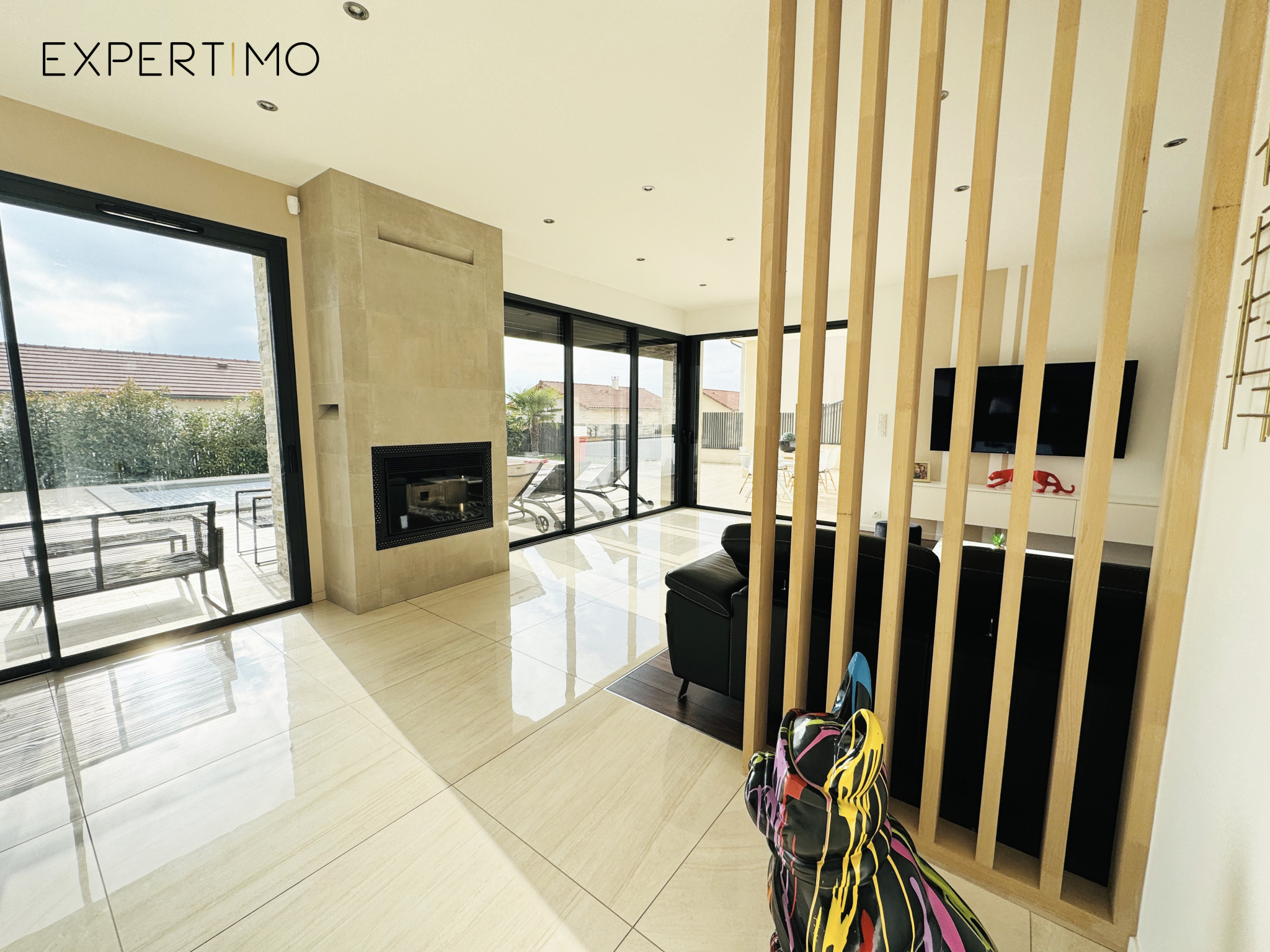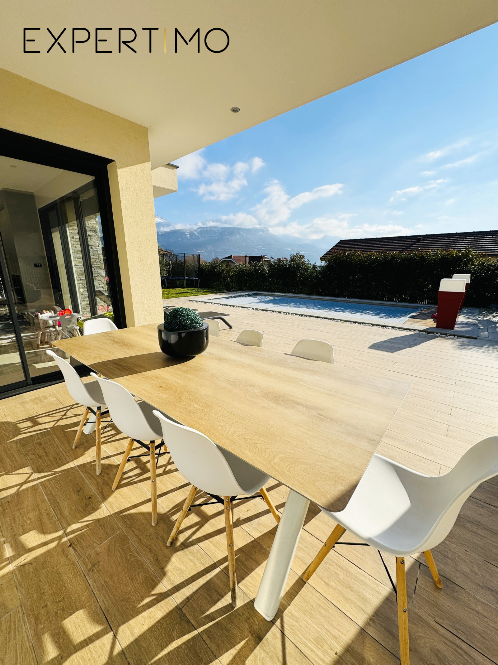 Vous apprécierez à coup sûr le confort de cette maison pour son exterieur avec un accès direct à la piscine sécurisée par son rideau immergé mais également une grande terrasse couverte comprennant une cuisine d'été.