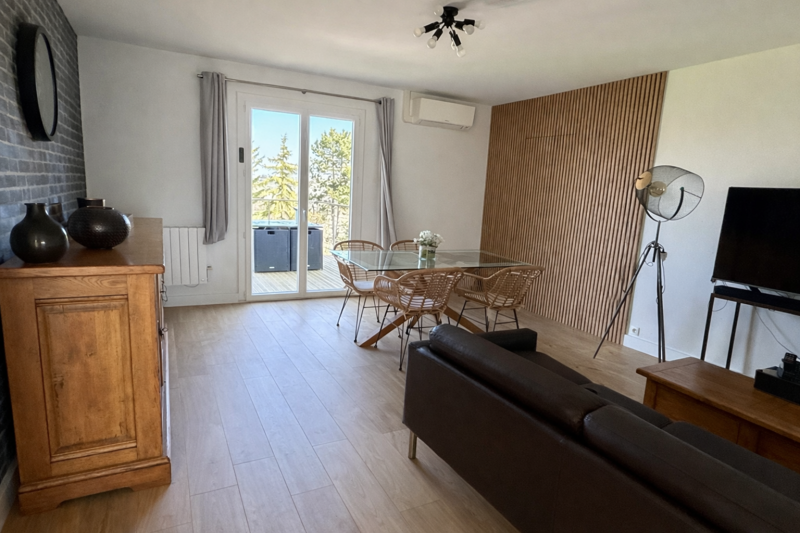 Dès l’entrée, vous découvrirez une agréable cuisine aménagée, ainsi qu’un salon lumineux ouvrant sur une terrasse, idéale pour profiter pleinement de la vue et du calme environnant. Il est également possible d’agrandir cet espace de vie en ouvrant une cloison et en supprimant une chambre, offrant ainsi une pièce de vie encore plus spacieuse selon vos besoins.