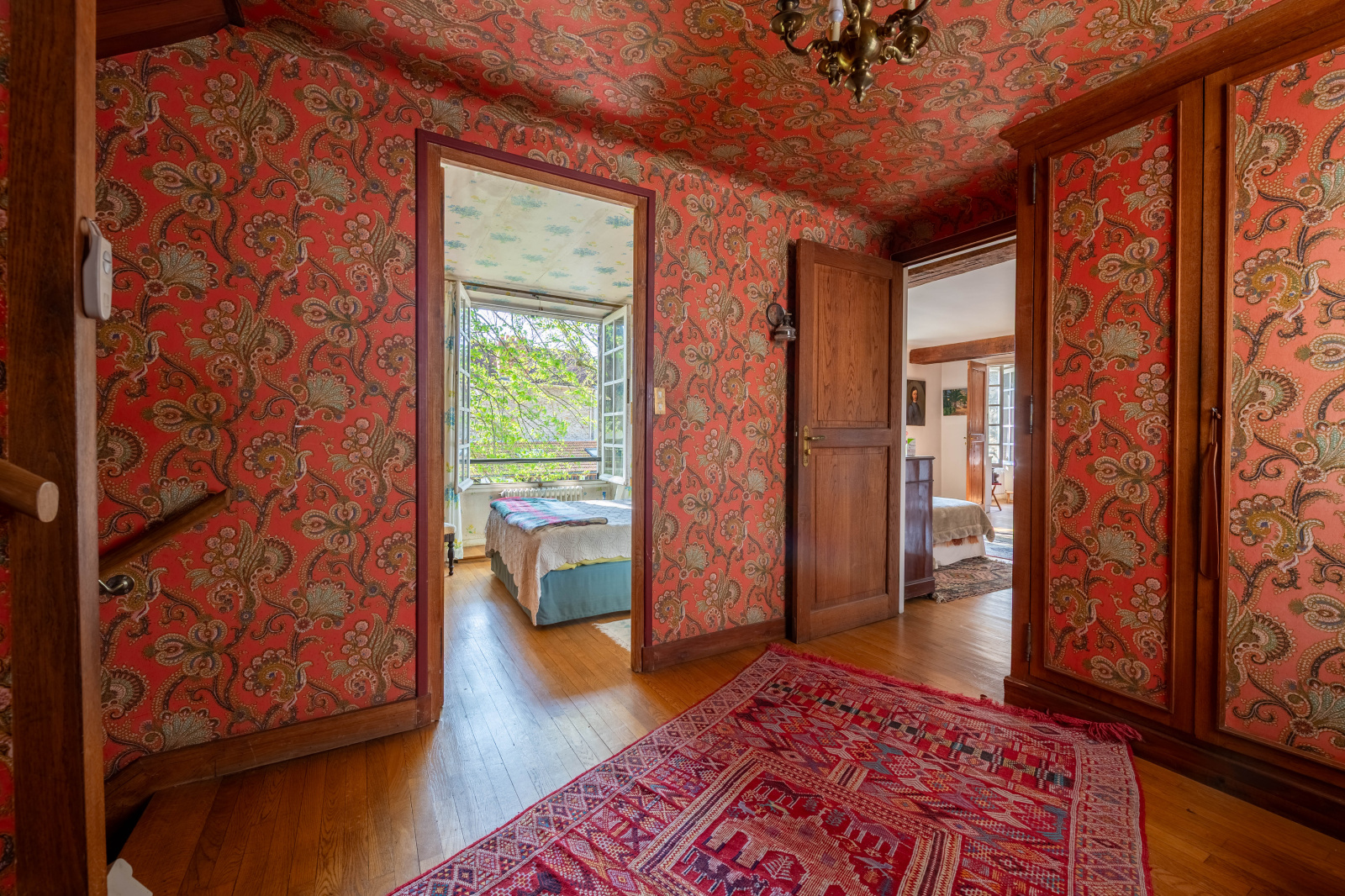 Au premier étage, un palier dessert deux chambres se partageant une salle de bains. Le deuxième étage accueille deux chambres supplémentaires : l’une bénéficie d’une salle de bains, tandis que l’autre dispose d’un point d’eau.