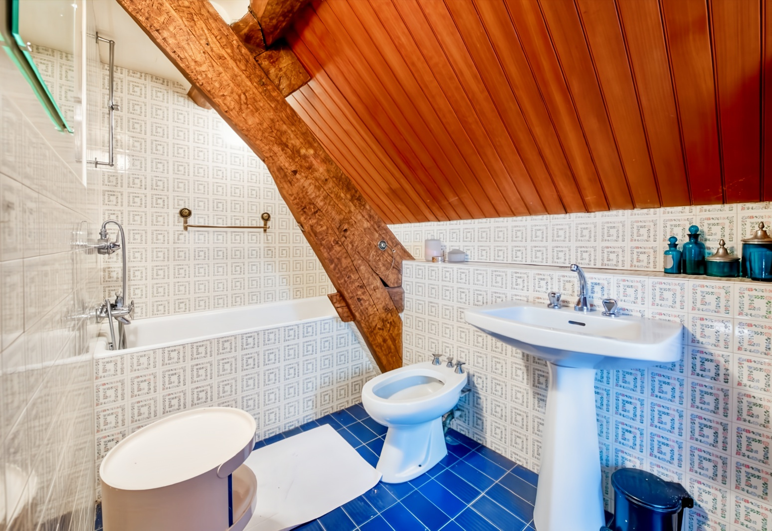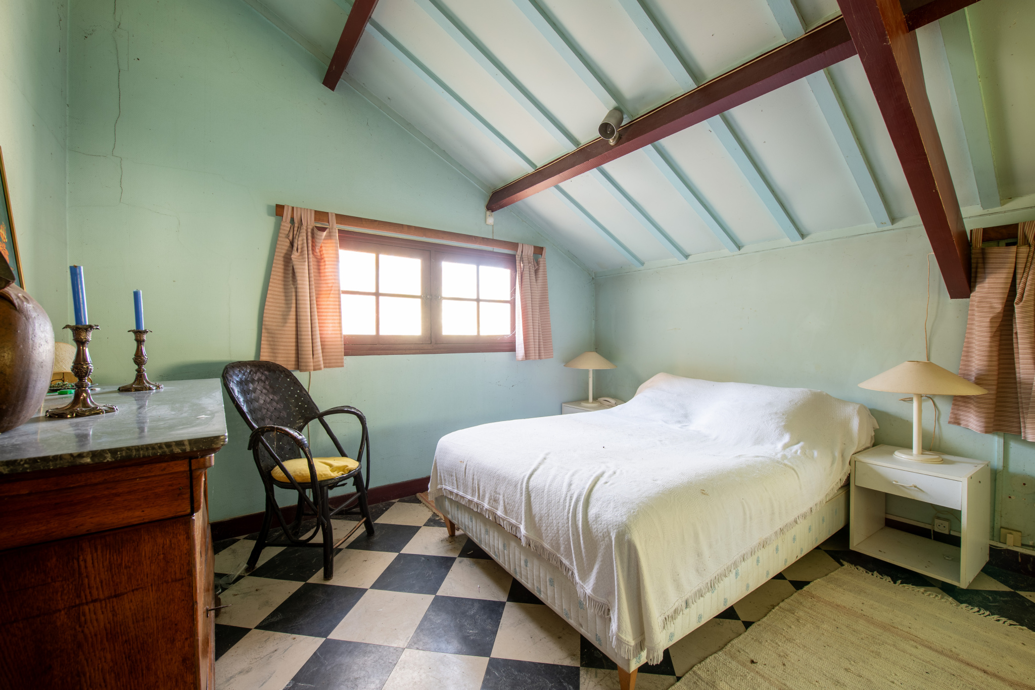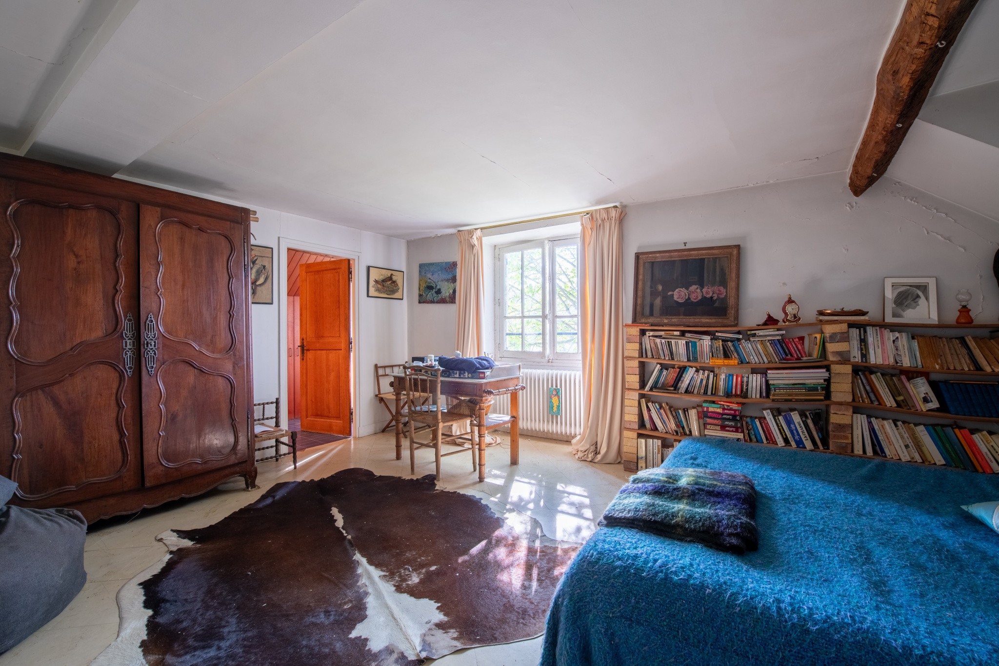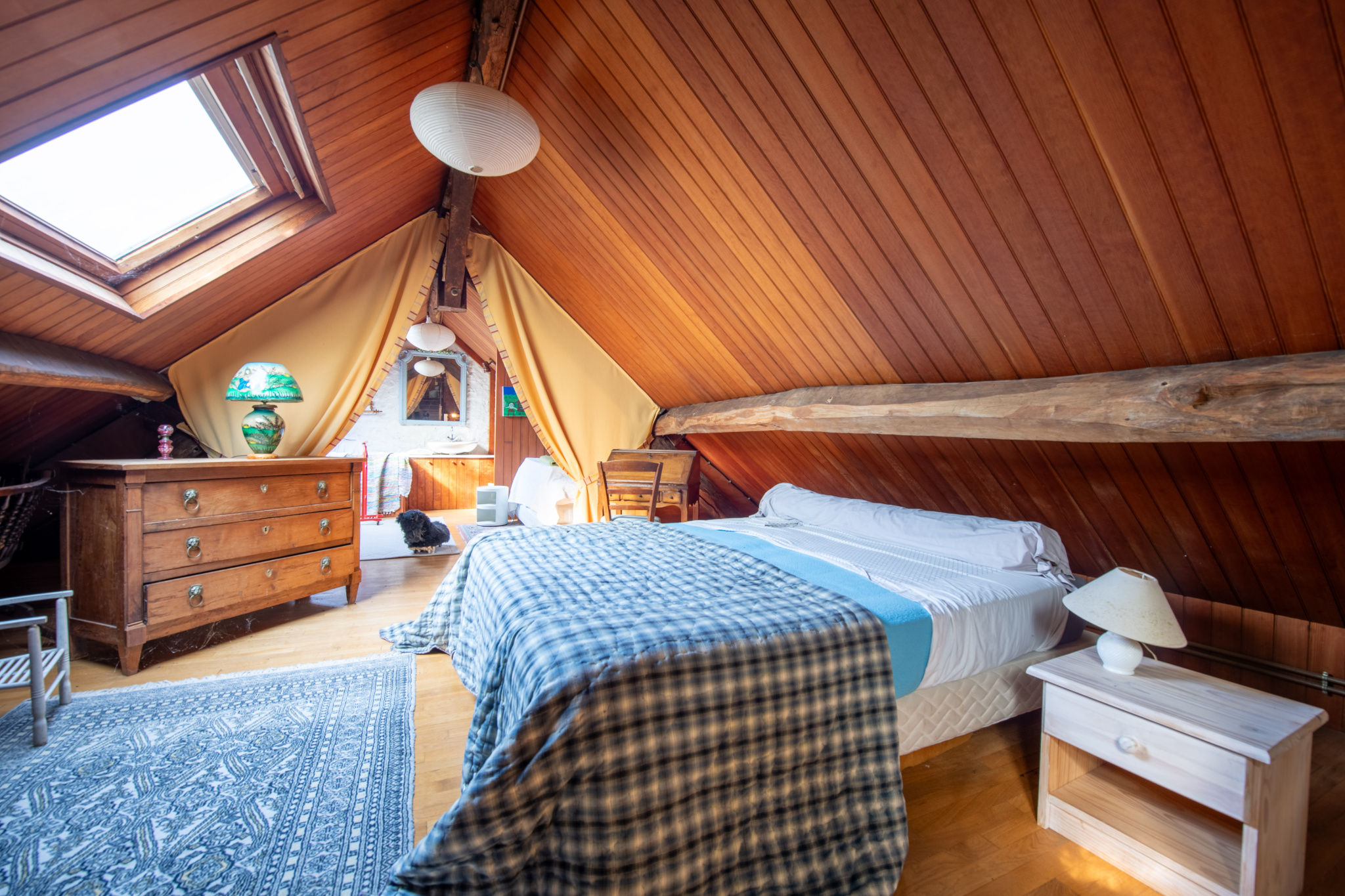 Sous les combles, éclairé par trois vélux, un vaste grenier a été transformé en chambre, salle de jeux et salle de bains. Quelques marches nous guident vers une belle pièce de nuit et sa salle de bains.