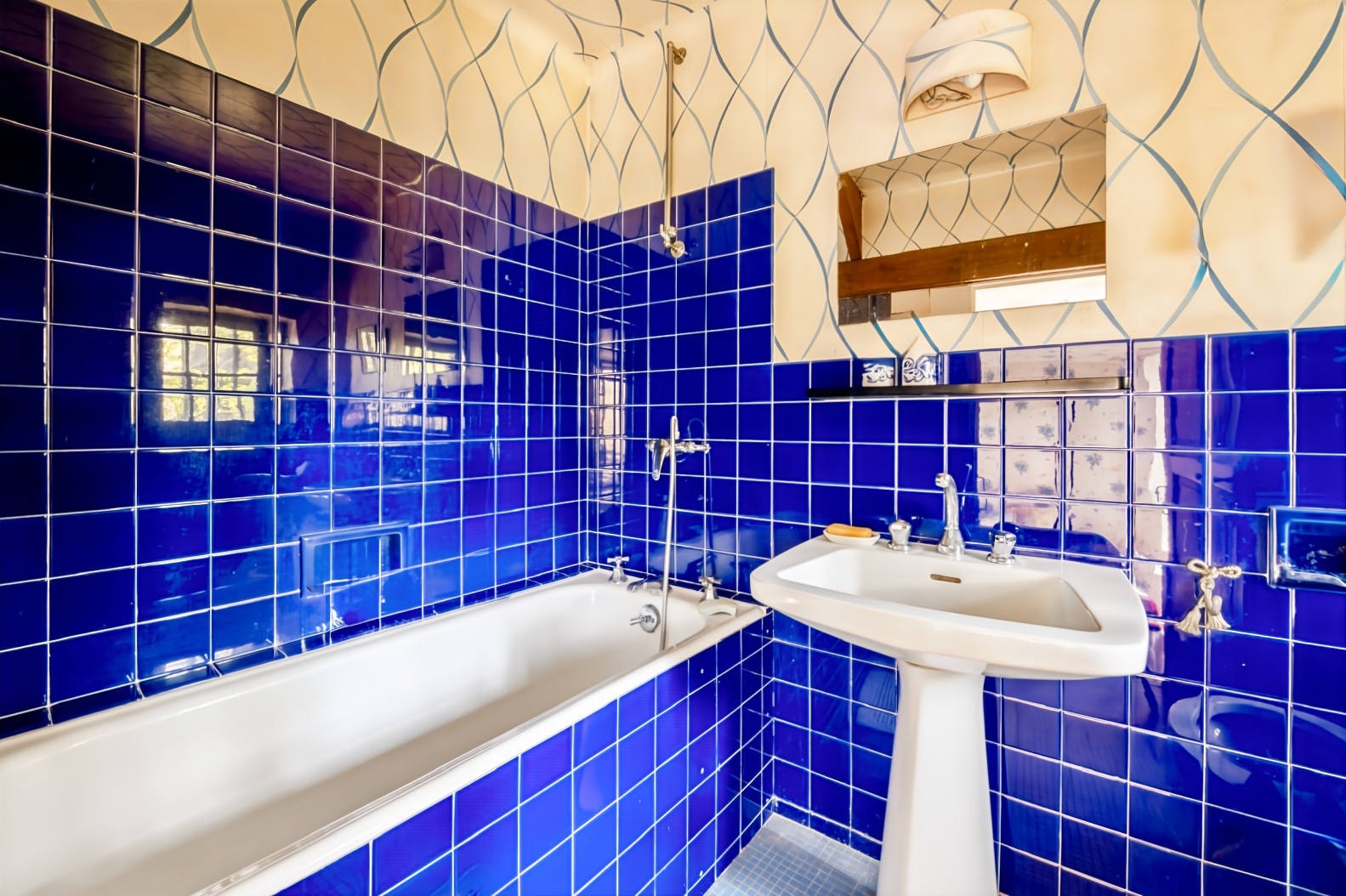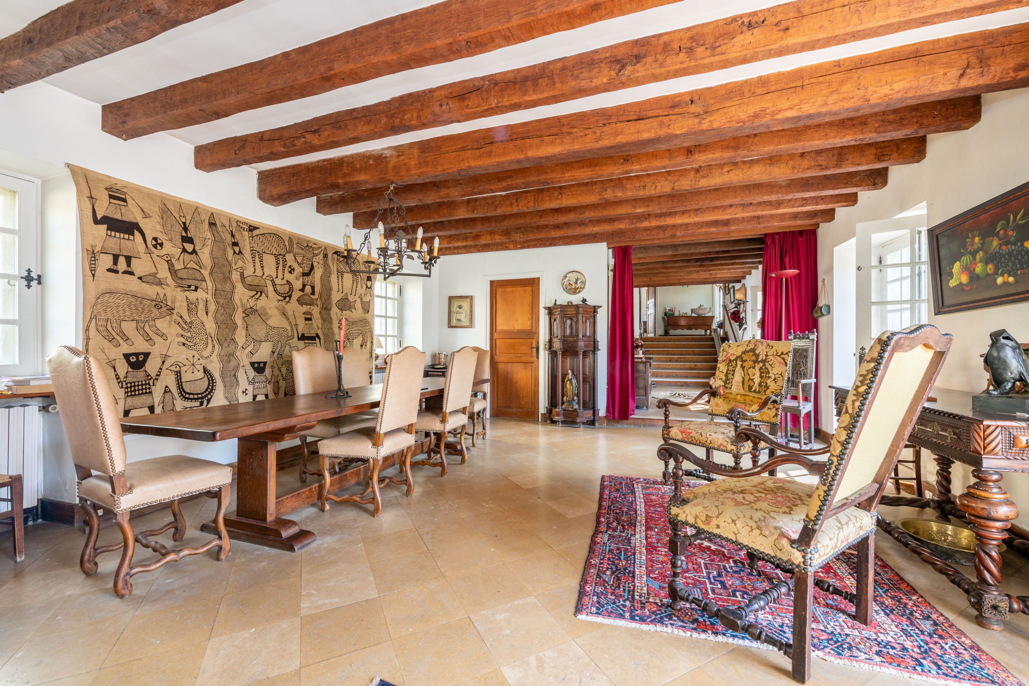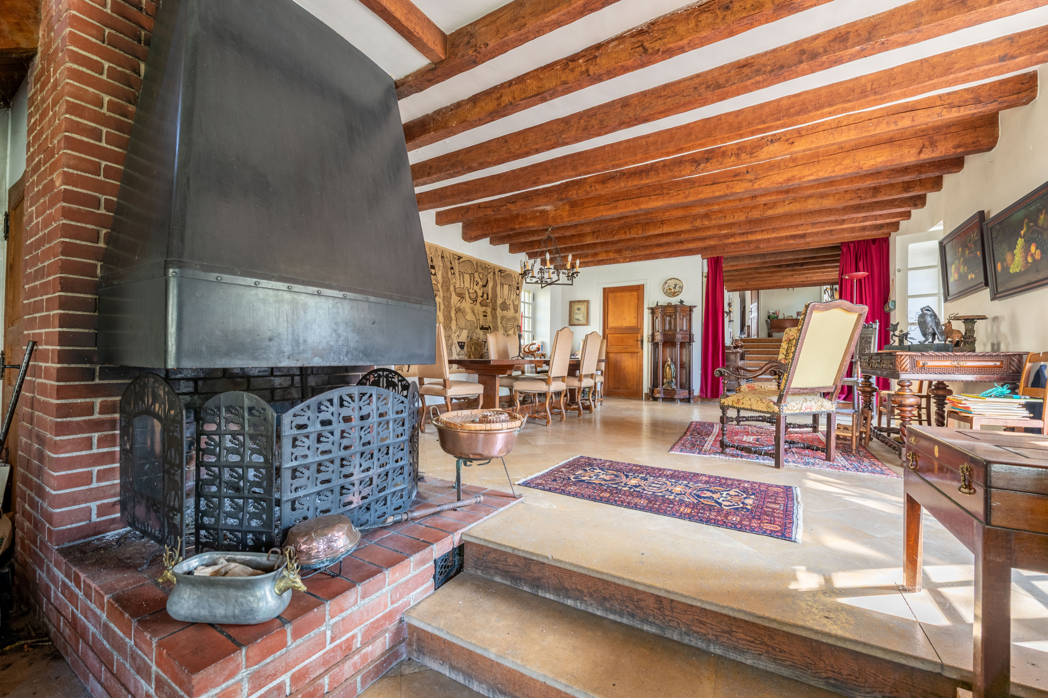 Une entrée indépendante conduit à la cuisine, prolongée par une vaste double pièce de réception. La cheminée centrale à trois faces structure l’espace, tandis que la belle hauteur sous plafond et la large baie vitrée ouverte sur le parc apportent luminosité et profondeur.
