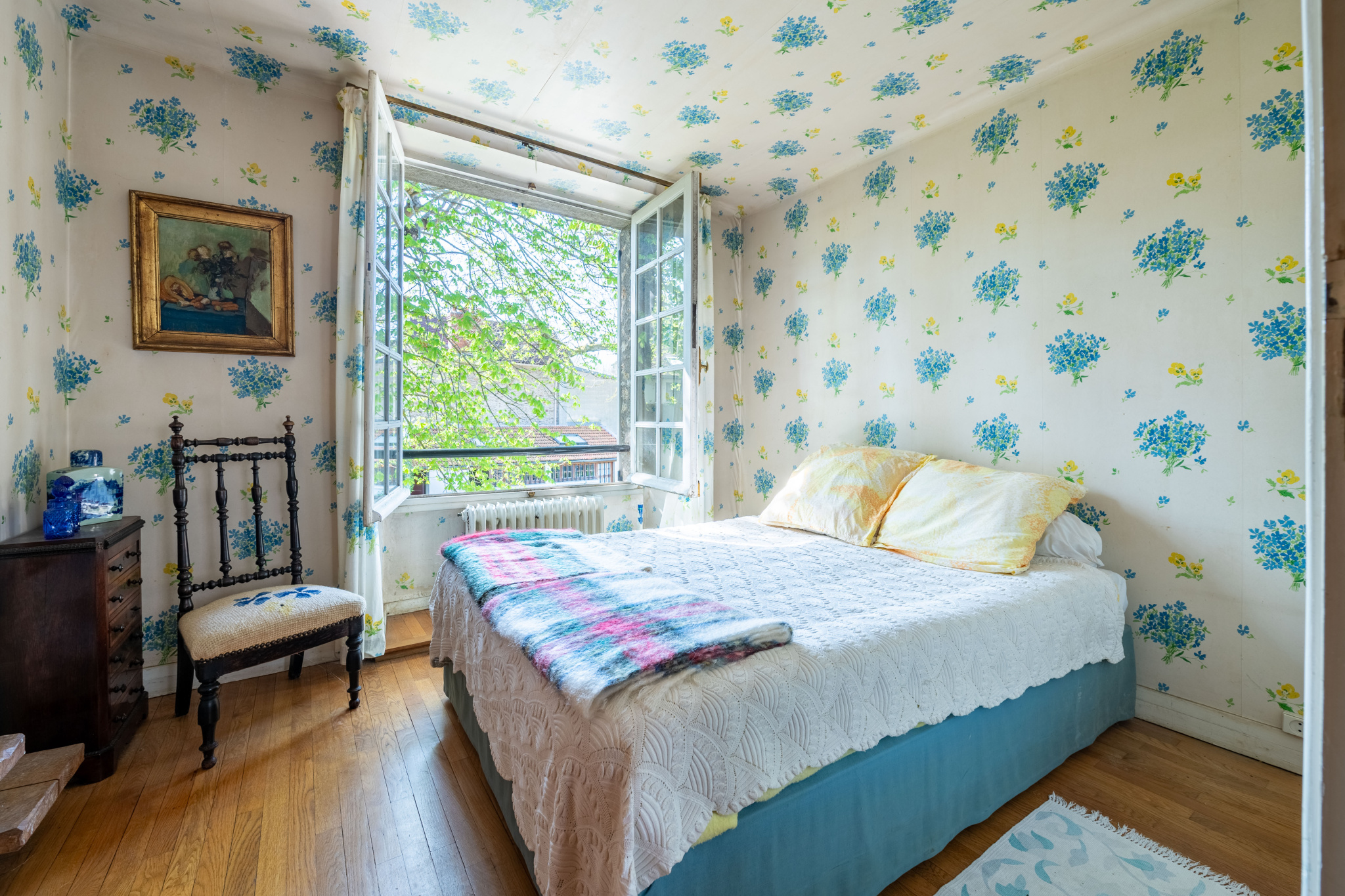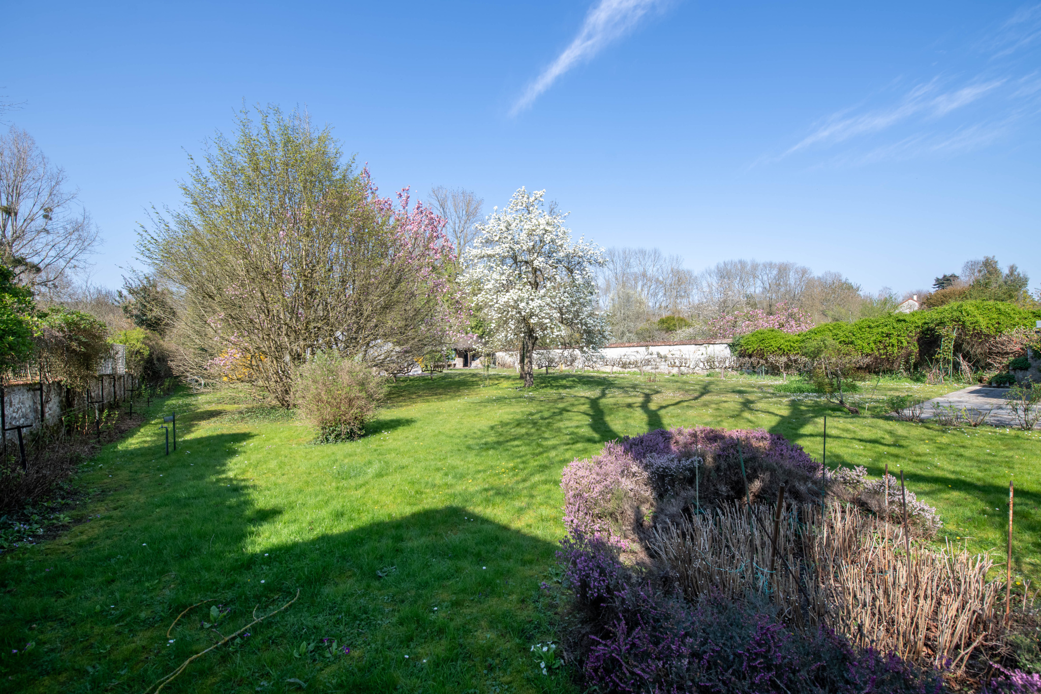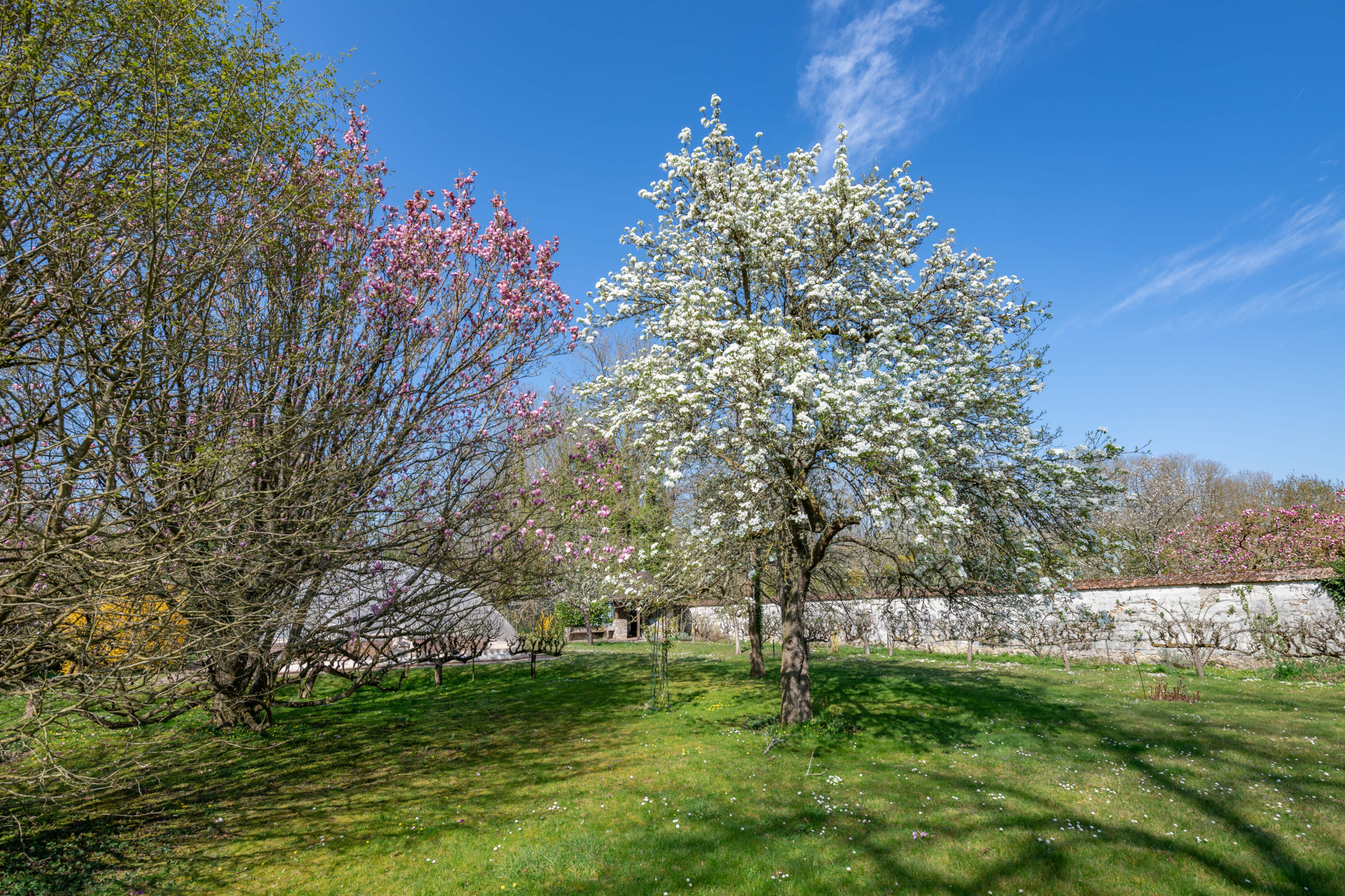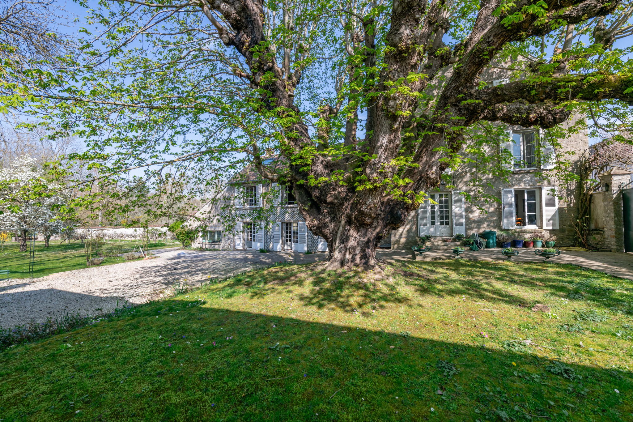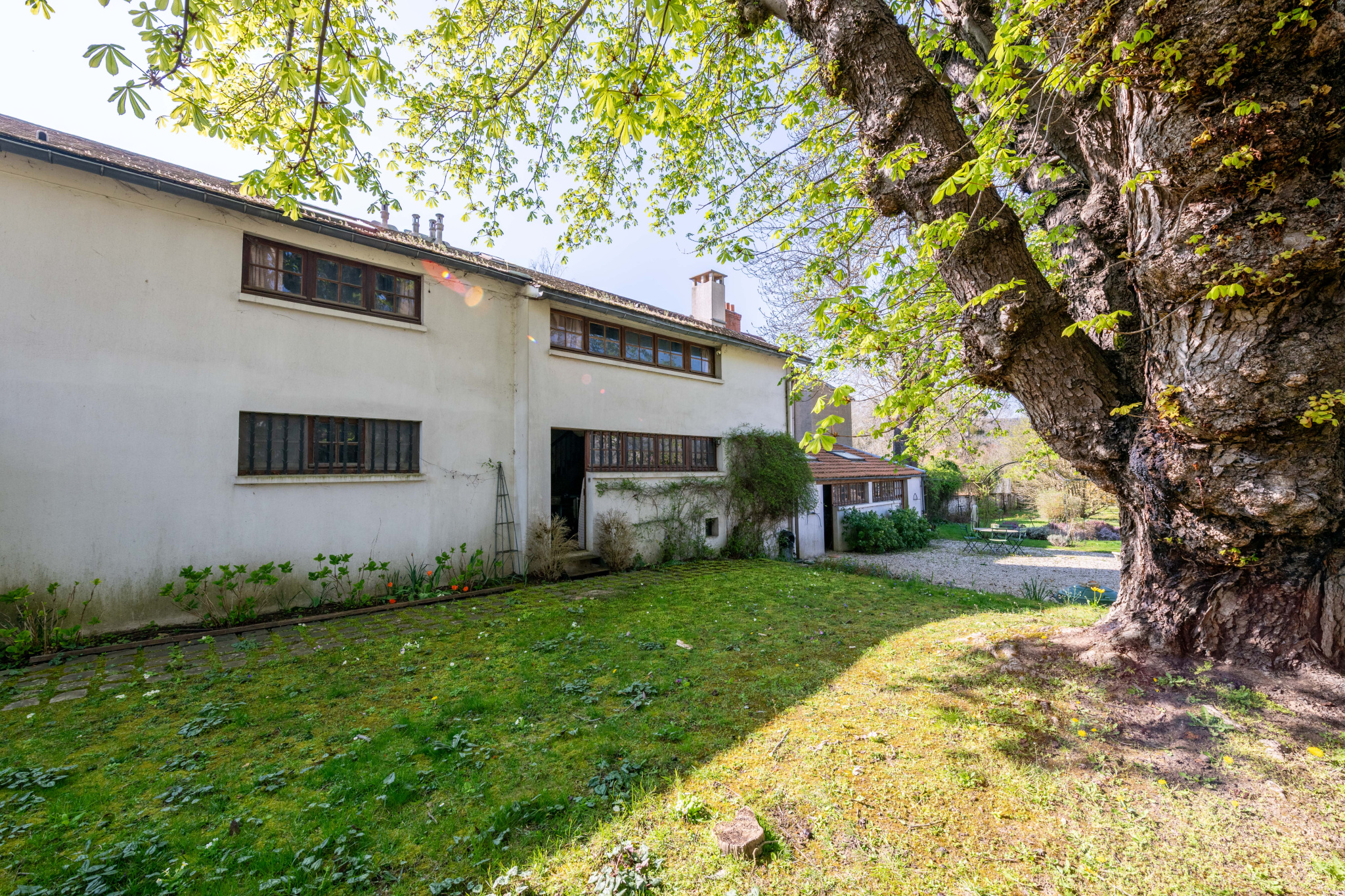 À l’extérieur, le parc arboré, composé de diverses essences et d’arbres fruitiers, s’étend jusqu’à la rivière, prolongeant l’atmosphère paisible de la propriété.