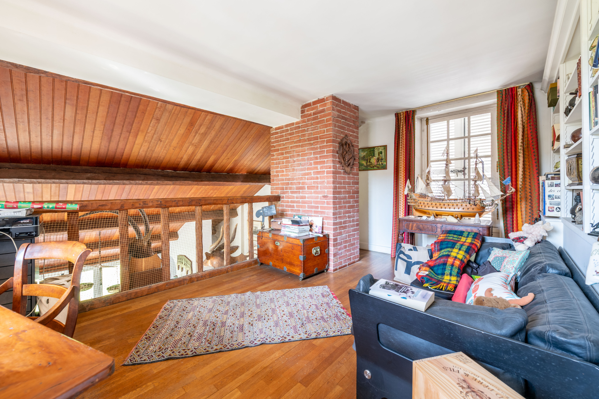 Un escalier mène à une grande mezzanine qui surplombe le séjour, créant une configuration aérienne et atypique.