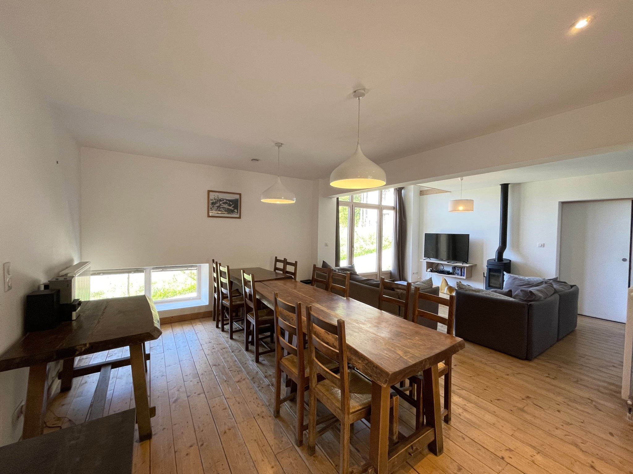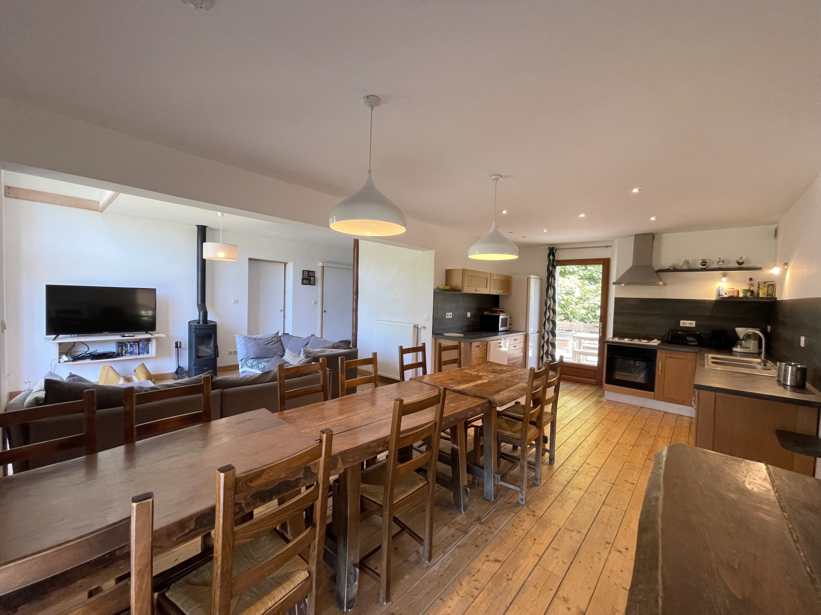 - Pièce de vie (38,4 m2) avec poêle à bois et cuisine ouverte entièrement aménagée - accès direct à la terrasse et au terrain