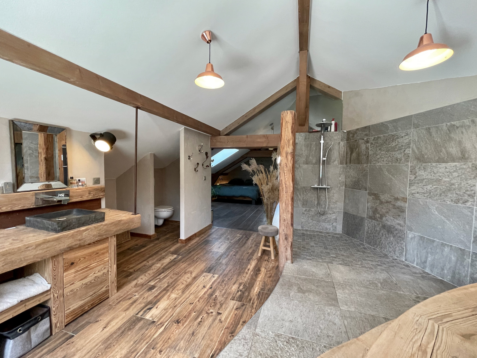 - Salle de bain avec douche à l’italienne et baignoire surélevée - wc (18,6 m2 plancher - 16,75 m2 carrez) - très lumineuse et très bien aménagée