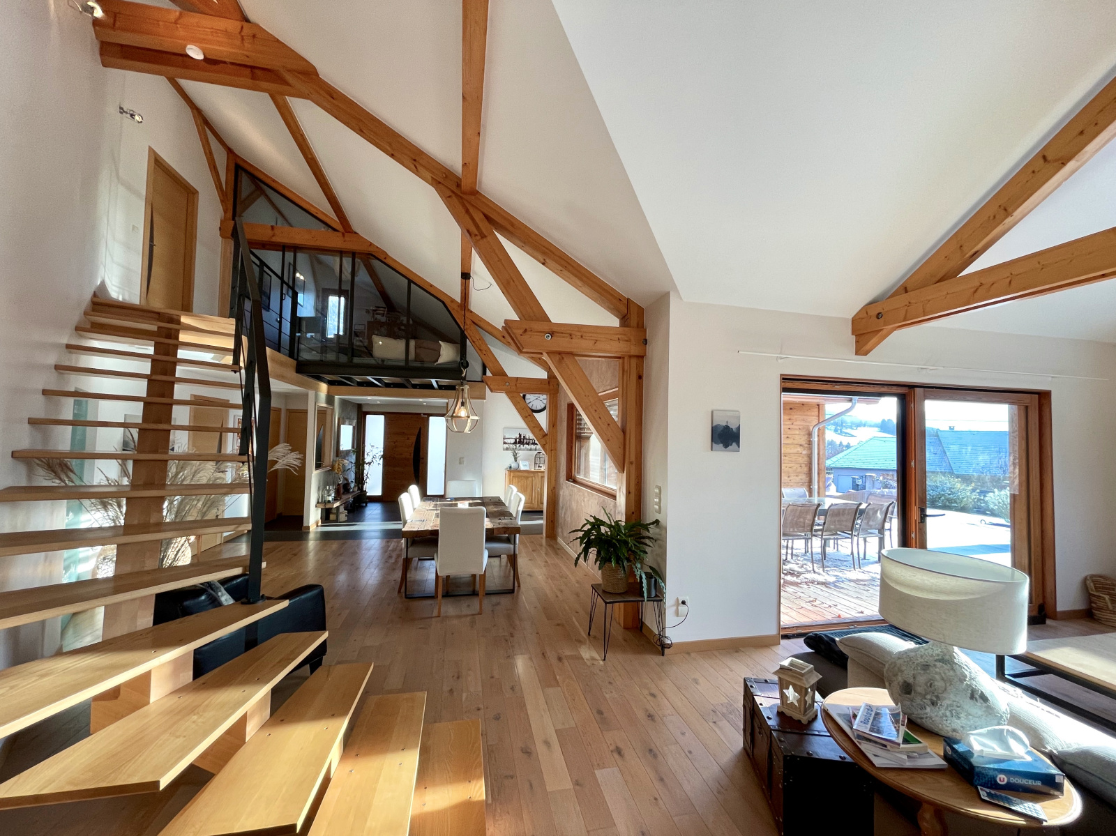 - Salon (30 m2) avec parquet en chêne massif - poêle à bois - baie vitrée avec accès sur la terrasse - charpente apparente - vue sur la campagne environnante