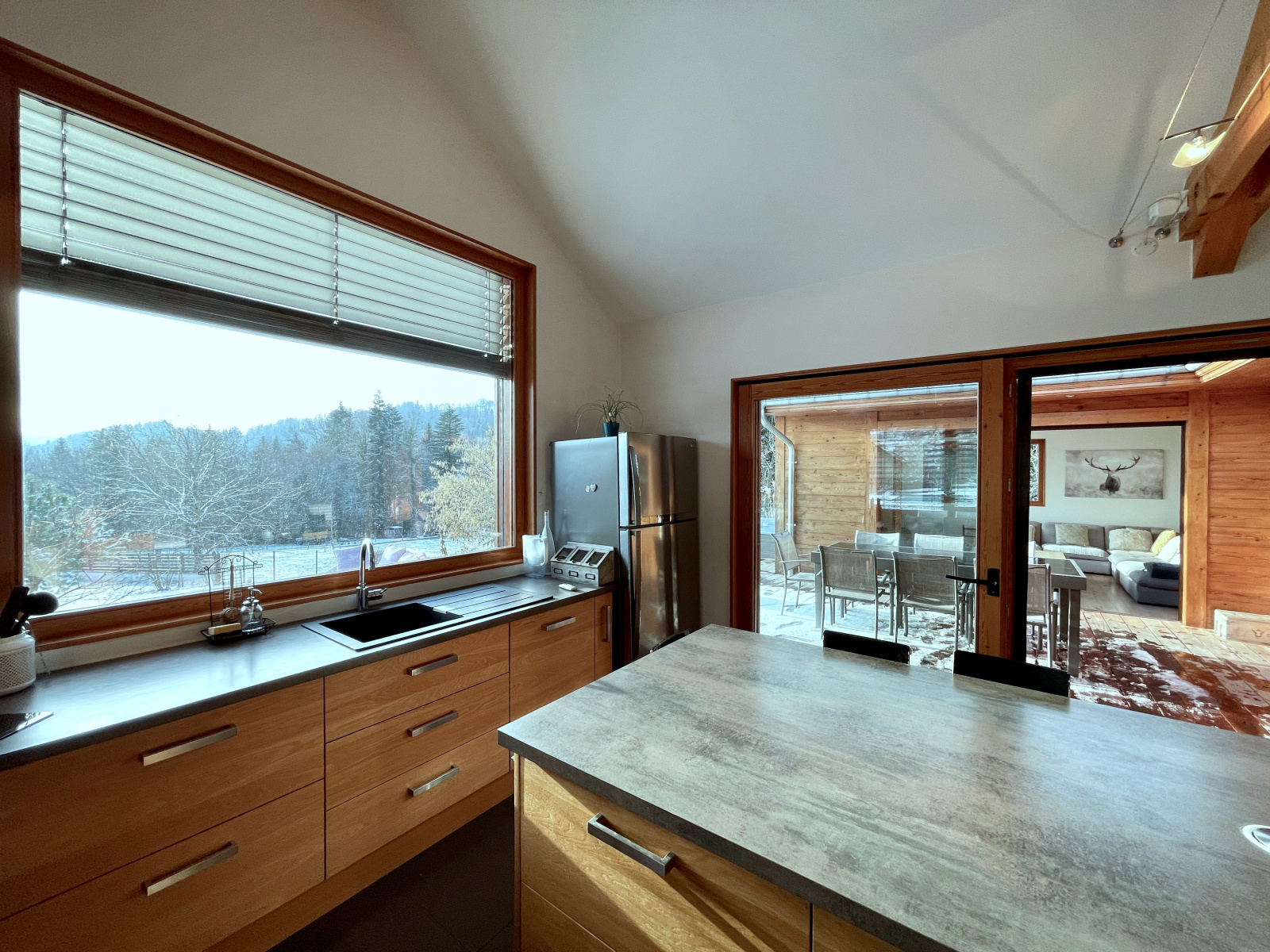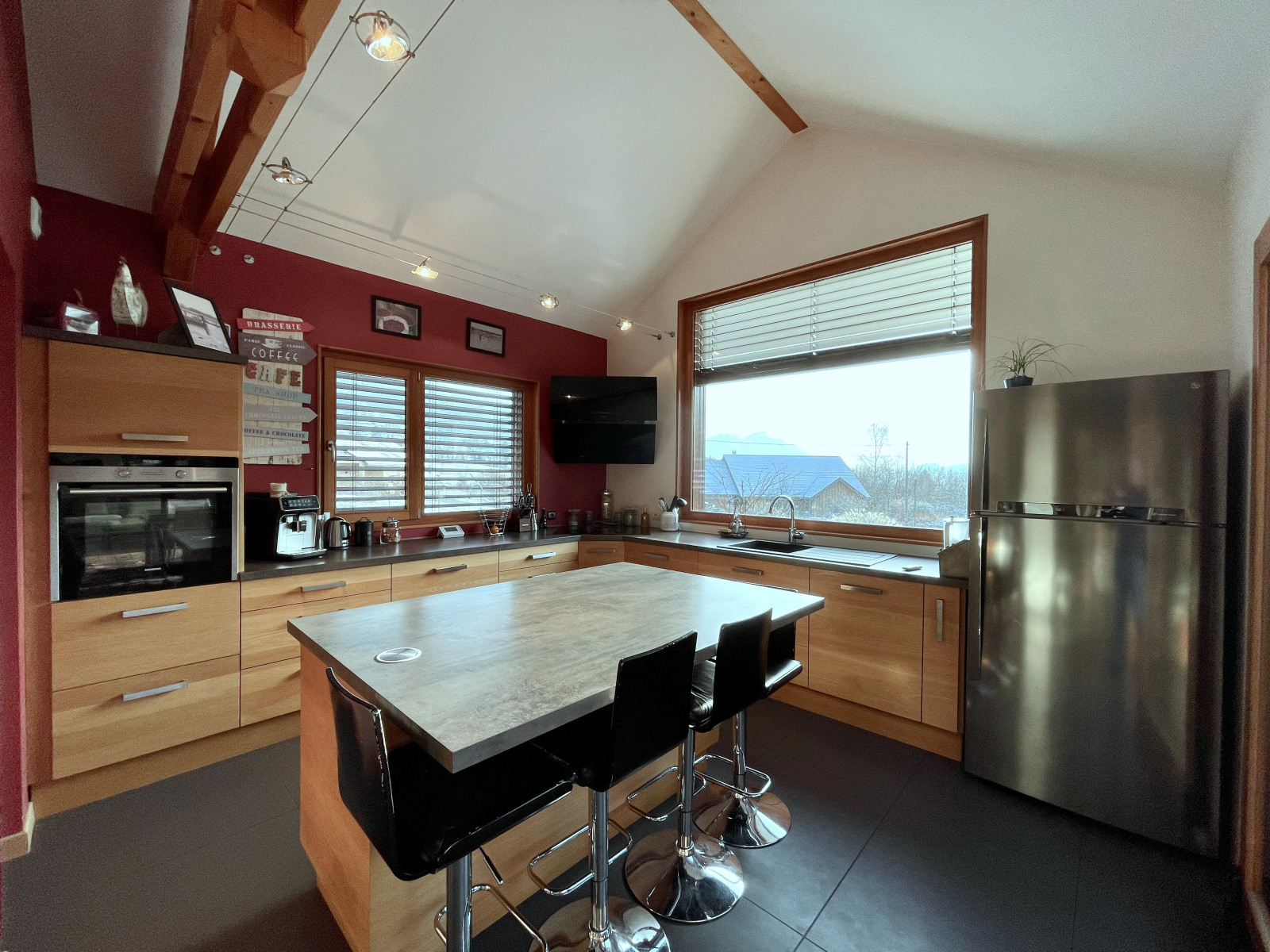 - Cuisine entièrement aménagée (15,5 m2) lumineuse, très fonctionnelle, avec ilôt central et baie vitrée donnant sur la terrasse