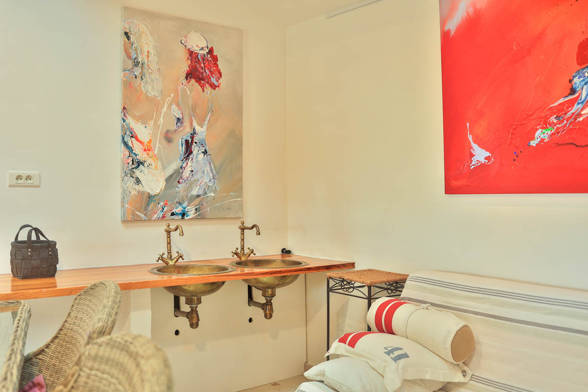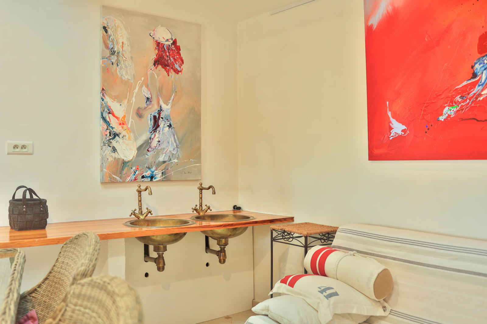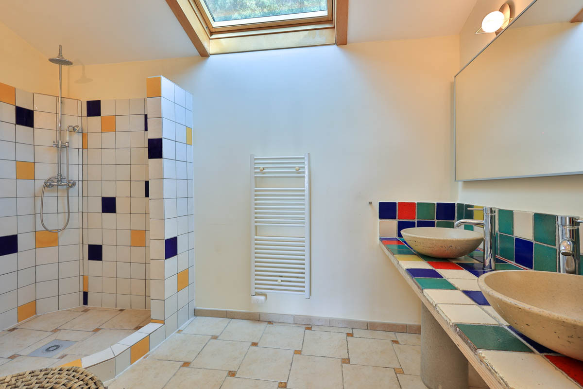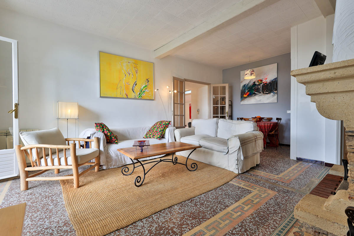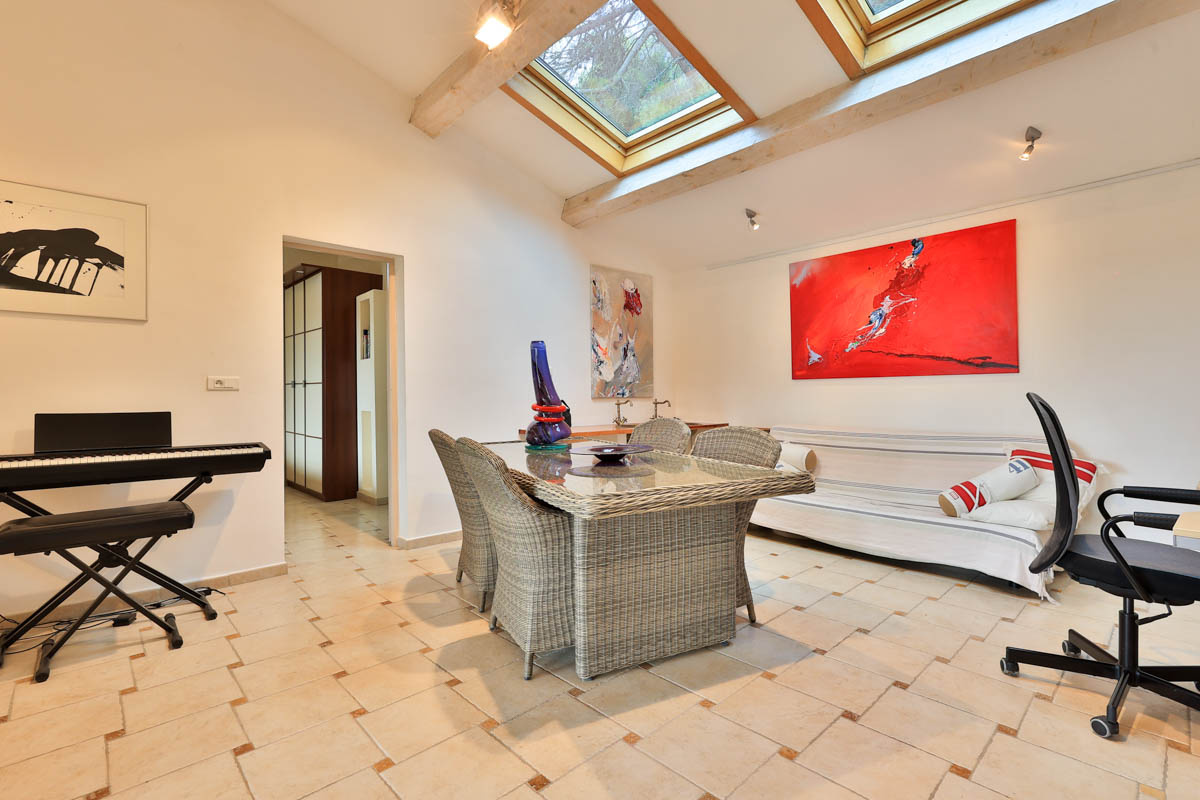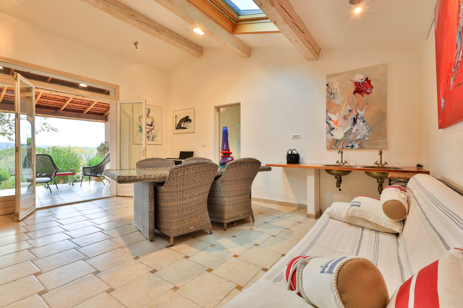 Le salon est adjacent à la terrasse. Vous y trouverez du carrelage au sol, des poutres apparentes et une cheminée. Ensuite vous avez une salle à manger accueillante qui bénéficie d'une lumière étonnante, car elle a été conçue comme un atelier d'art.