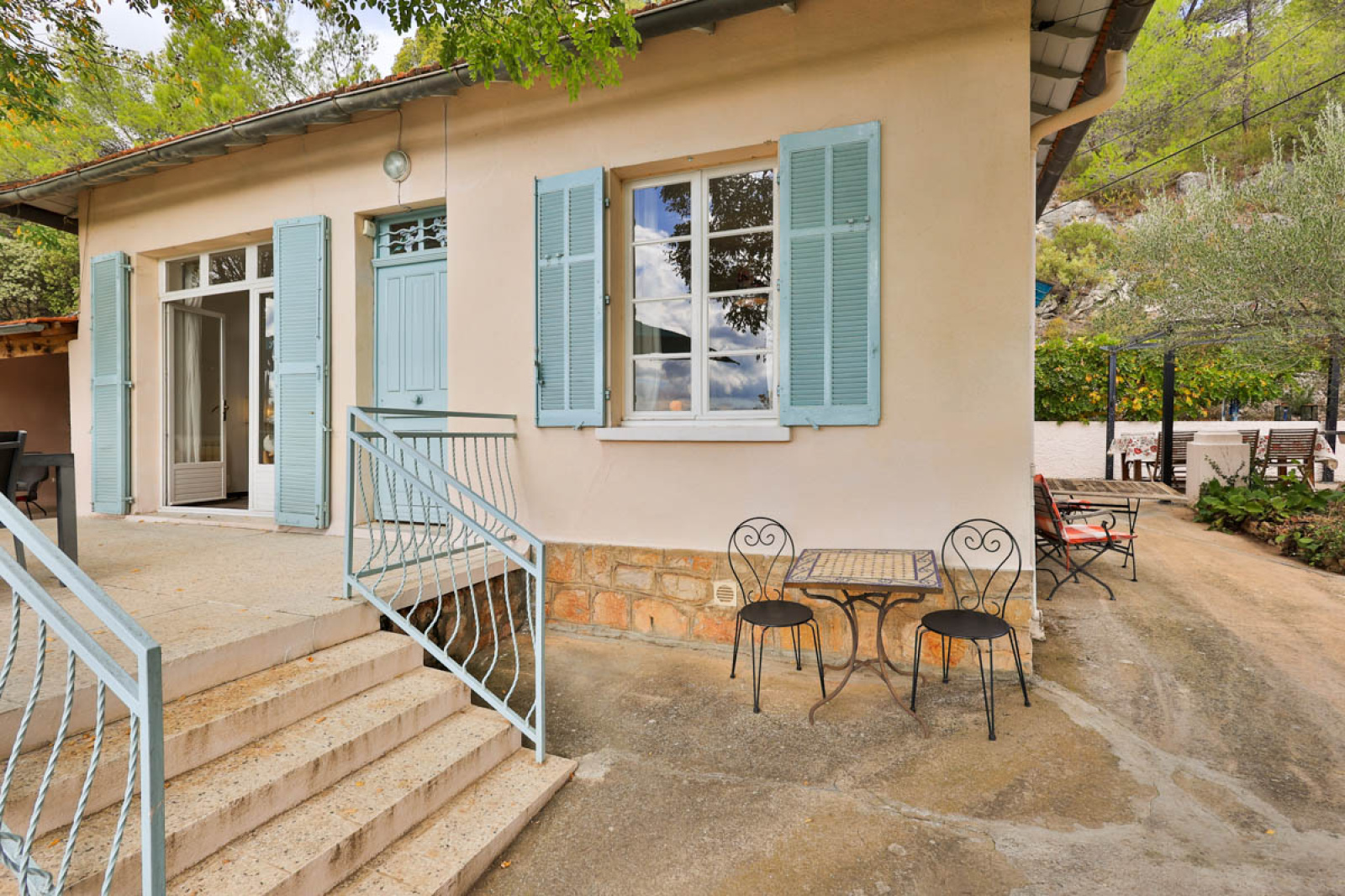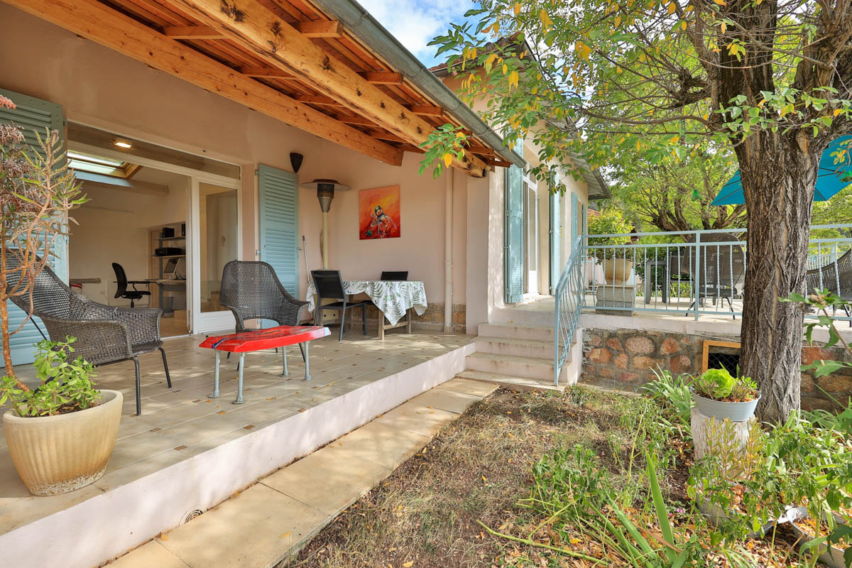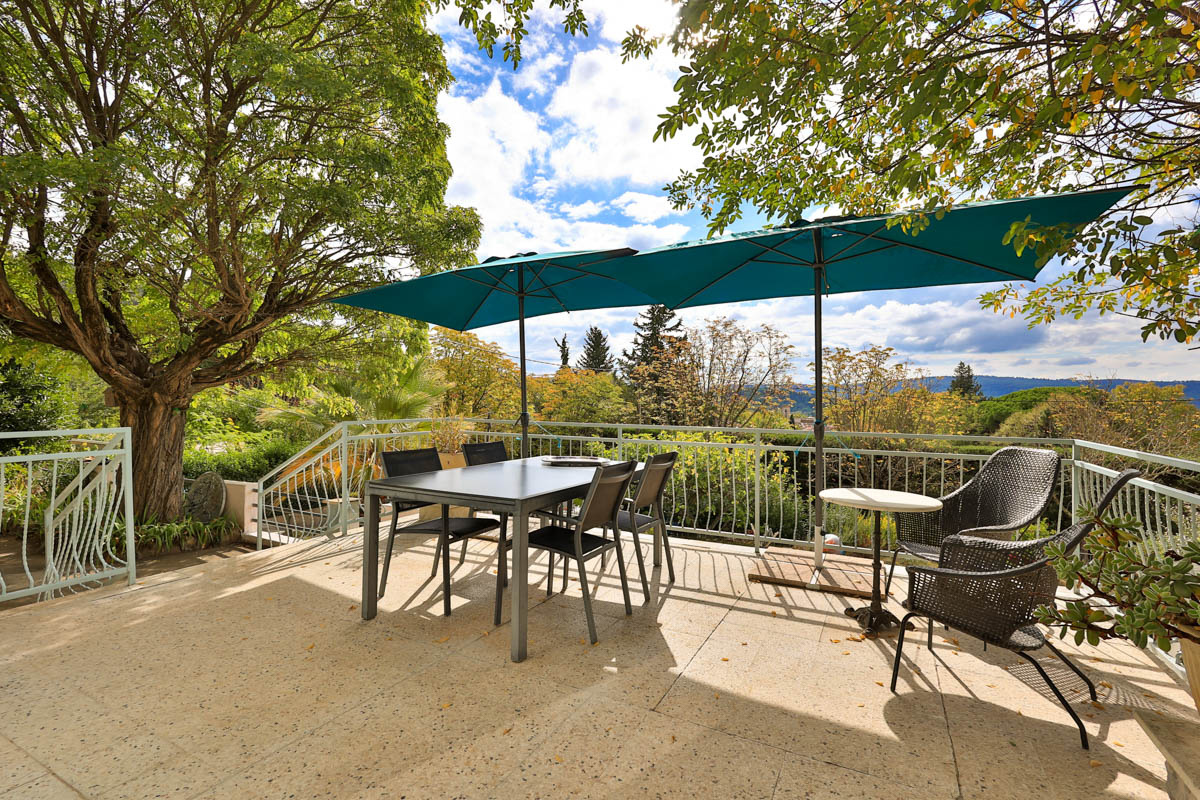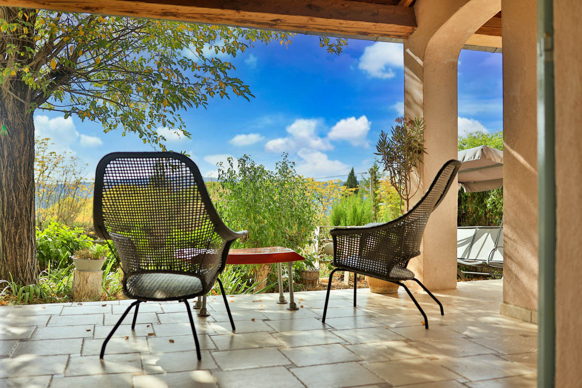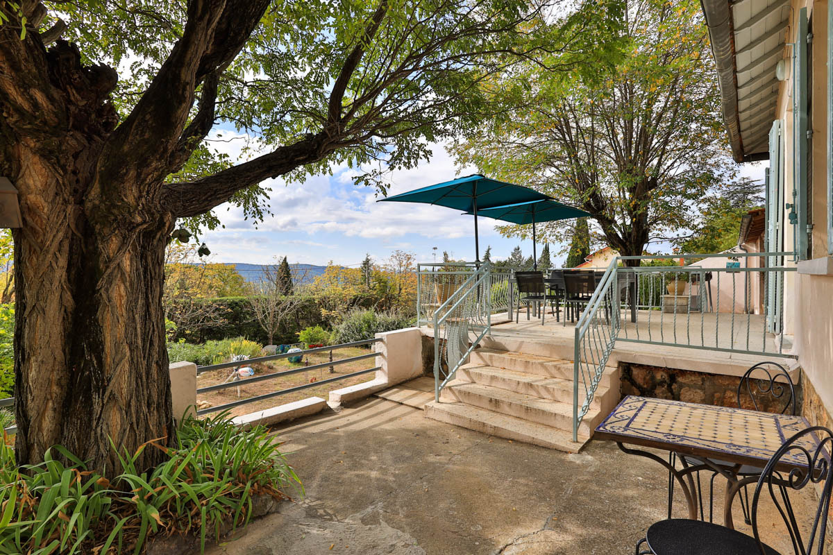 La terrasse principale donne sur le jardin avec une orientation au sud. Il y a une belle vue sur les collines environnantes.