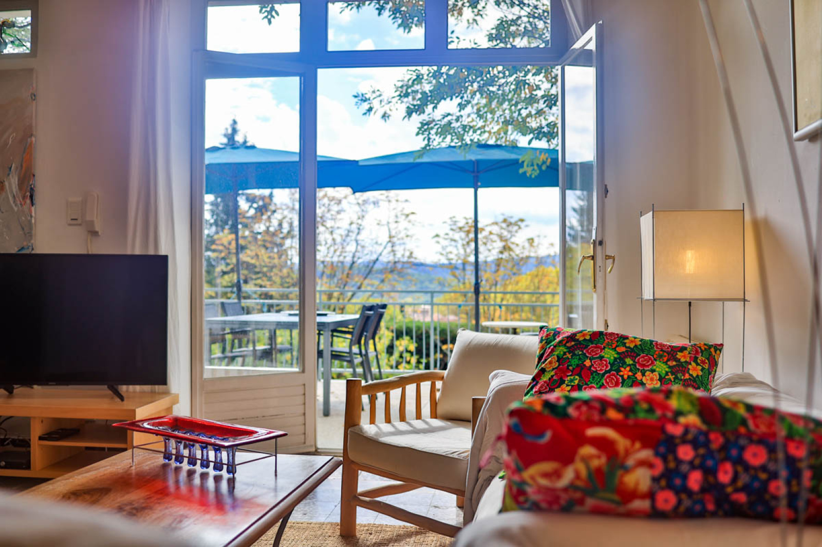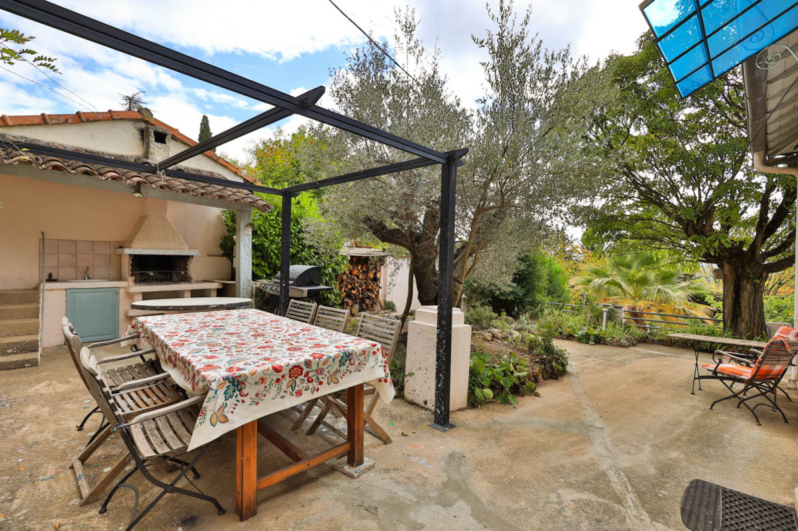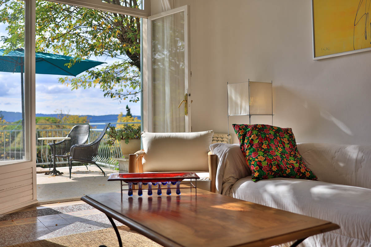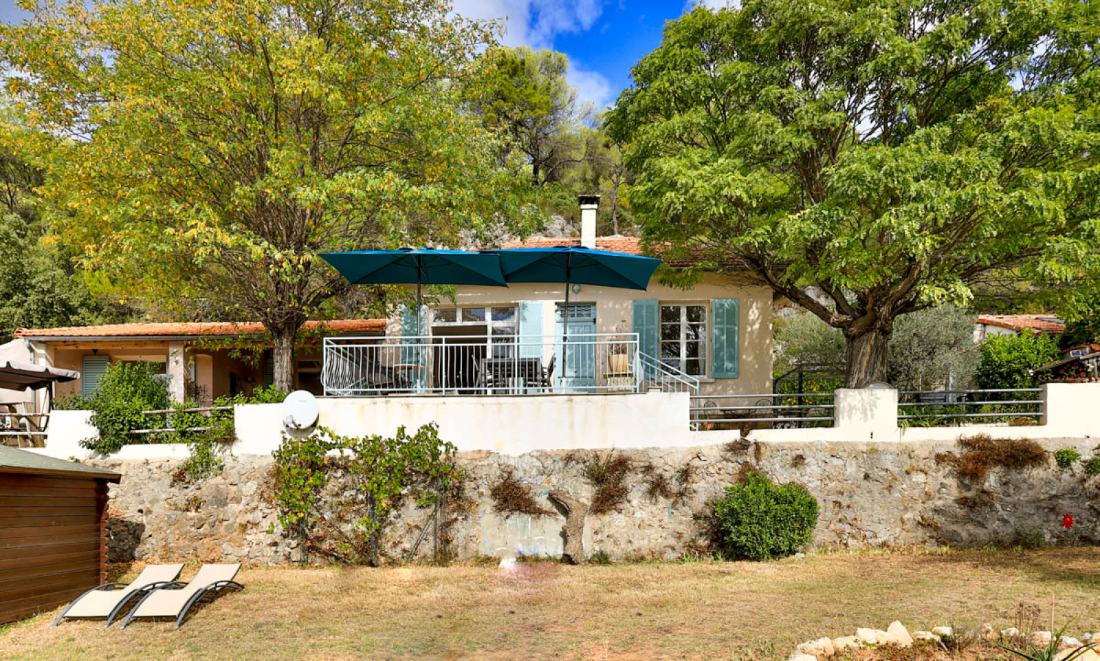La terrasse principale donne sur le jardin avec une orientation au sud. Il y a une belle vue sur les collines environnantes.
