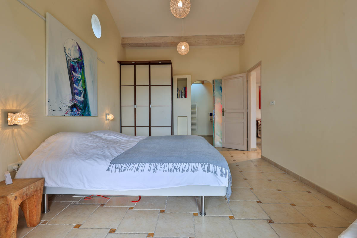La maison comprend deux chambres et deux salles d'eau. La chambre principale dispose d'une salle de bains attenante et de portes-fenetres qui s'ouvrent sur la terrasse extérieure.