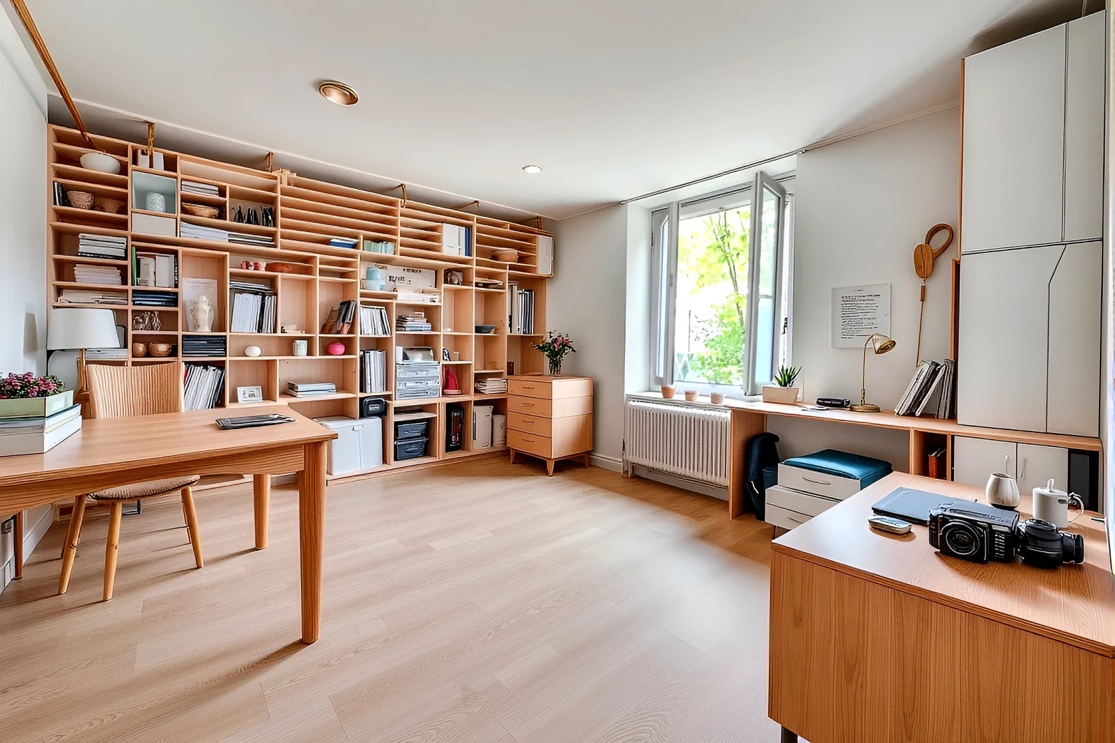 Au rez-de-chaussée, vous découvrirez une chambre, un bureau idéal pour le télétravail ou une pièce polyvalente, un WC indépendant, ainsi qu’un grand garage d’environ 56 m². Ce dernier constitue un véritable atout : stationnement, espace de stockage ou atelier selon vos projets.