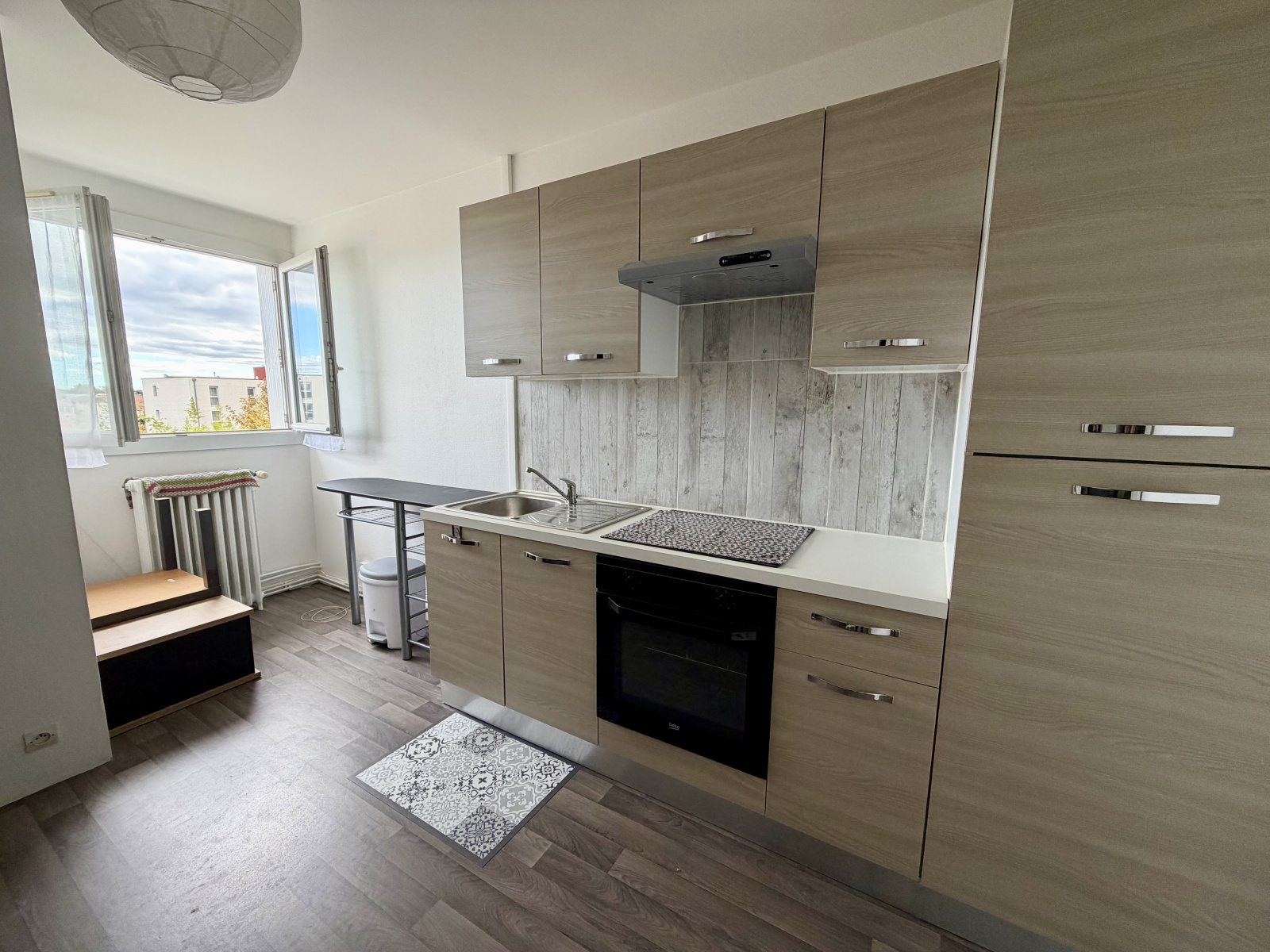 • Cuisine moderne entièrement équipée (plaques induction, four, hotte, réfrigérateur, rangements)
