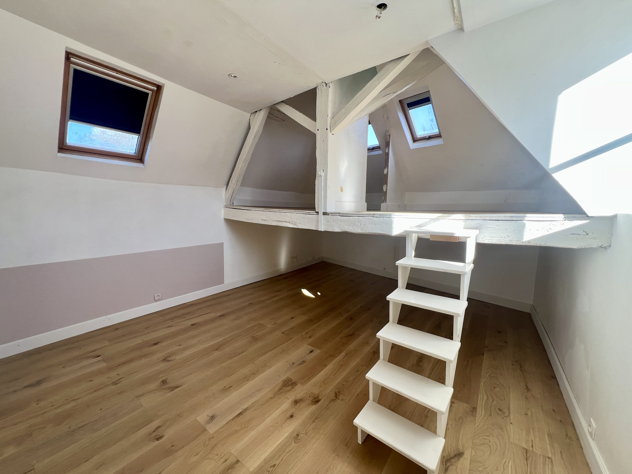 Au deuxième étage : le charme opère avec deux chambres aux poutres apparentes, une salle de bain et un WC indépendant.