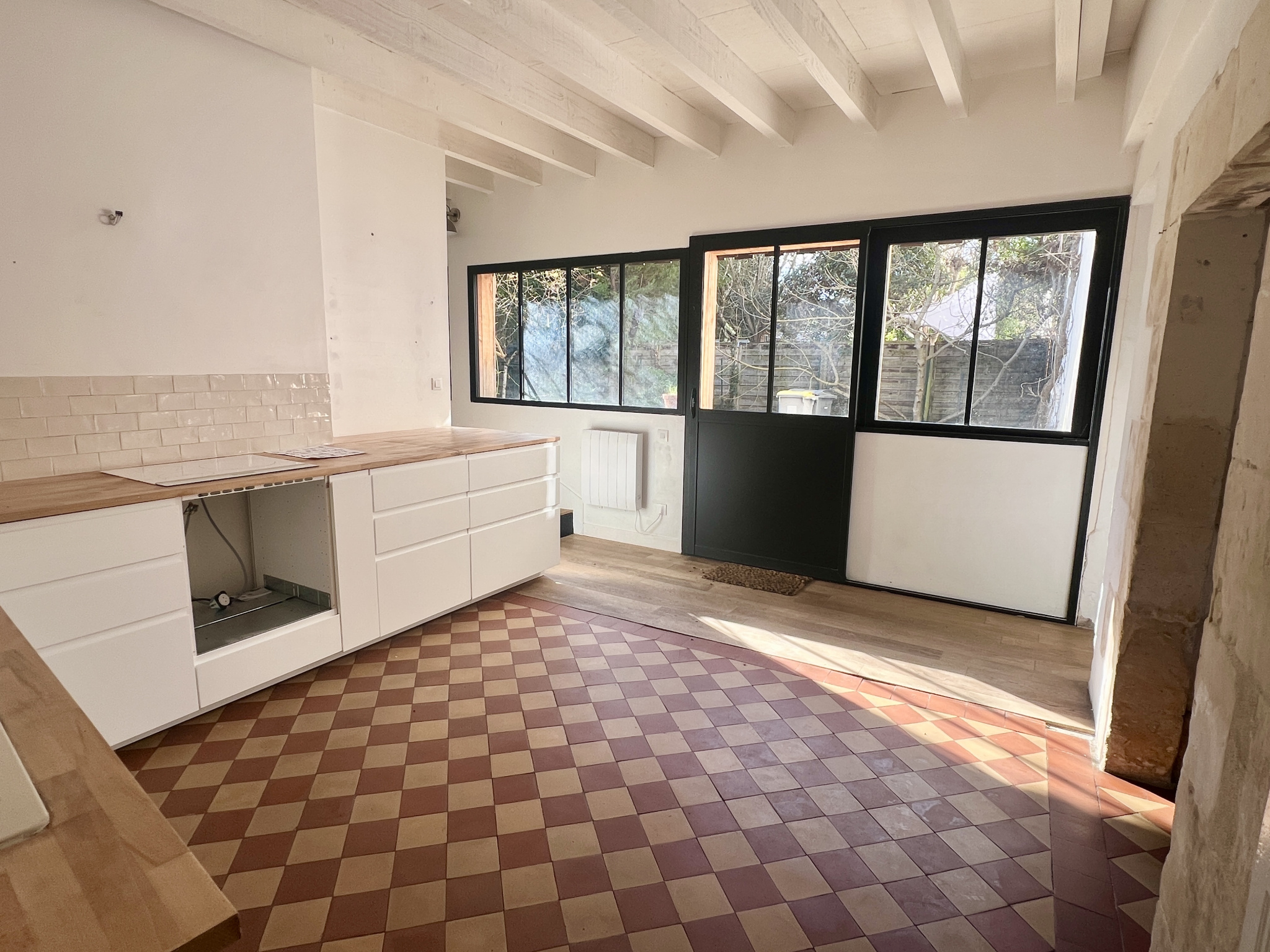Cuisine et lumière : une cuisine aménagée s'ouvre sur le jardin grâce a de superbes verrières, offrant un panorama permanent sur la verdure.