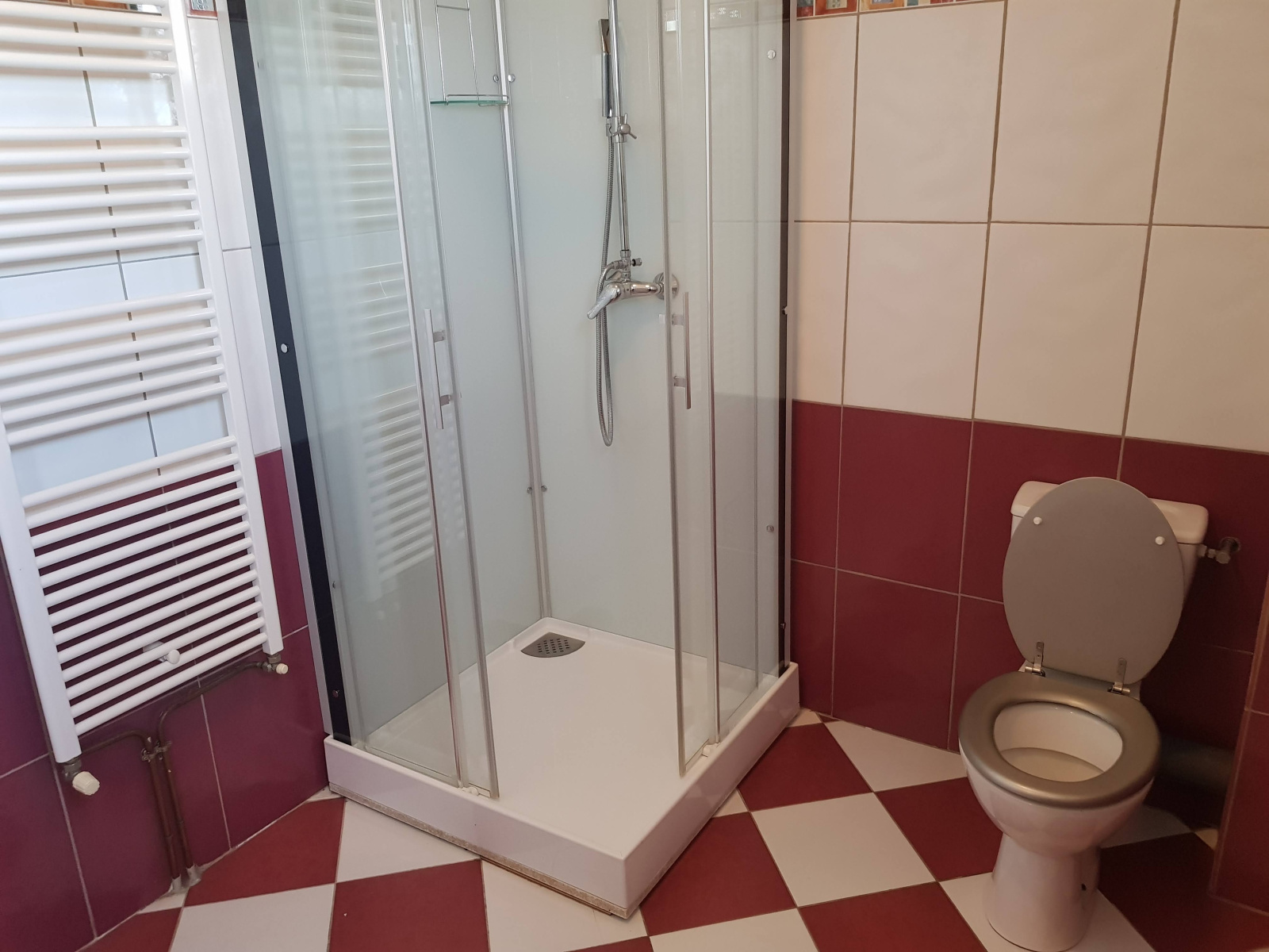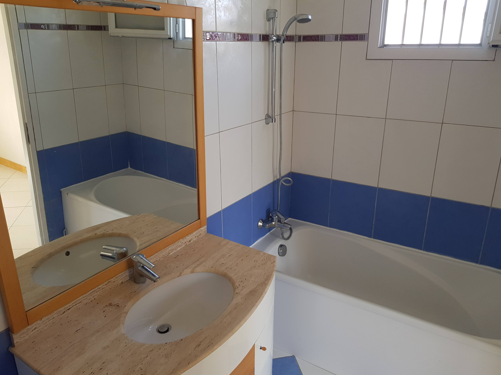 Salle de bains située dans la suite parentale et équipée d'un meuble vasque, d'une baignoire et d'un sèche serviettes