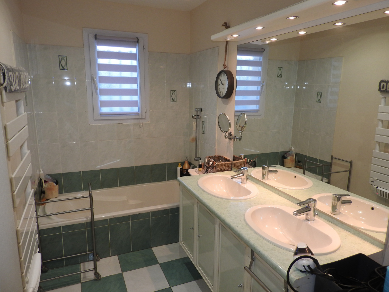 Baignoire, double vasques, sèche serviettes, branchement machine à laver