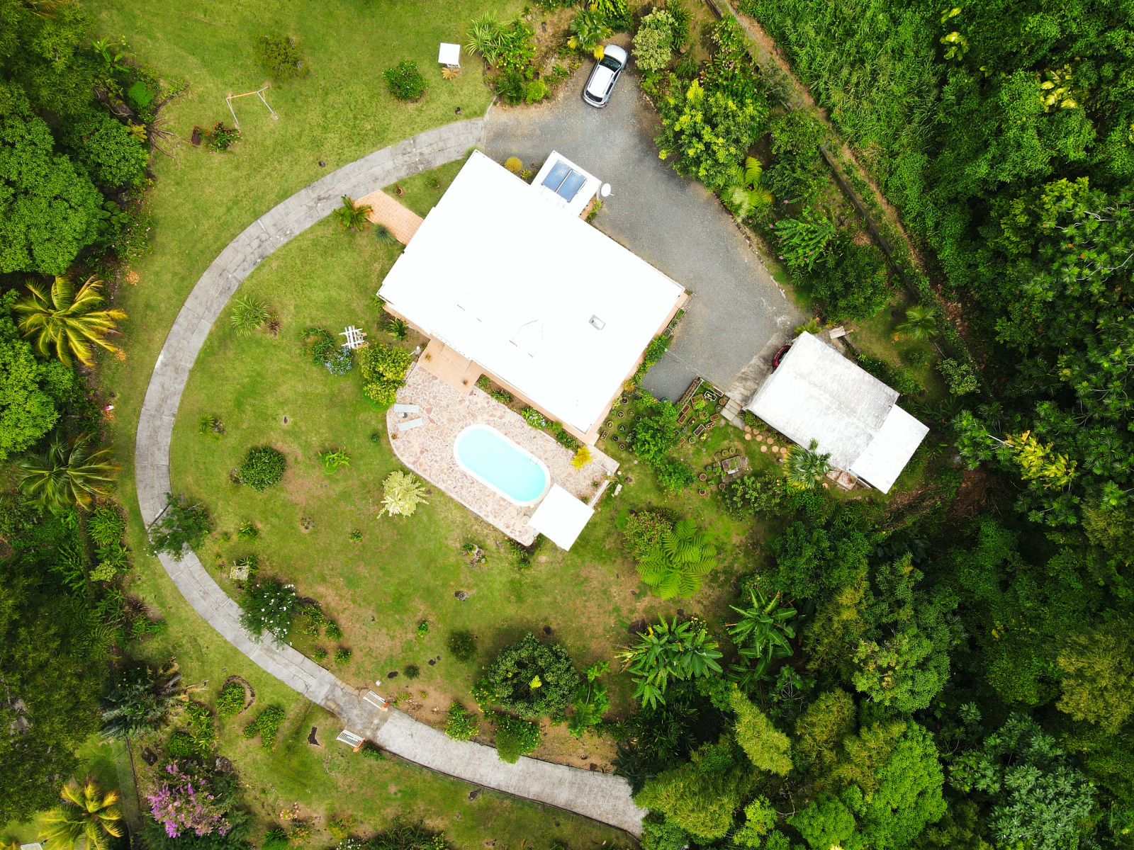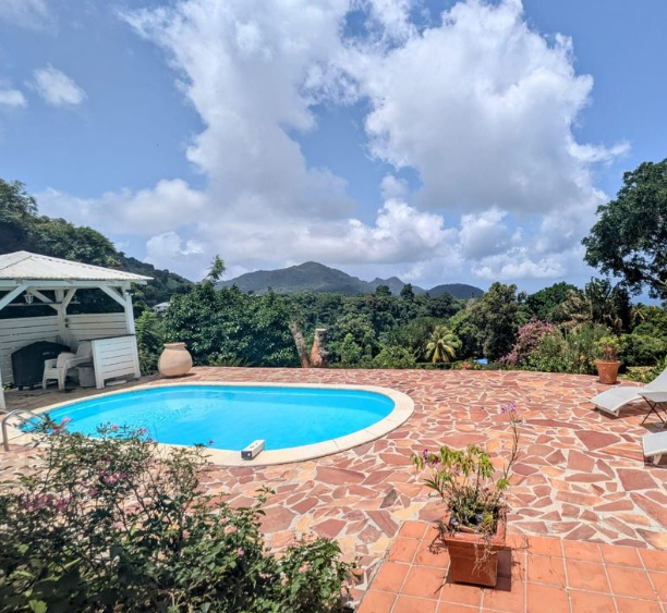 A l’extérieur une piscine avec coin barbecue.