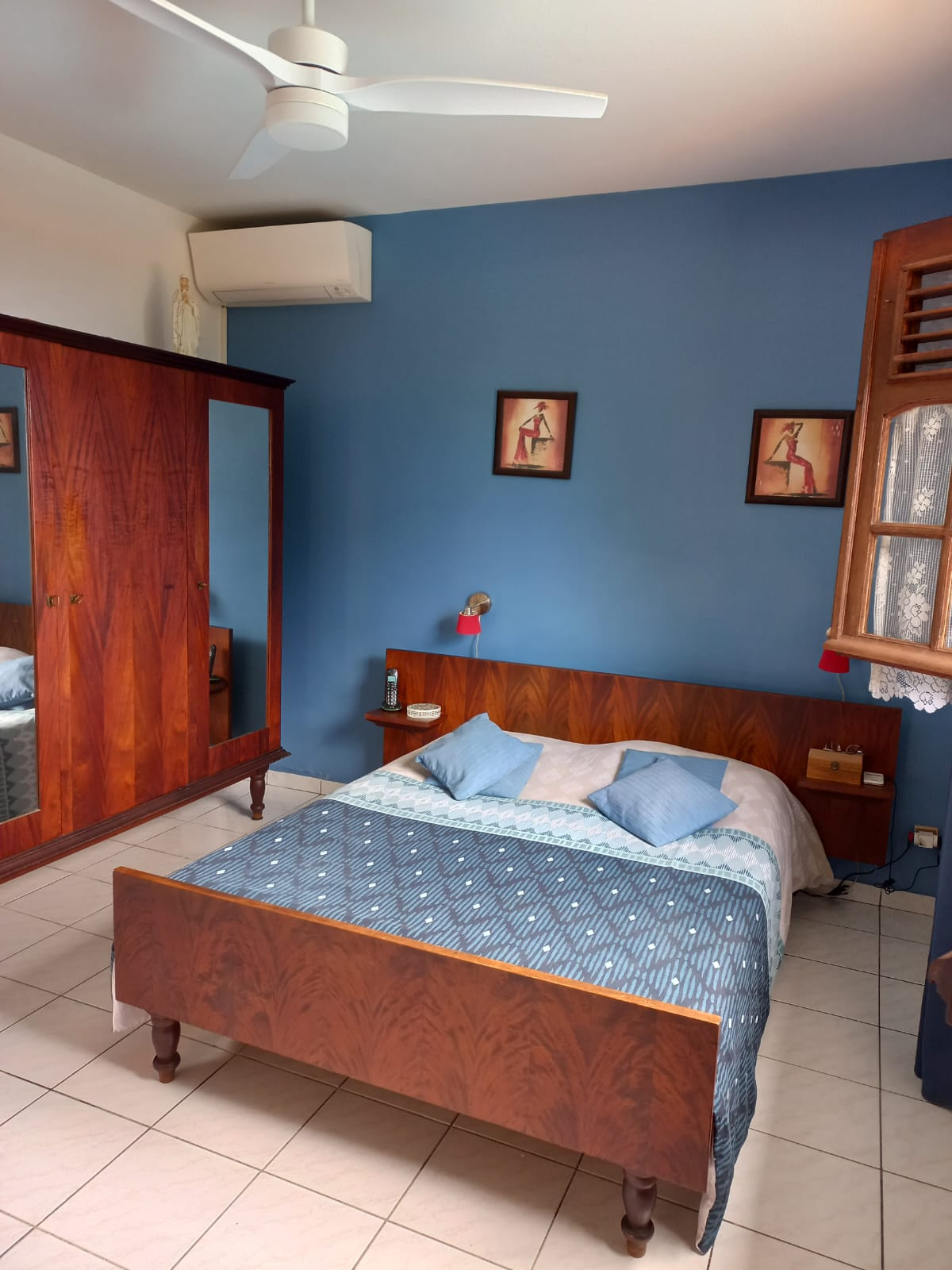 A l’étage une grande pièce avec un coin salle de sport, un coin chambre, un coin bureau et une salle de bain.