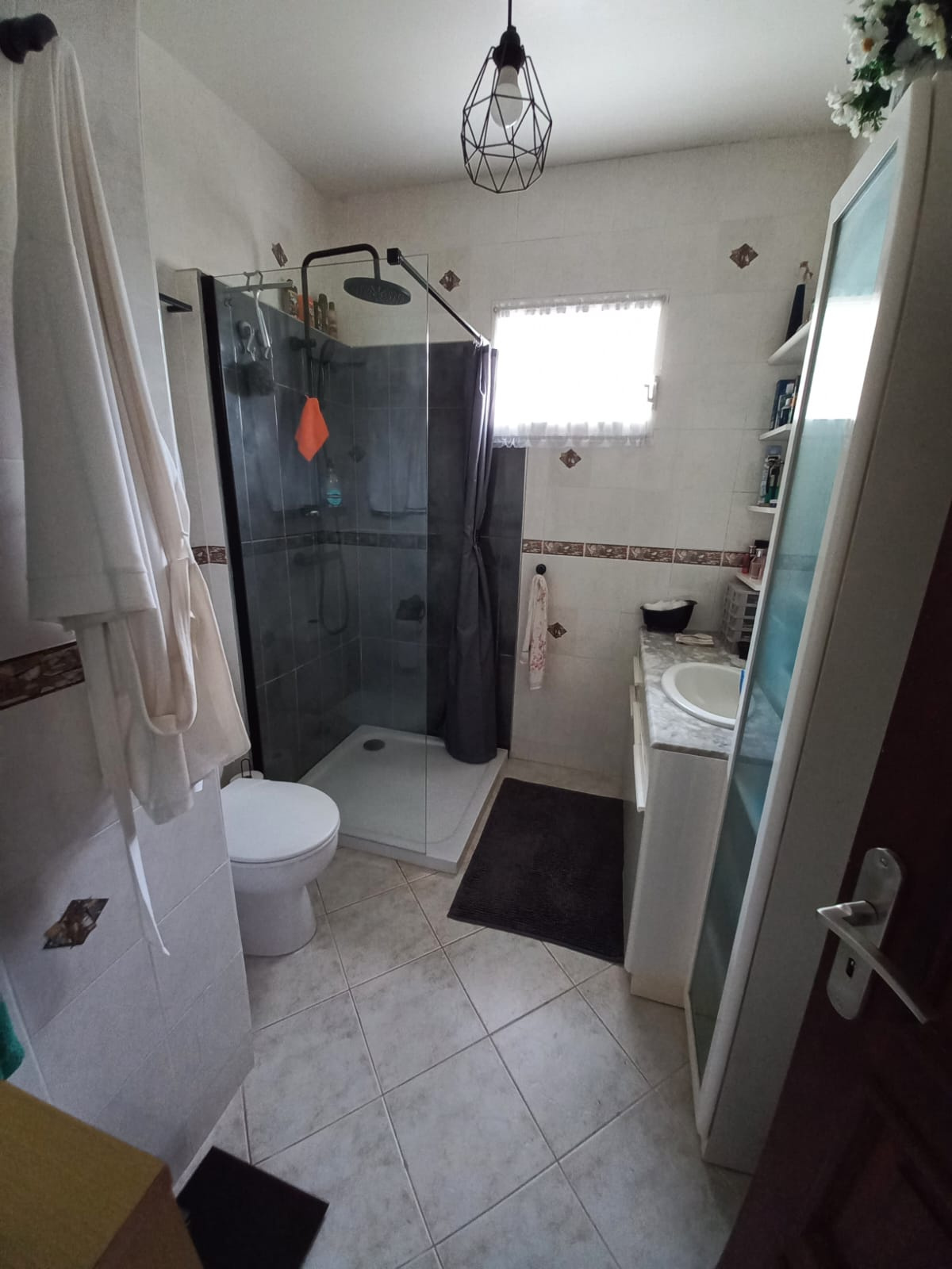 Au rez de chaussée, trois chambres, deux salles d’eau dont une attenante à la chambre parentale, un séjour, une cuisine ouverte sur le séjour, et une terrasse.