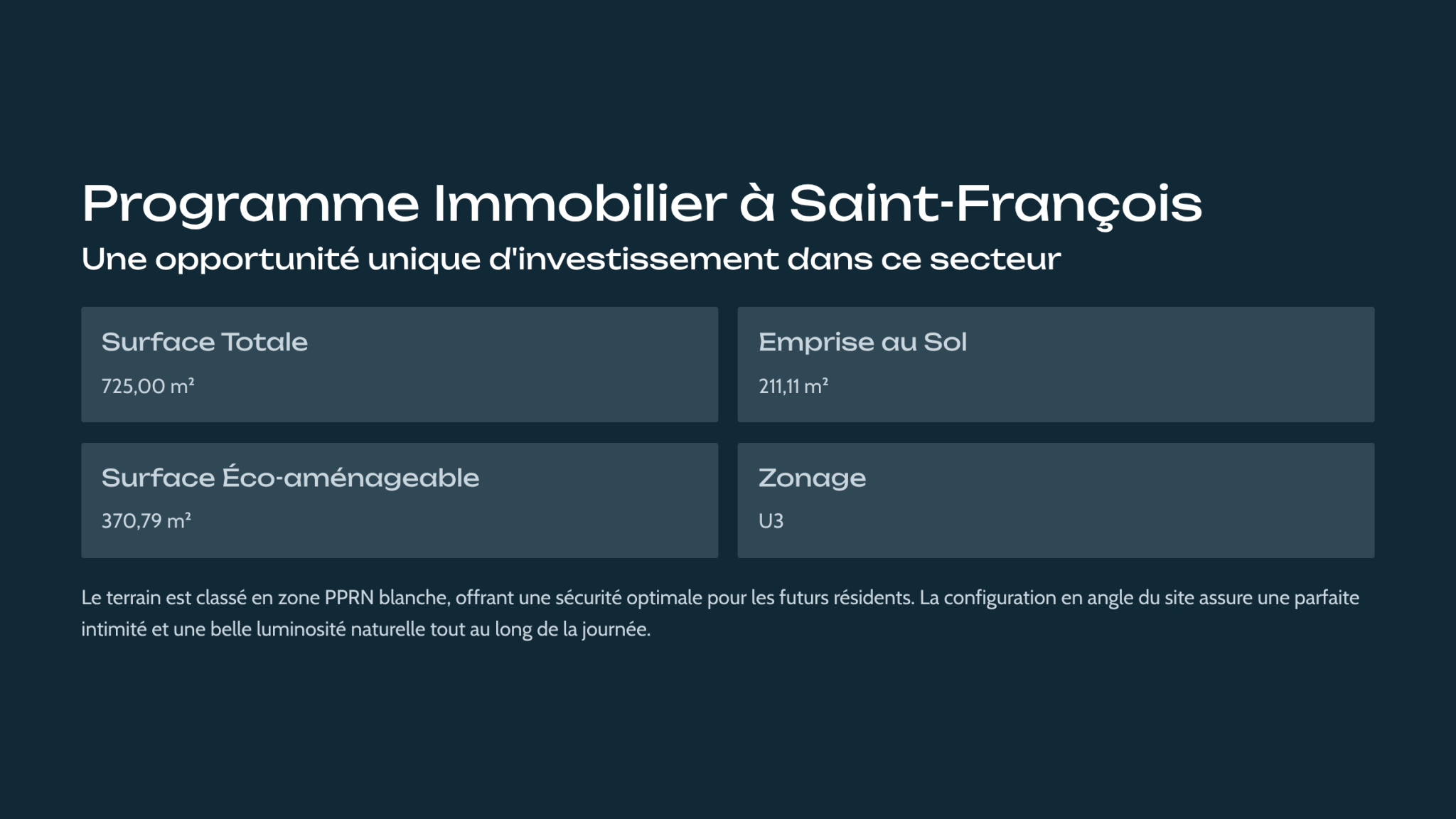 Situé dans le secteur de Pombiray à Saint-François, ce T2 de 39 m² est proposé à la vente au sein d'une petite copropriété composée de seulement trois lots. La copropriété ne présente aucun arriéré et les charges sont annoncées comme légères.