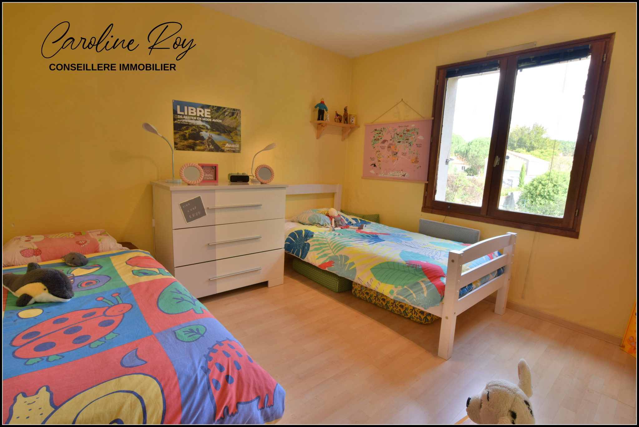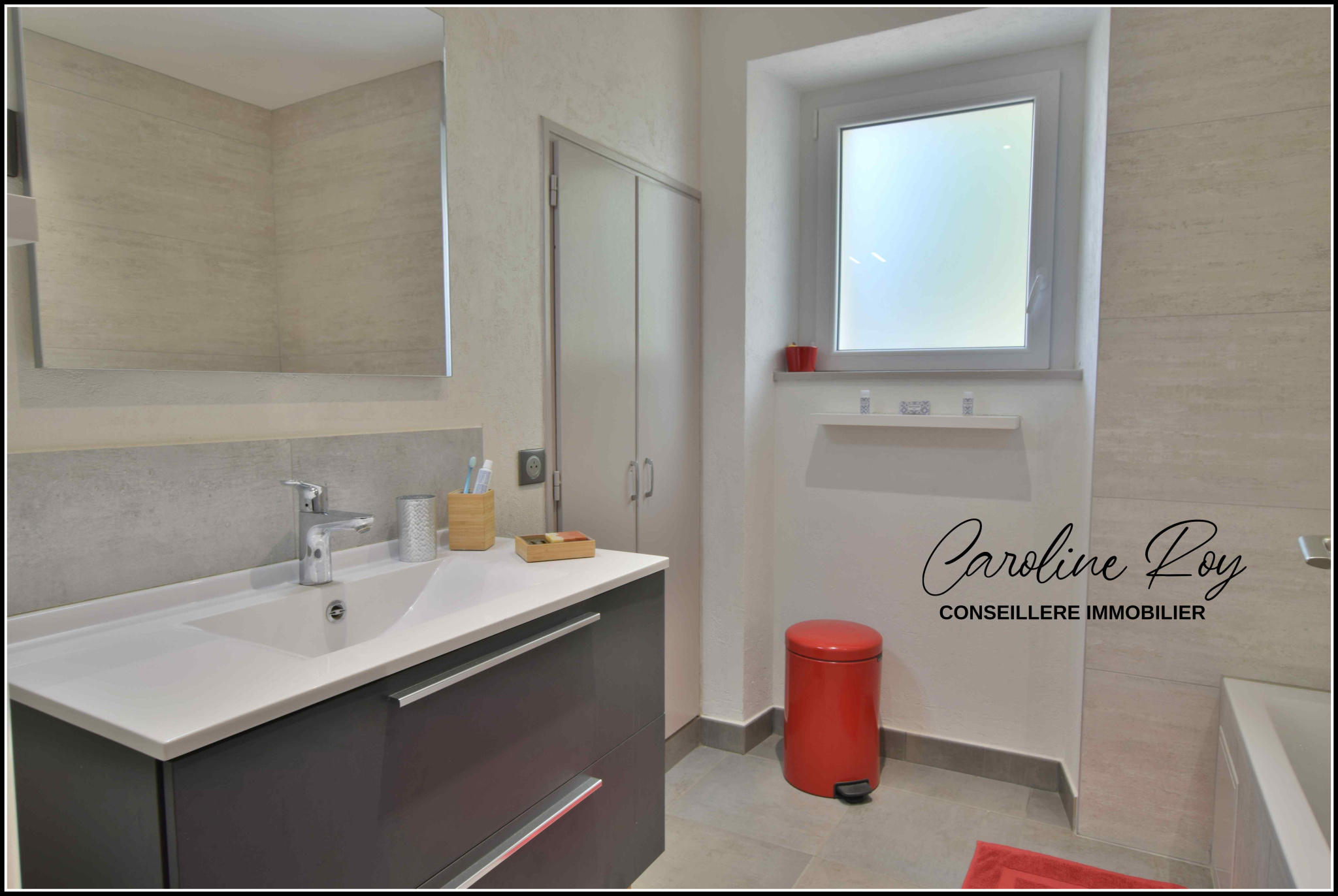 A l’étage le coin nuit dessert 3 spacieuses chambres avec placard (16.40, 14.51 et 10.93 m²), wc suspendu et une salle d’eau.