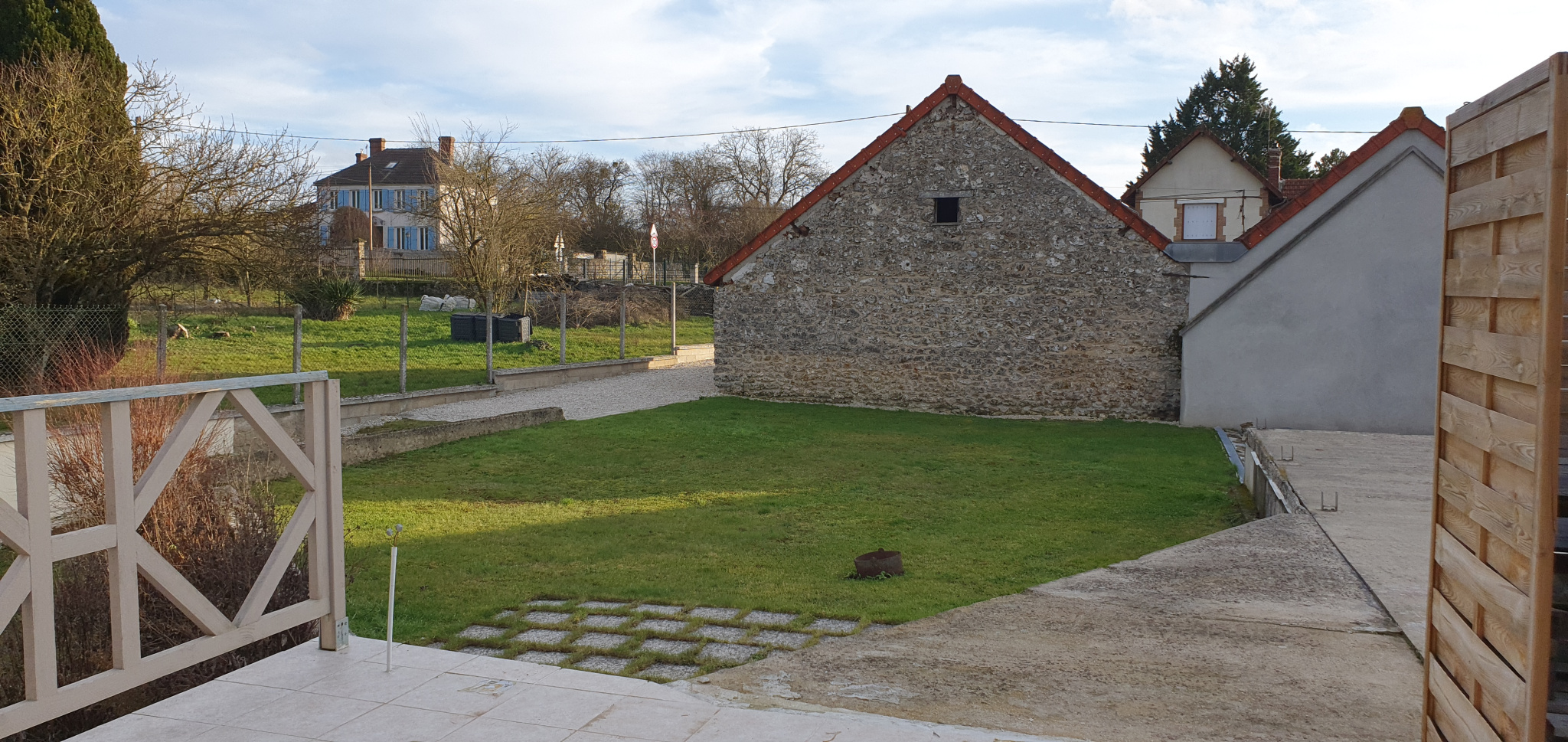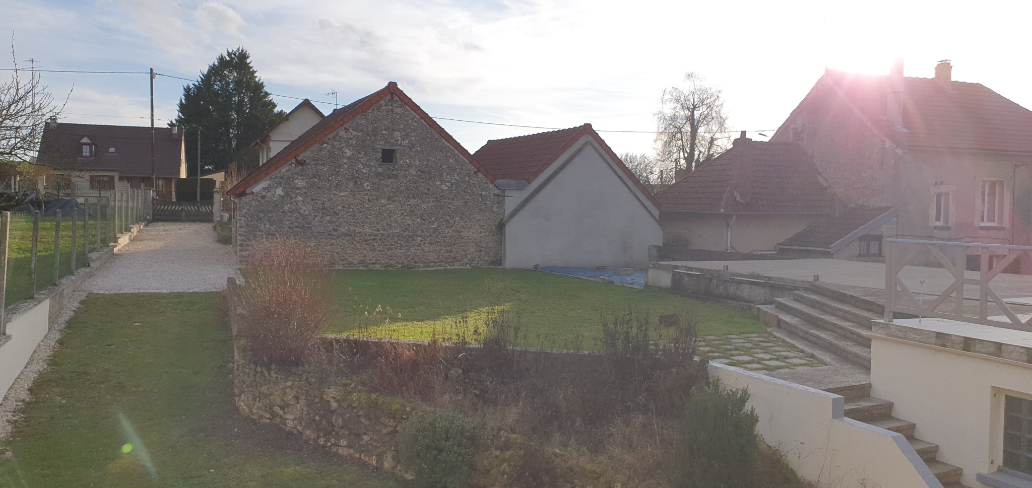 3 garages attenants de 100 m² environ; Cour devant avec parking, Grande terrasse et jardin derrière l'ensemble, avec autre accès à la rue;