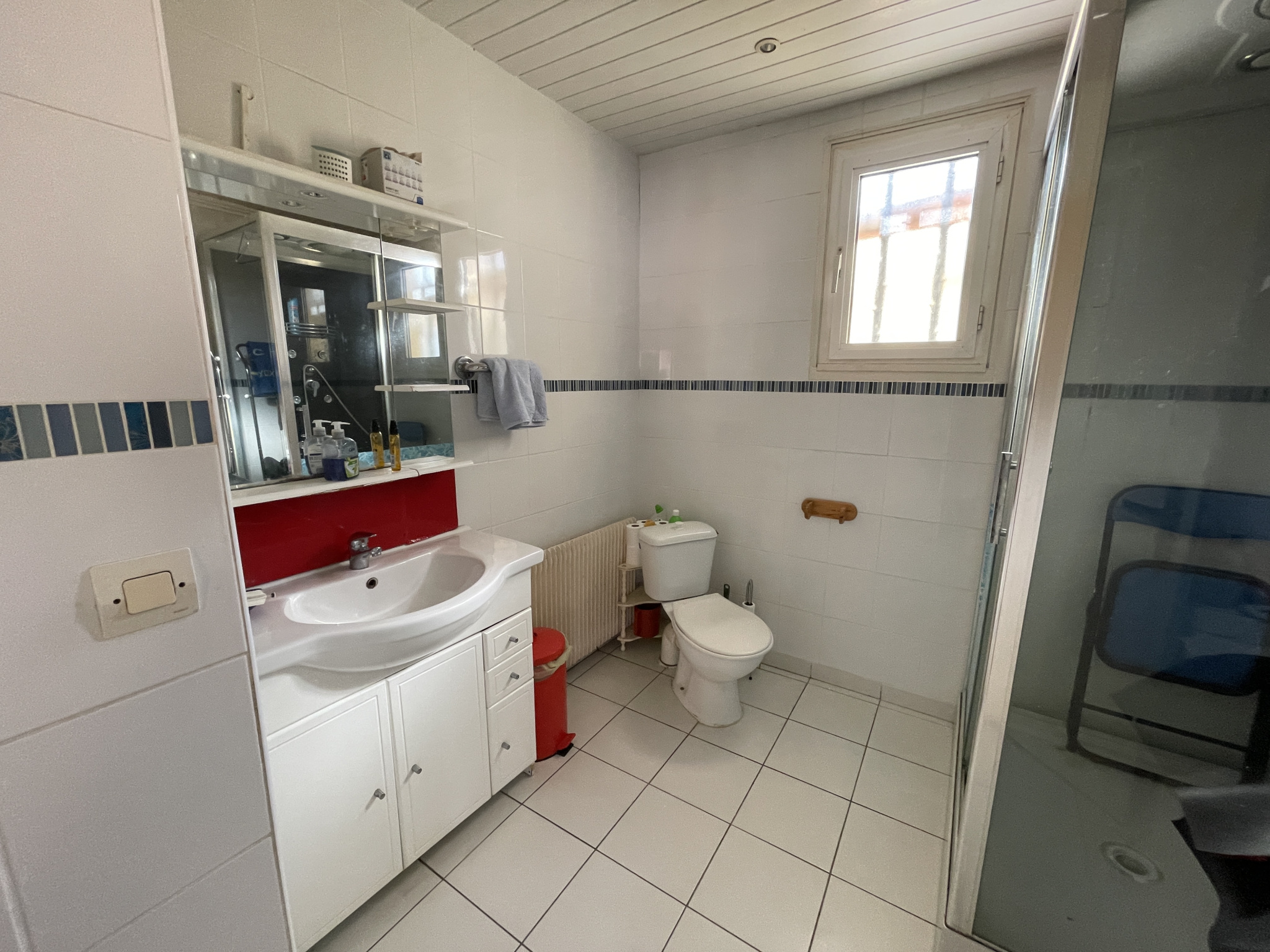 Une salle de bains avec WC ainsi qu’une salle d’eau avec douche