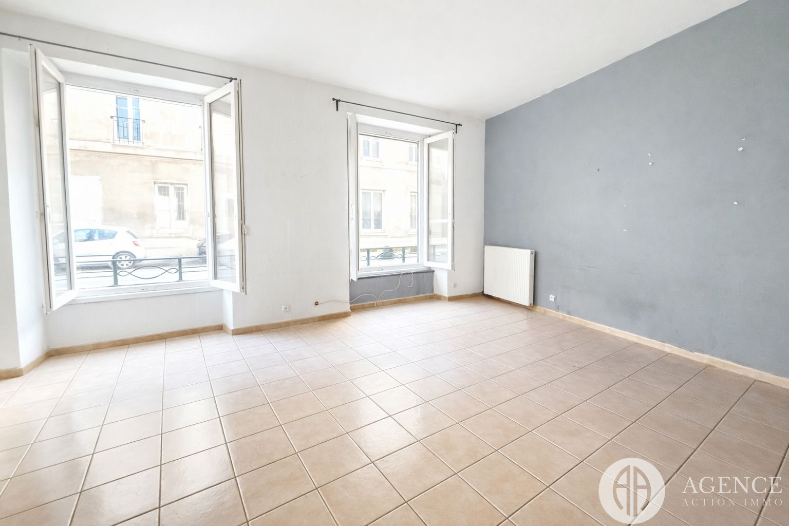 3ème étage – Appartement T2 d’environ 70 m² • Une chambre • Salle de bain + WC • Placards • Chauffage gaz avec radiateurs • Fenêtres PVC • Travaux de rafraîchissement • Libre