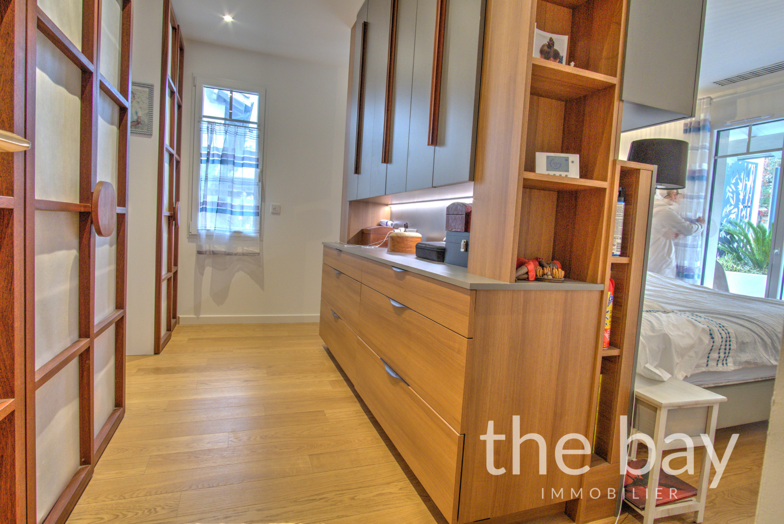 Dès l’entrée, la villa révèle une interprétation élégante de l’esprit arcachonnais, revisitée avec des prestations contemporaines de standing. L’espace d’accueil, doté de rangements intégrés, d’un coin bureau et de toilettes invités, introduit des volumes généreux et parfaitement maîtrisés.