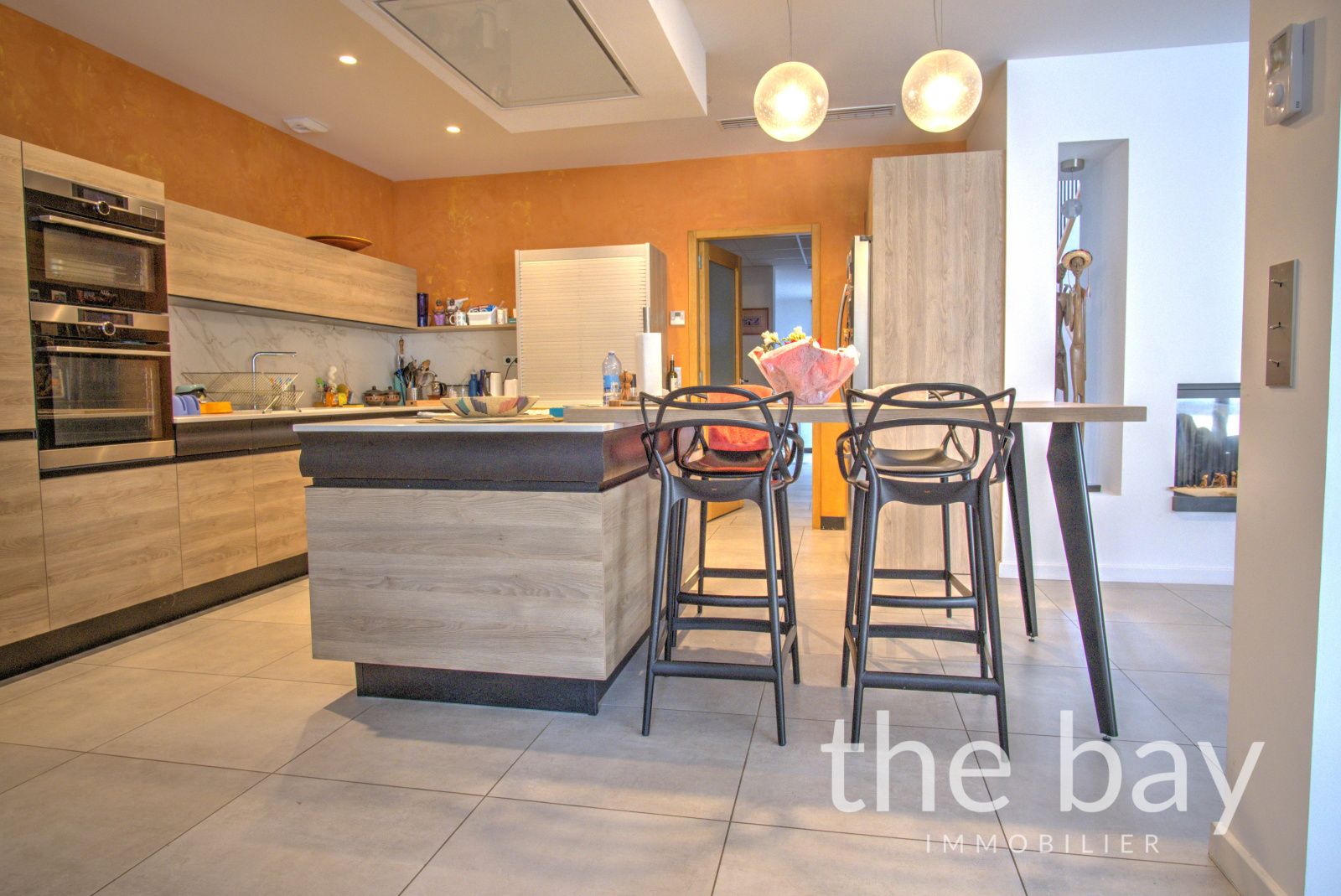 Dans son prolongement, la vaste pièce de vie, baignée de lumière, s’ouvre largement sur les extérieurs et la terrasse grâce à de grandes baies coulissantes, effaçant les frontières entre intérieur et jardin. Le séjour se vit pleinement toute l’année : ambiance chaleureuse autour du foyer en hiver, espaces ouverts et conviviaux dès les beaux jours. La cuisine ouverte, entièrement équipée, se prolonge vers une cuisine d’été, idéale pour les réceptions et les instants informels.