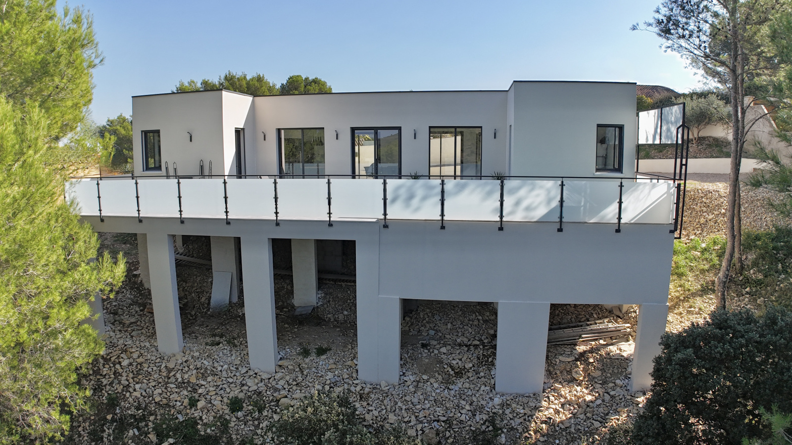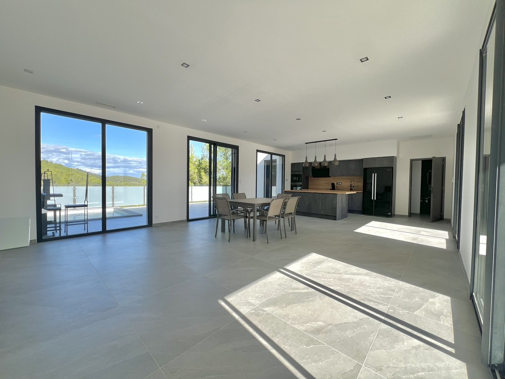 Située dans un quartier résidentiel des Collines de Beaucaire, cette maison contemporaine neuve de plain-pied offre une surface habitable de 128 m² avec terrasse et piscine et bénéficie d'une vue panoramique exceptionnelle. Édifiée sur un terrain de 1 100 m², la maison se compose d'un séjour spacieux de près de 60 m² avec une cuisine équipée et un îlot central. Les nombreuses ouvertures du séjour apportent une belle luminosité tout au long de la journée et permettent de profiter d'une vue dégagée. Elles donnent accès à une terrasse de 56 m² avec piscine. De part et d'autre du séjour, vous trouverez une suite parentale de 35 m² avec salle de bain (douche, baignoire balnéo, WC et dressing) et, de l'autre côté, deux chambres supplémentaires, une salle d'eau partagée, un WC indépendant ainsi qu'un cellier. Le système de chauffage et de climatisation est intégré en gainable, complété par un chauffe-eau thermodynamique pour l'eau chaude sanitaire. La maison est certifiée RT 2012. Habitation entièrement de plain-pied pour une accessibilité optimale. Le vide sanitaire laisse un potentiel pour des extensions ou la création de dépendance, toujours avec une vue magnifique. Le terrain, d'une surface de 1 100 m², pourra être aménagé ou laissé en garrigue selon vos envies. Cette contemporaine en surplomb, domine la nature et permet de bénéficier de vastes espaces avec peu d'entretien. Stationnement possible pour plusieurs véhicules, portail automatique. Un bien atypique luxueux et panoramique.