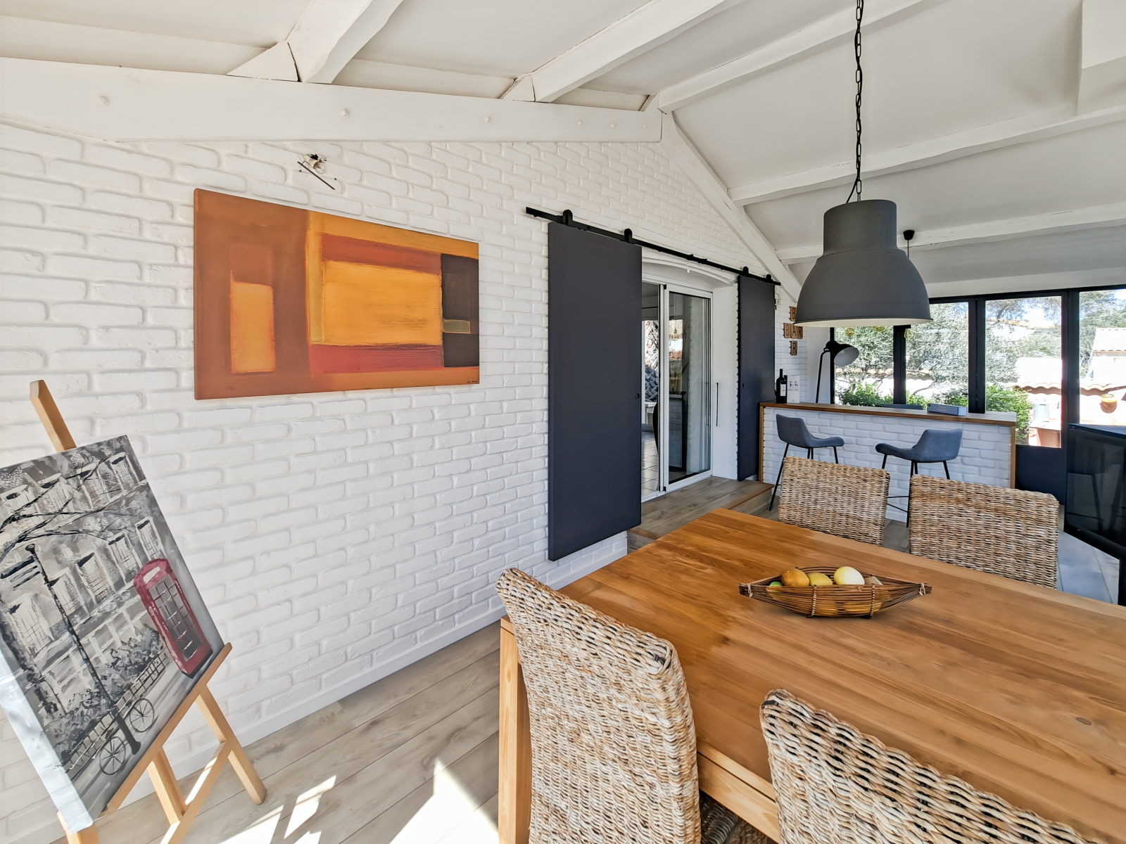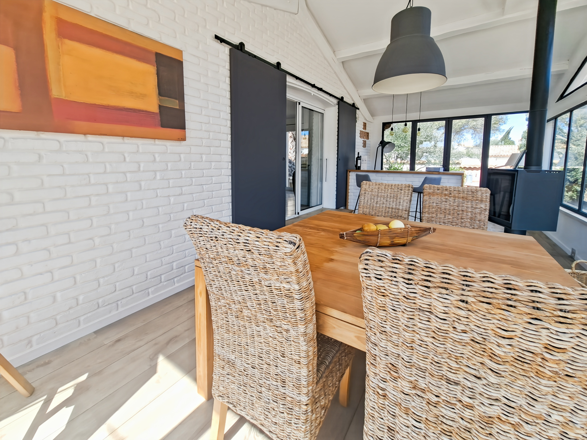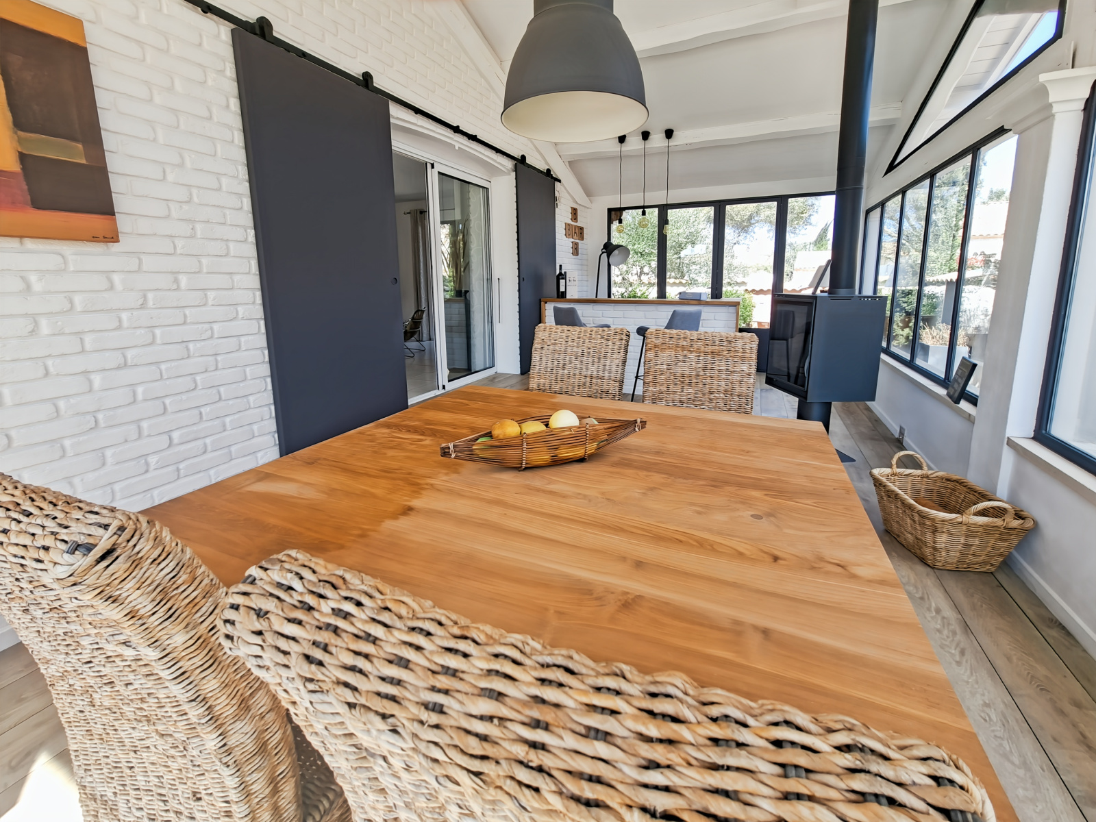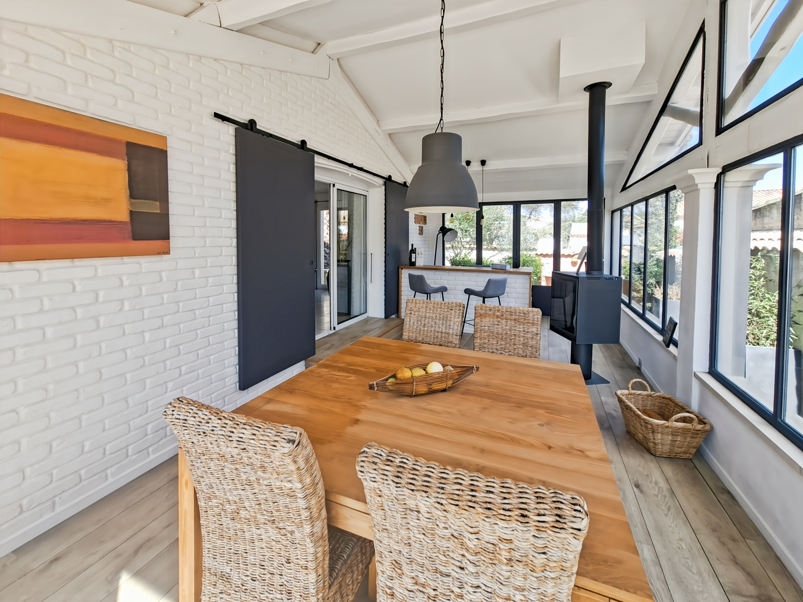 avec son bar et son superbe poêle à bois.