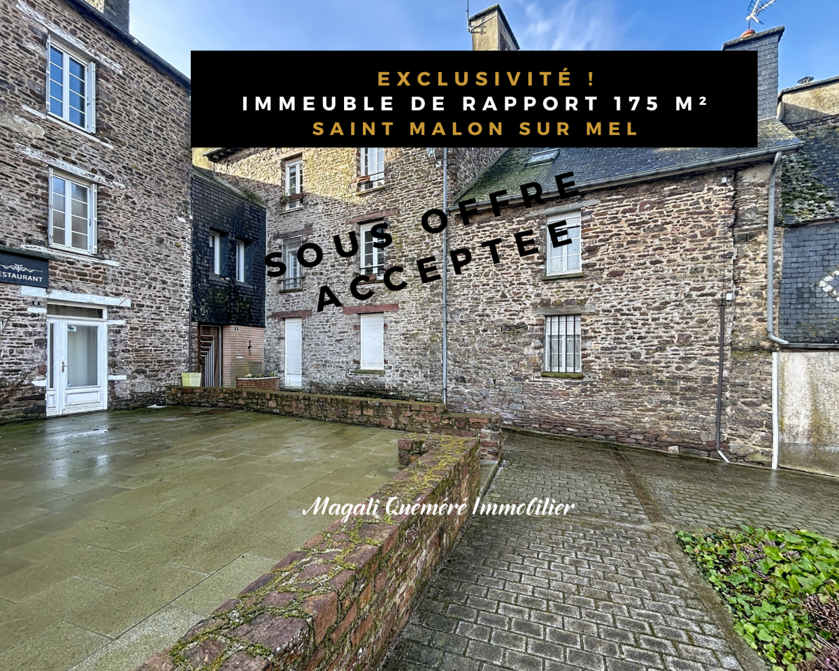 Dans le bourg de Saint Malon sur Mel, maison du début du XIXè en pierres avec toiture en ardoises naturelles, sur un terrain de 175 m² et proposant 3 logements T1 bis , un à chaque étage. Elle est ainsi composée , sur 4 niveaux au total :