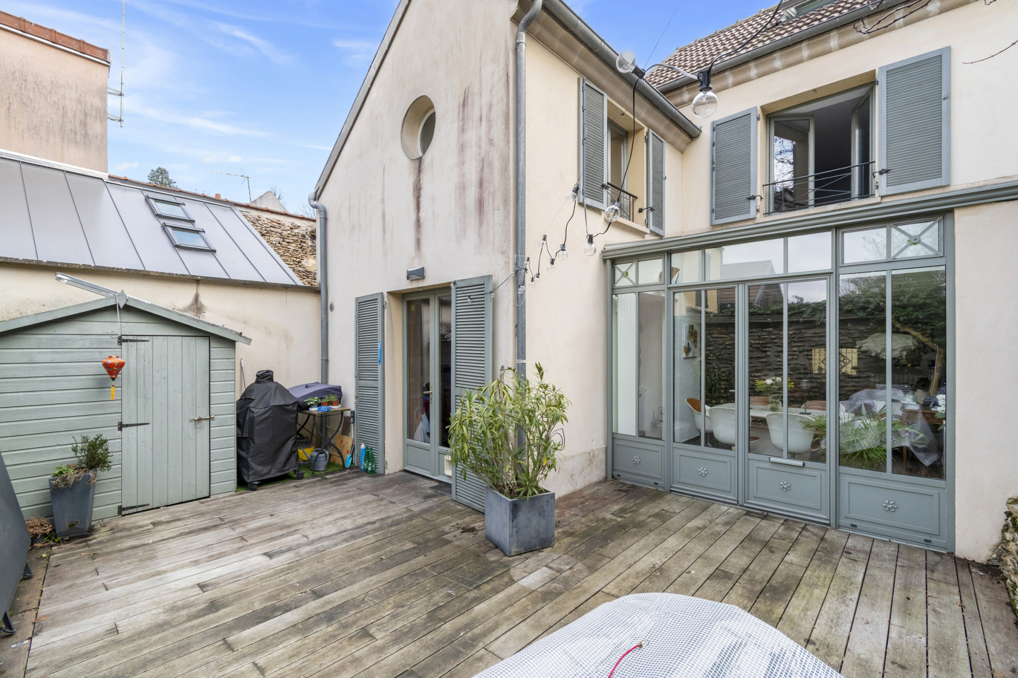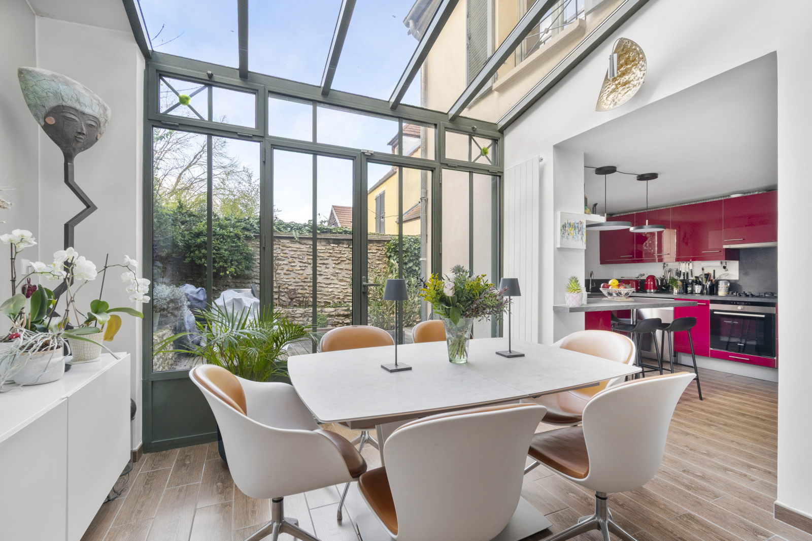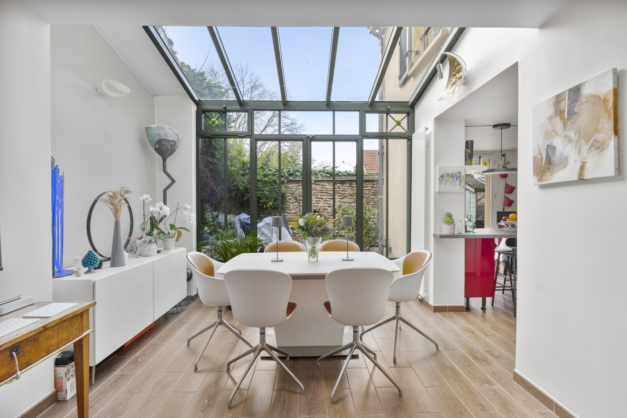 - Un espace salle à manger baigné de lumière, aménagé dans une véranda élégante donnant sur une vaste terrasse en bois d'environ 50 m², véritable extension naturelle de la maison, sans aucun vis-à -vis.